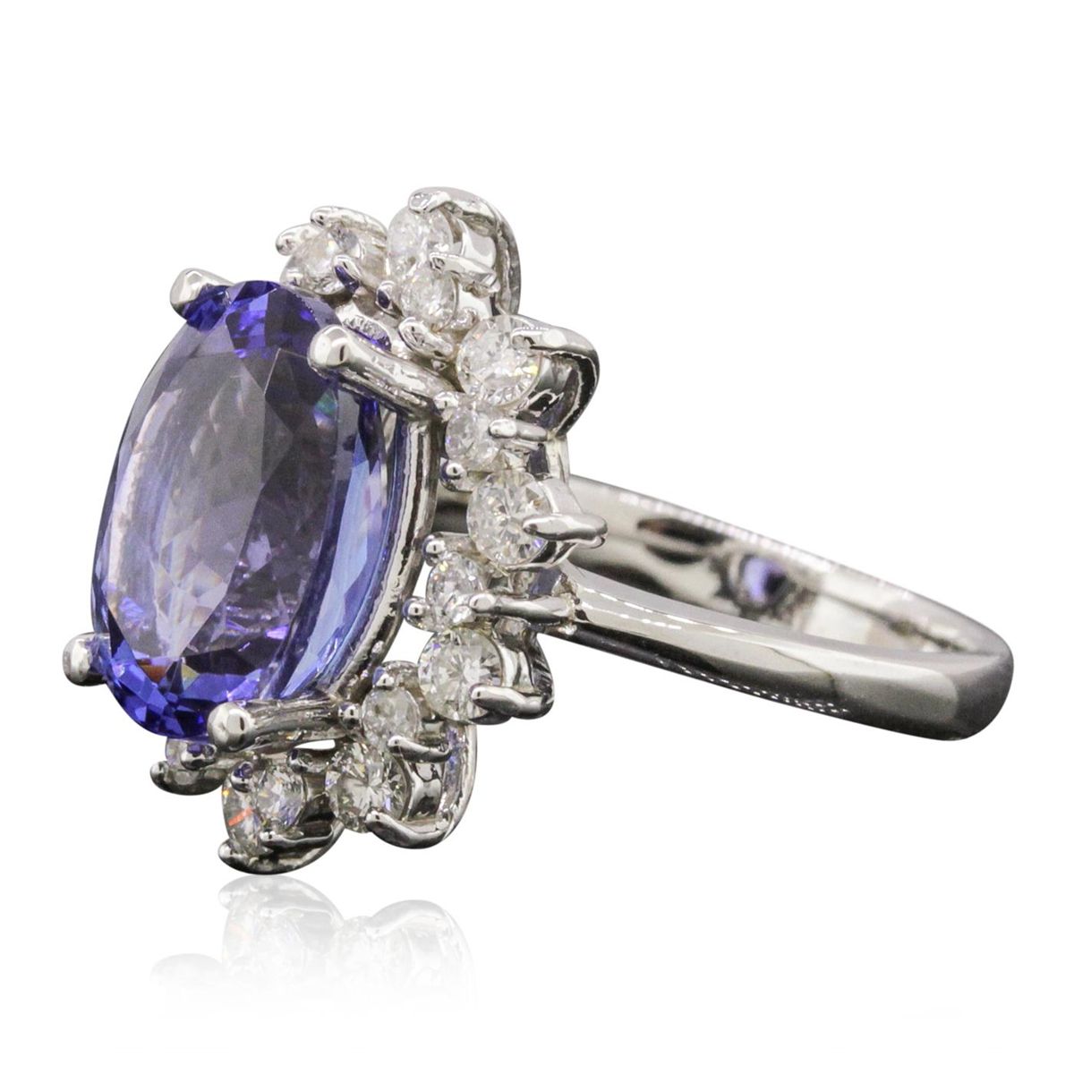 One electronically tested 14KT white gold ladies cast tanzanite and diamond ring with a bright polish finish. Condition is new, good workmanship. The featured tanzanite is set within a diamond bezel, completed by a two and one-half millimeter wide band. Identified with markings of "K14". Containing: One prong set oval brilliant cut natural tanzanite, measuring 11.85 x 8.20 x 6.70mm, 6%. bulge factor, approximate weight of 4.78ct., clarity is eye clean, type I, medium dark, very slightly grayish, bluish violet color, (GIA bV 6/3), cut is good. Transmitting light with no distortion, transparent. Graded in the setting.Tanzanite is a very rare gemstone that is only found in the country of Tanzania. Originally discovered in 1967. Tiffany & Company, named the stone Tanzanite. It is found in the Usumburu Mountains that border the Umba Valley of northern Tanzania. Tanzanite occurs in gray, brown, violet, blue, reddish-purple, & green. The gem is interesting because of its exceptional pleochroism. Rotated in different directions a tanzanite will exhibit multiple changes of color. Tanzanite has a low tolerance to ultrasonic cleaning, and should not be cleaned using this method. Ten prong set round brilliant cut diamonds, measuring 2.40 - 2.30 x 1.41mm (depth est.) approximate. Total Weight of 10 Stones = 0.57ct. Graded in the setting. Clarity: SI-2 to I-1. Color: G - I Ten prong set round brilliant cut diamonds, measuring 1.80 - 1.70 x 1.05mm (depth est.) approximate. Total Weight of 10 Stones = 0.29ct. Graded in the setting. Clarity: SI-2 to I-1. Color: G - I. Total Weight of Colored Stones 4.78ct. Total Weight of Diamonds 0.86ct. Total Weight of Ring 5.63gm. AIG Appraised at $15,410.00.