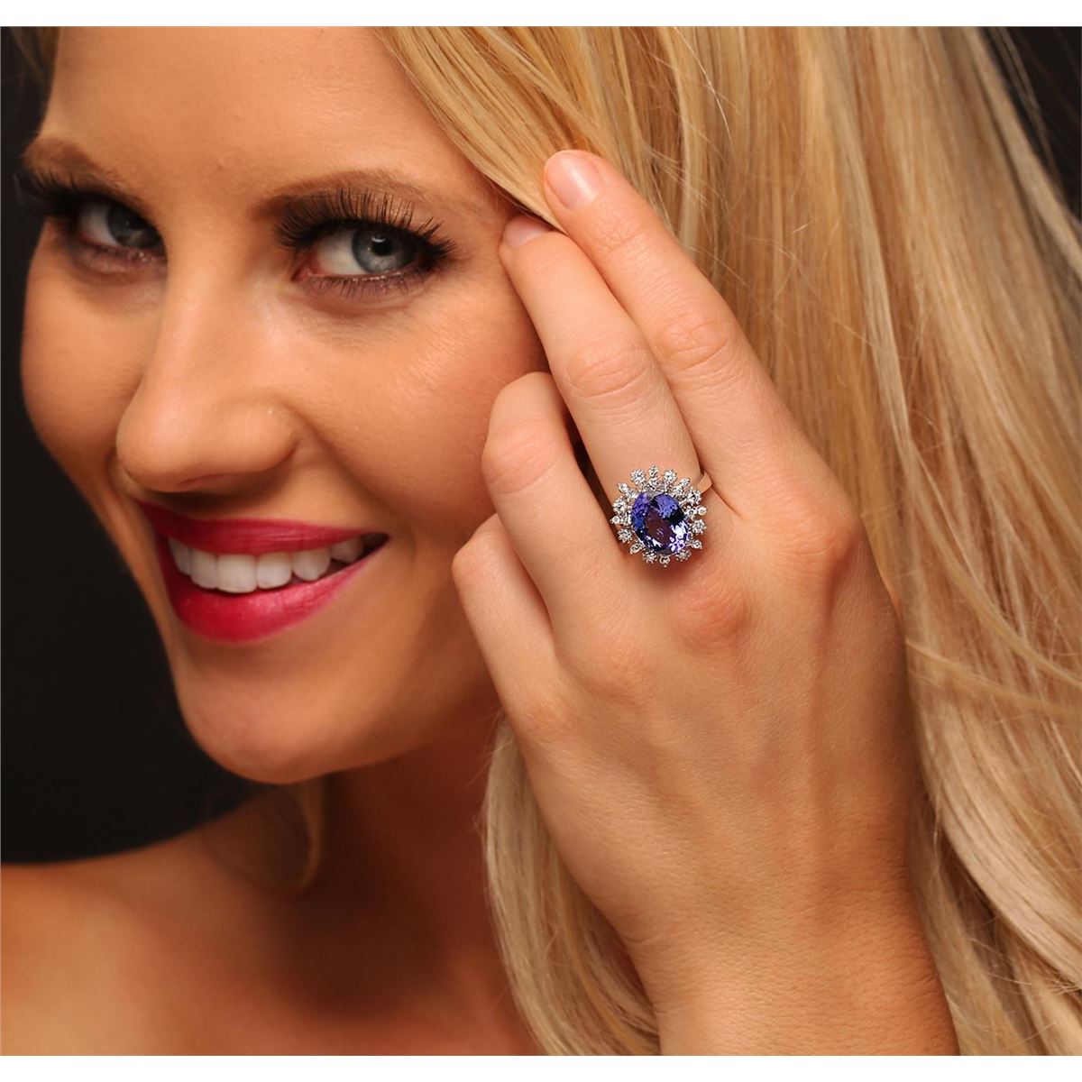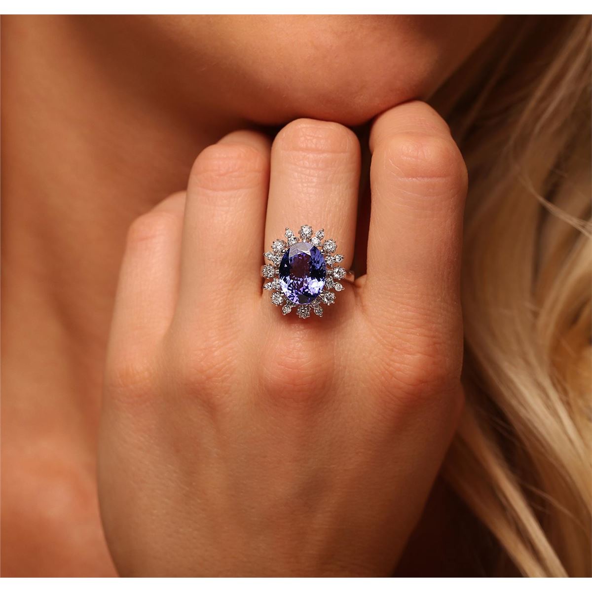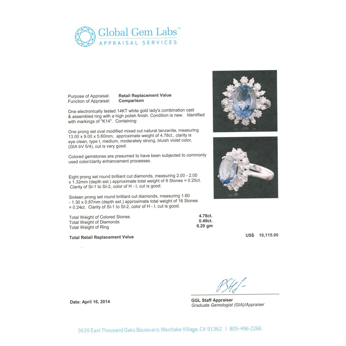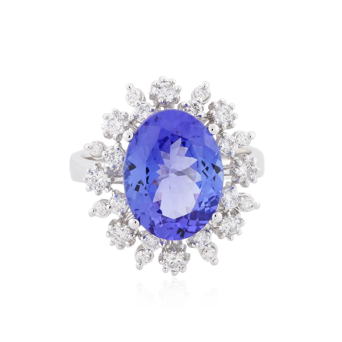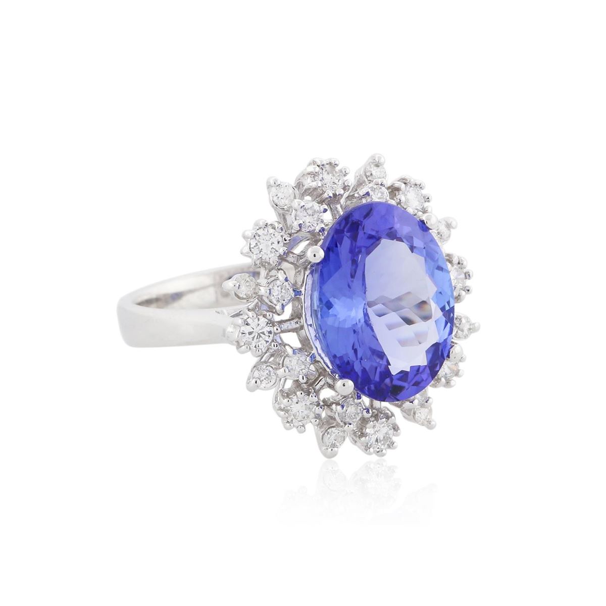 One electronically tested 14KT white gold Ladies combination cast & assembled ring with a high polish finish. Condition is new. Identified with markings of "K14". Containing: One prong set oval modified mixed cut natural tanzanite, measuring 13.00 x 9.00 x 5.60mm, approximate weight of 4.78ct., clarity is eye clean, type I, medium, moderately strong, bluish violet color, (GIA bV 5/4), cut is very good. Colored gemstones are presumed to have been subjected to commonly used color/clarity enhancement processes. Eight prong set round brilliant cut diamonds, measuring 2.00 - 2.00 x 1.32mm (depth est.) approximate. Total Weight of 8 Stones = 0.25ct. Clarity: SI-1 to SI-2. Color: H - I, Cut is Good. Sixteen prong set round brilliant cut diamonds, measuring 1.60 - 1.30 x 0.87mm (depth est.) approximate. Total Weight of 16 Stones = 0.24ct. Clarity: SI-1 to SI-2. Color: H - I, Cut is Good. Total Weight of Colored Stones 4.78ct. Total Weight of Diamonds 0.49ct. Total Weight of Ring 6.20 grams. GGL Appraised at $10,115.00.