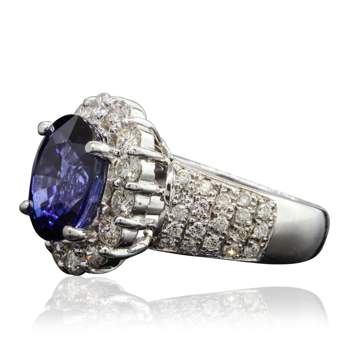 One electronically tested 14KT White Gold ladies cast sapphire and diamond ring with a bright polish finish. Condition is new, good workmanship. The featured sapphire is set within a diamond bezel supported by tapering diamond set shoulders, completed by a three and one-half millimeter wide band. Identified with markings of "K14". Containing: One prong set oval mixed cut natural blue sapphire, measuring 10.08 x 8.90 x 6.05mm, 10%. bulge factor, approximate weight of 4.79ct., clarity is eye clean, type II, dark, moderately strong, blue color, (GIA B 7/4), cut is good. Transmitting light with no distortion, transparent. Indications of laboratory high temperature diffusion treatment. Graded in the setting. Fourteen prong set round brilliant cut diamonds, measuring 2.60 - 2.50 x 1.53mm (depth est.) approximate. Total Weight of 14 Stones = 0.95ct. Graded in the setting. Clarity: SI-2 to I-1. Color: H - J Thirty-Eight bead set round brilliant cut diamonds, measuring 1.30 - 1.20 x 0.75mm (depth est.) approximate. Total Weight of 38 Stones = 0.37ct. Graded in the setting. Clarity: SI-1 to I-1. Color: H - J. Total Weight of Colored Stones 4.79ct. Total Weight of Diamonds 1.32ct. Total Weight of Ring 8.52 grams. AIG Appraised at $6,985.00.