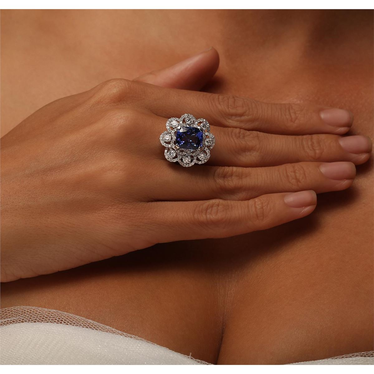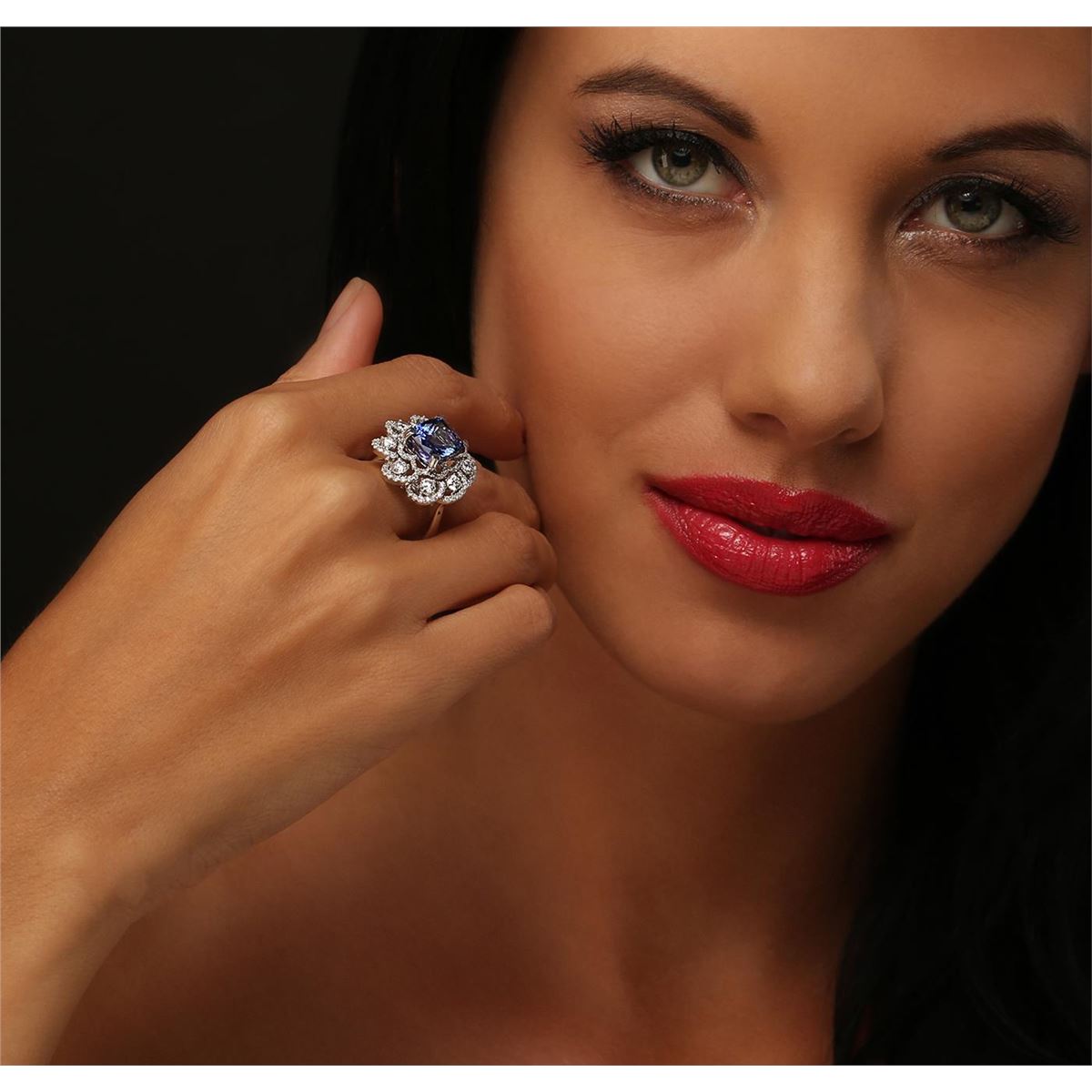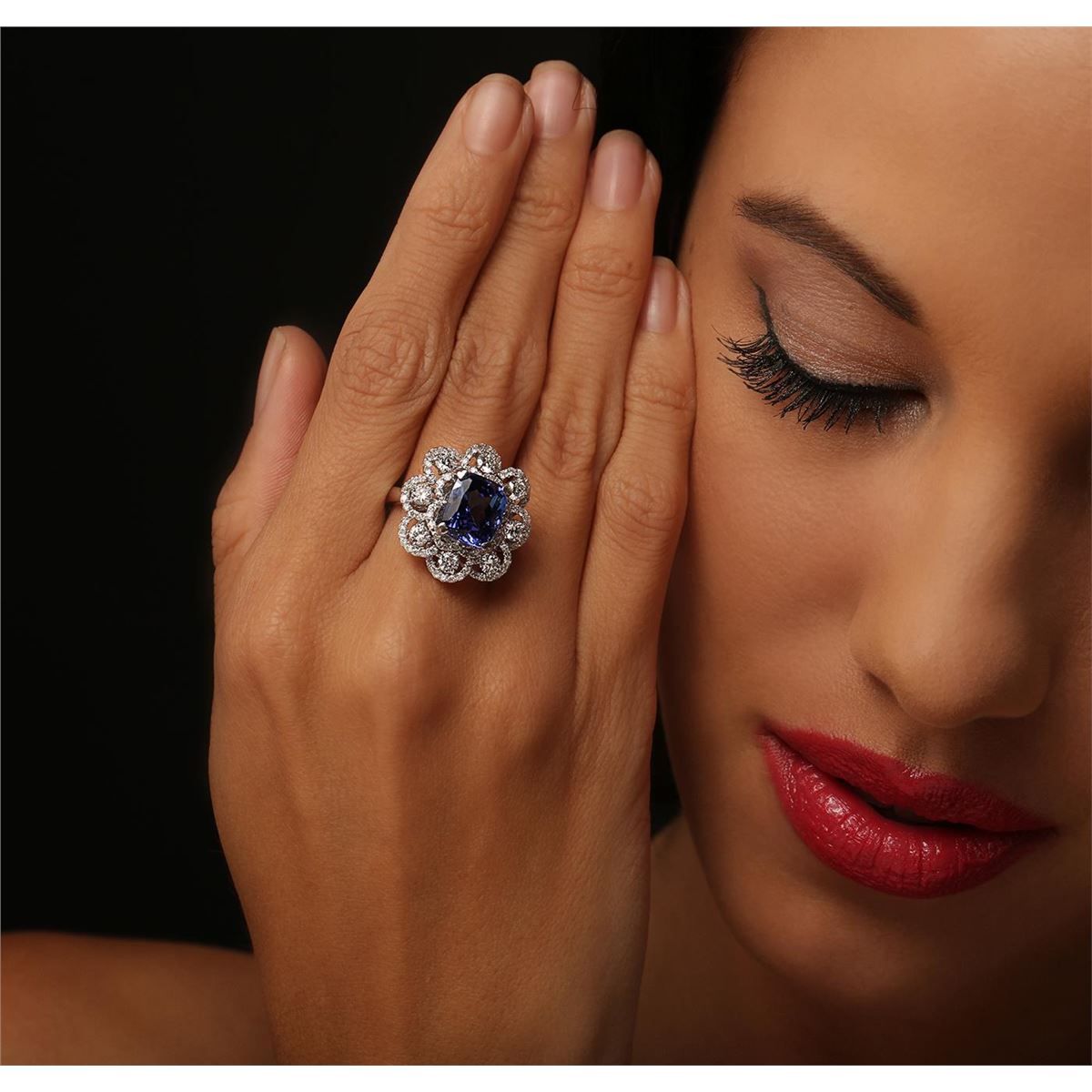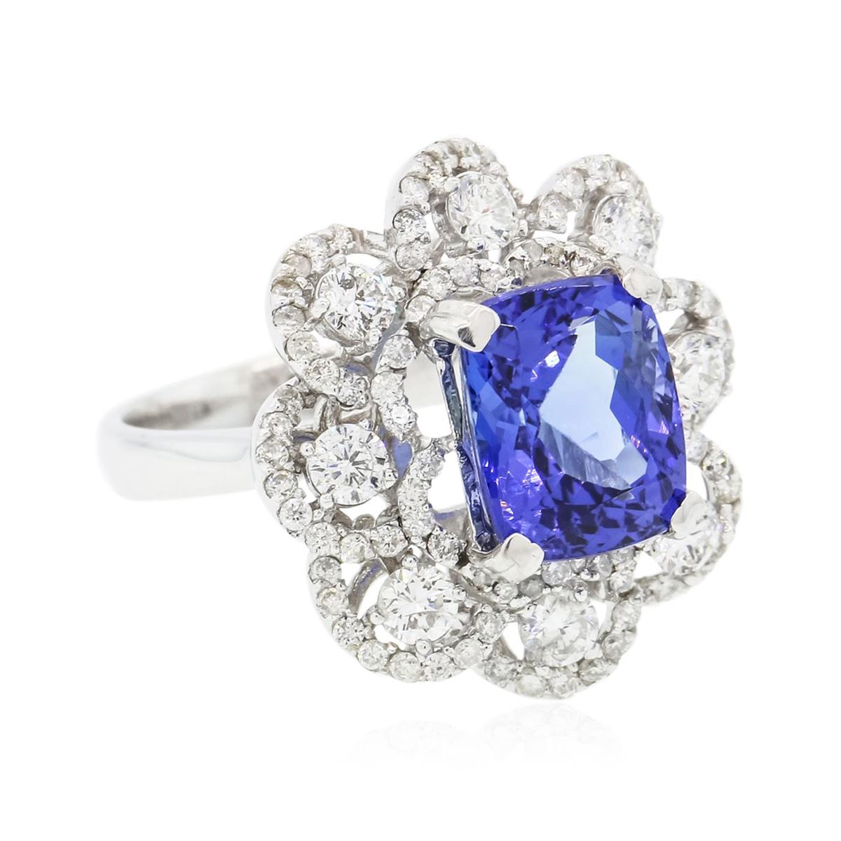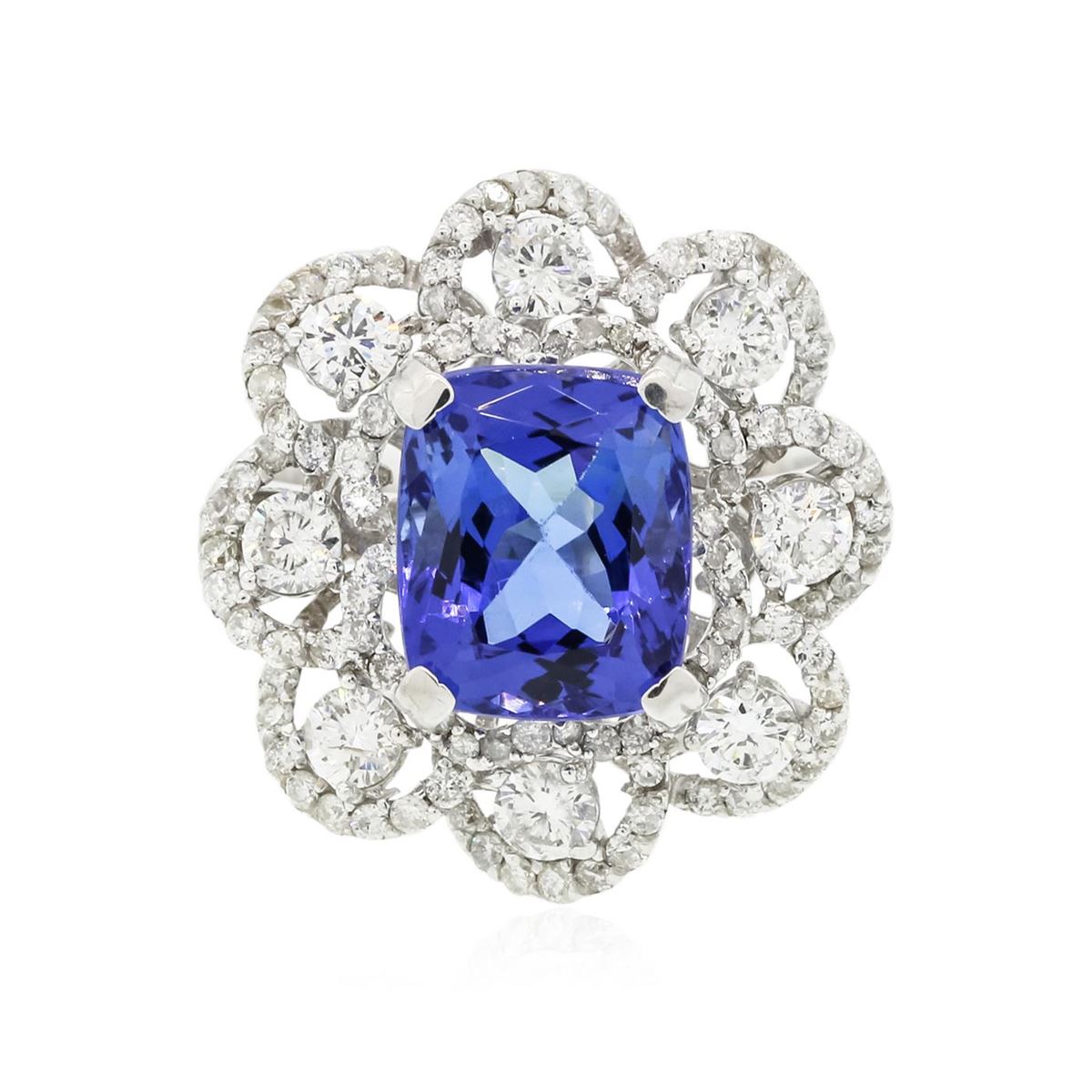 One electronically tested 14KT white gold ladies cast tanzanite and diamond ring with a bright polish finish. Condition is new, good workmanship. The featured tanzanite is set within a diamond lattice gallery, completed by a three and one-half millimeter wide band. Identified with markings of "K14". Containing: One prong set rectangular cushion mixed cut natural tanzanite, measuring 10.40 x 8.50 x 6.50mm, 6%. bulge factor, approximate weight of 4.79ct., clarity is eye clean, type I, medium dark, very slightly grayish, violetish blue color, (GIA vB 6/3), cut is good. Transmitting light with no distortion, transparent. Graded in the setting. Tanzanite is a very rare gemstone that is only found in the country of Tanzania. Originally discovered in 1967. Tiffany & Company, named the stone Tanzanite. It is found in the Usumburu Mountains that border the Umba Valley of northern Tanzania. Tanzanite occurs in gray, brown, violet, blue, reddish-purple, & green. The gem is interesting because of its exceptional pleochroism. Rotated in different directions a tanzanite will exhibit multiple changes of color. Tanzanite has a low tolerance to ultrasonic cleaning, and should not be cleaned using this method. Eight prong set round brilliant cut diamonds, measuring 3.10 - 3.10 x 1.86mm (depth est.) approximate total weight of 8 Stones = 1.00ct. Graded in the setting. Clarity: SI-2 to I-1. Color: F - G Ninety-Four prong set round brilliant cut diamonds, measuring 1.20 - 1.10 x 0.69mm (depth est.) approximate total weight of 94 Stones = 0.62ct. Graded in the setting. Clarity: I-1 to I-2. Color: F - H. Total Weight of Colored Stones 4.79ct. Total Weight of Diamonds 1.62ct. Total Weight of Ring 8.40 grams. AIG Appraised at $18,380.00.