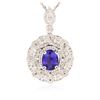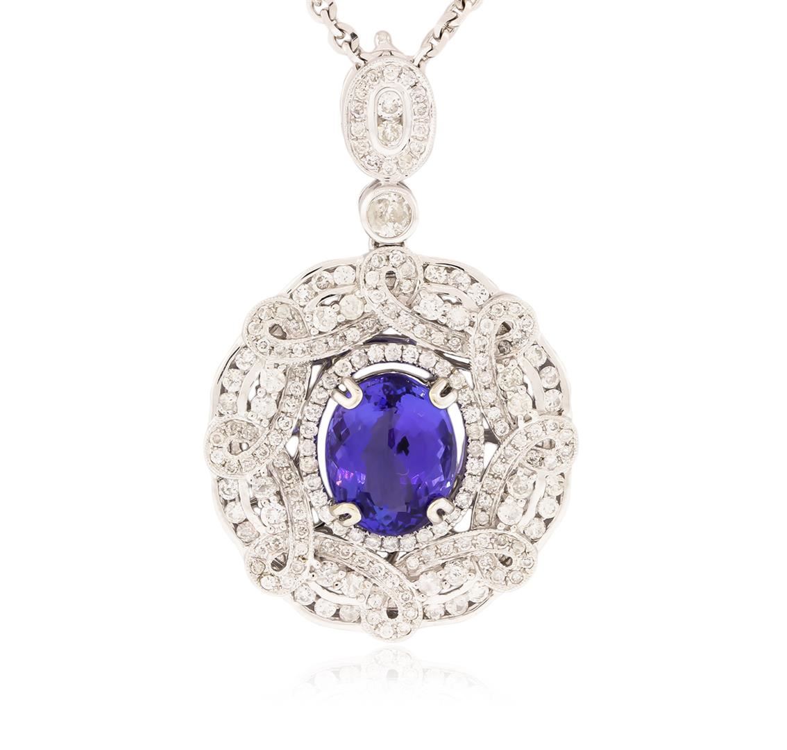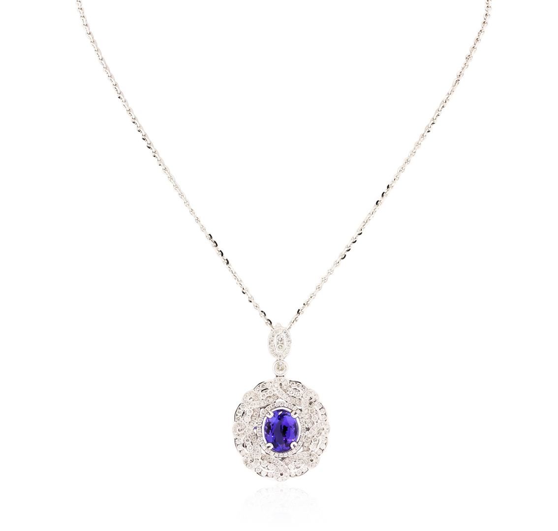 One electronically tested 14KT white gold Ladies combination cast & assembled pendant & chain 17.0" long, medium cable link with a lobster claw clasp with a bright polish finish. Condition is new. Identified with markings of "14K". Containing: One prong set round oval modified brilliant cut natural tanzanite, measuring 11.90 x 9.60 x 6.20mm, approximate weight of 4.80ct., clarity is eye clean, type I, medium light, very slightly grayish, violet color, (GIA V 4/3), cut is good. Colored gemstones are presumed to have been subjected to commonly used color/clarity enhancement processes. One bezel set round brilliant cut diamond, measuring 3.70 - 3.70 x 2.22mm (depth est.) approximate weight of 0.19ct. Clarity: I-2. Color: I, Cut is Good. One Hundred Seventy-Eight prong set round brilliant cut diamonds, measuring 1.90 - 1.30 x 0.96mm (depth est.) approximate. Total Weight of 178 Stones = 1.80ct. Clarity: I-1 to I-2. Color: I - J, Cut is Good. Total Weight of Colored Stones 4.80ct. Total Weight of Diamonds 1.99ct. Total Weight of Pendant & Chain 16.80 grams. GGL Appraised at $16,420.00.