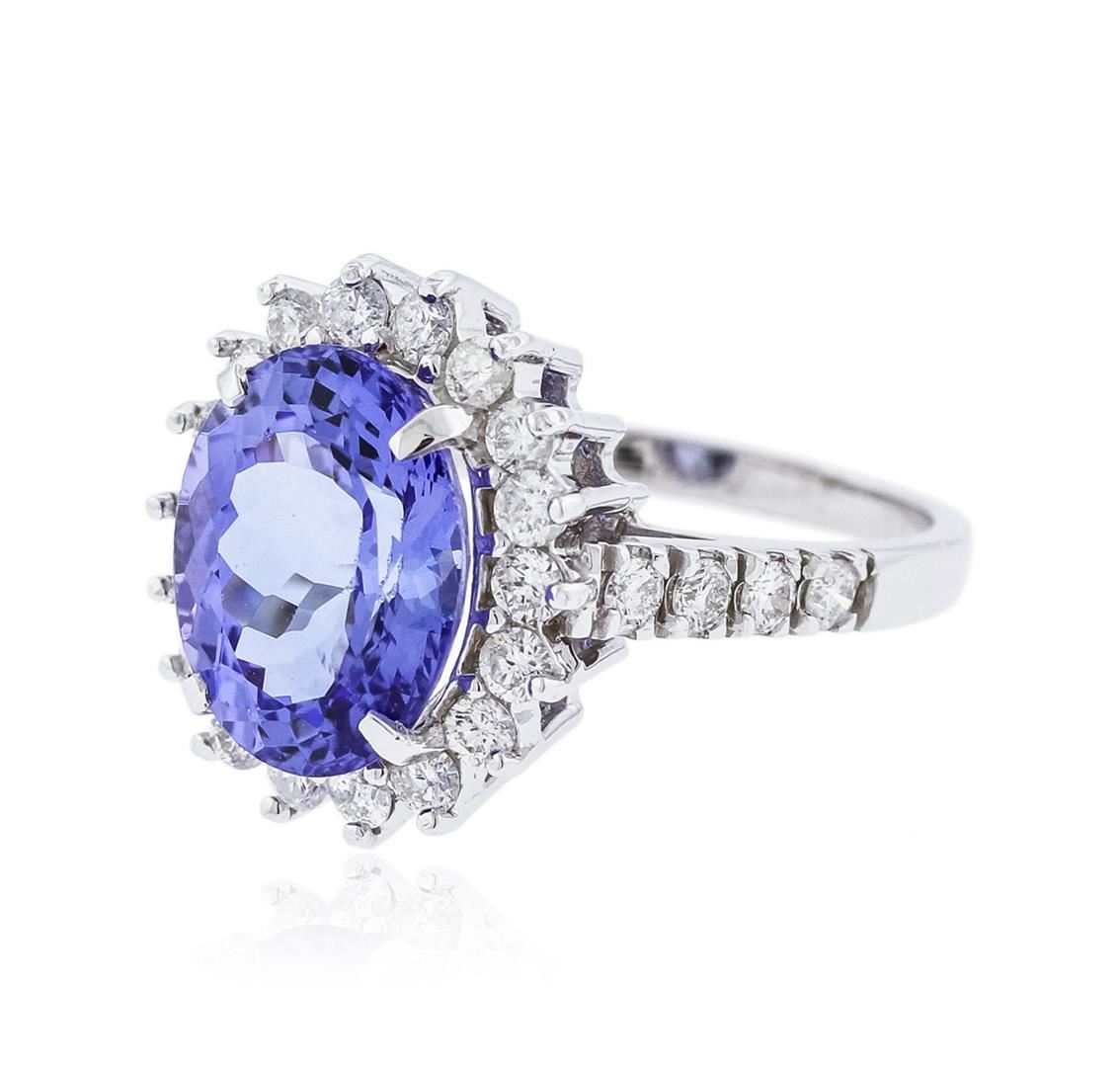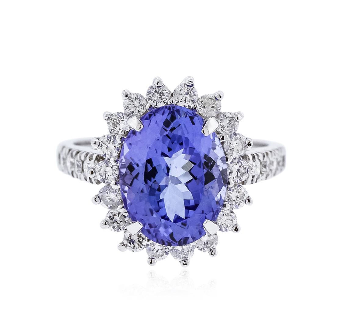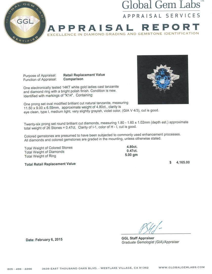 One electronically tested 14KT white gold ladies cast tanzanite and diamond ring with a bright polish finish. Identified with markings of "K14". Condition is new. Containing: One prong set oval modified brilliant cut natural tanzanite, measuring 11.50 x 9.00 x 6.59mm, approximate weight of 4.80ct., clarity is eye clean, type I, medium light, very slightly grayish, violet color, (GIA V 4/3), cut is good. Twenty-Six prong set round brilliant cut diamonds, measuring 1.80 - 1.60 x 1.02mm (depth est.) approximate total weight of 26 Stones = 0.47ct. Clarity: I-1. Color: H - I, Cut is Good. Colored gemstones are presumed to have been subjected to commonly used enhancement processes. All diamonds and colored gemstones are graded in the mounting, unless otherwise stated. Total Weight of Colored Stones 4.80ct. Total Weight of Diamonds 0.47ct. Total Weight of Ring 5.00 grams. GGL Appraised at $4,165.00.