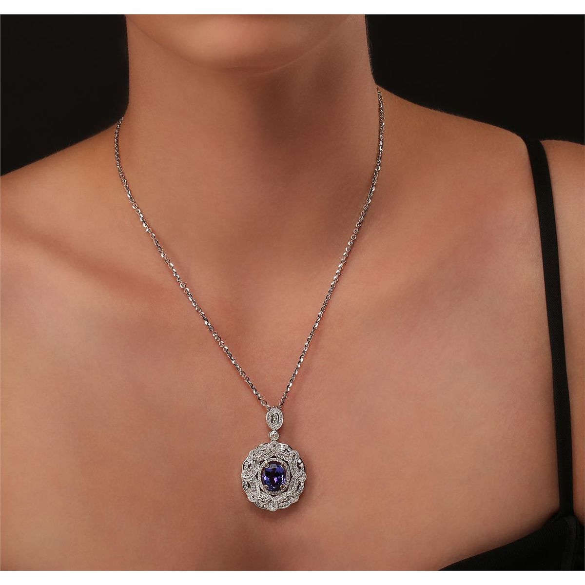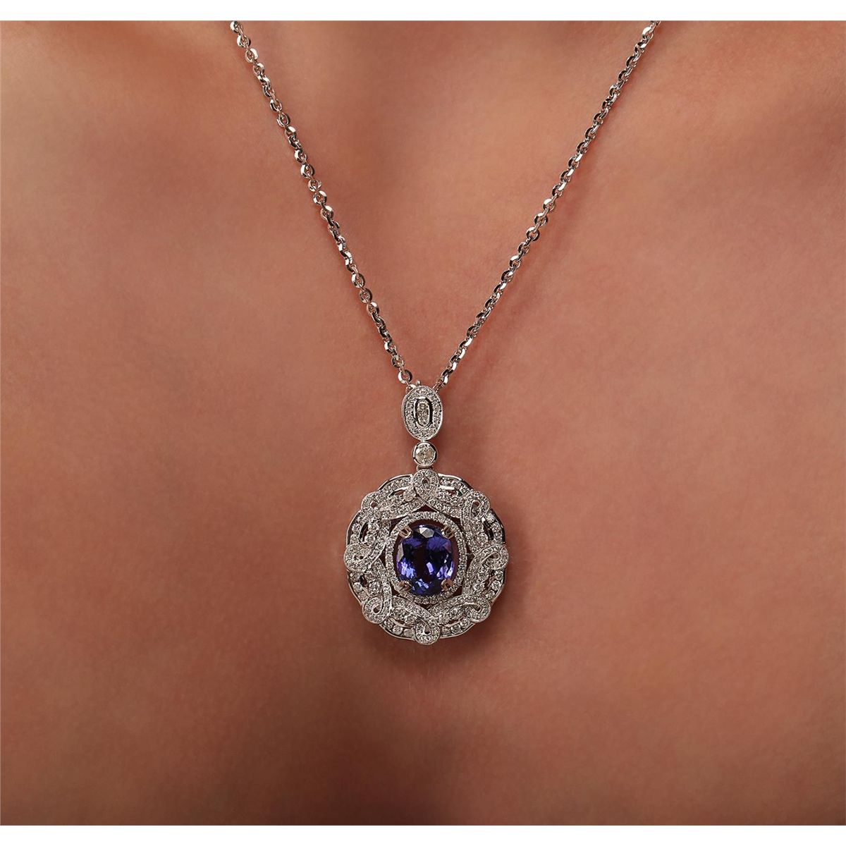 One electronically tested 14KT white gold Ladies combination cast & assembled pendant & chain 17.0" long, medium cable link with a lobster claw clasp with a bright polish finish. Condition is new. Identified with markings of "14K". Containing: One prong set round oval modified brilliant cut natural tanzanite, measuring 11.90 x 9.60 x 6.20mm, approximate weight of 4.80ct., clarity is eye clean, type I, medium light, very slightly grayish, violet color, (GIA V 4/3), cut is good. Colored gemstones are presumed to have been subjected to commonly used color/clarity enhancement processes. One bezel set round brilliant cut diamond, measuring 3.70 - 3.70 x 2.22mm (depth est.) approximate weight of 0.19ct. Clarity: I-2. Color: I, Cut is Good. One Hundred Seventy-Eight prong set round brilliant cut diamonds, measuring 1.90 - 1.30 x 0.96mm (depth est.) approximate. Total Weight of 178 Stones = 1.80ct. Clarity: I-1 to I-2. Color: I - J, Cut is Good. Total Weight of Colored Stones 4.80ct. Total Weight of Diamonds 1.99ct. Total Weight of Pendant & Chain 16.80 grams. GGL Appraised at $16,420.00.
