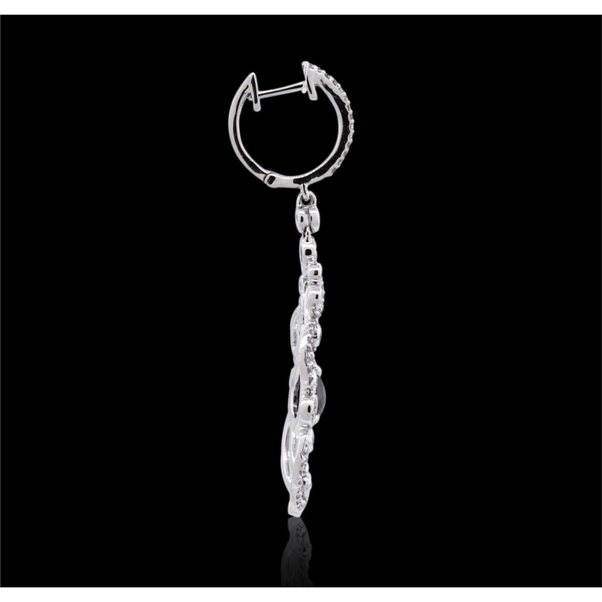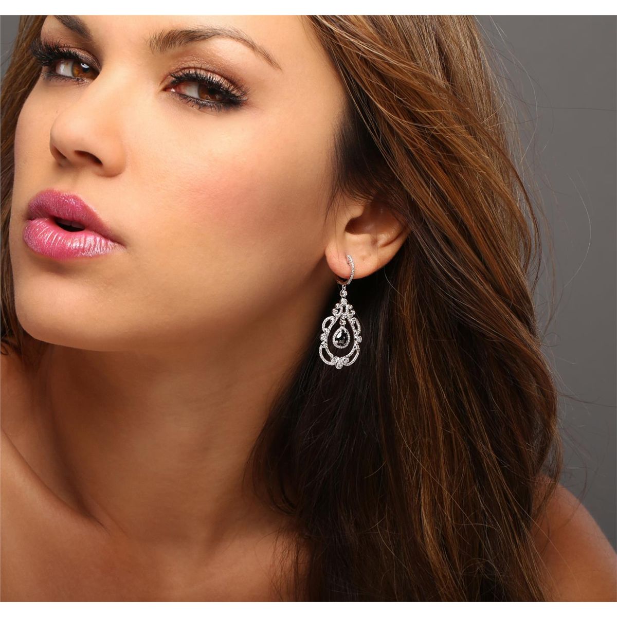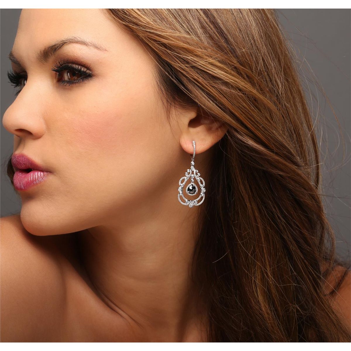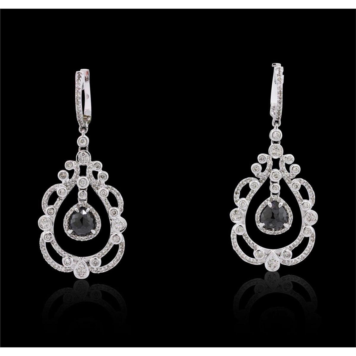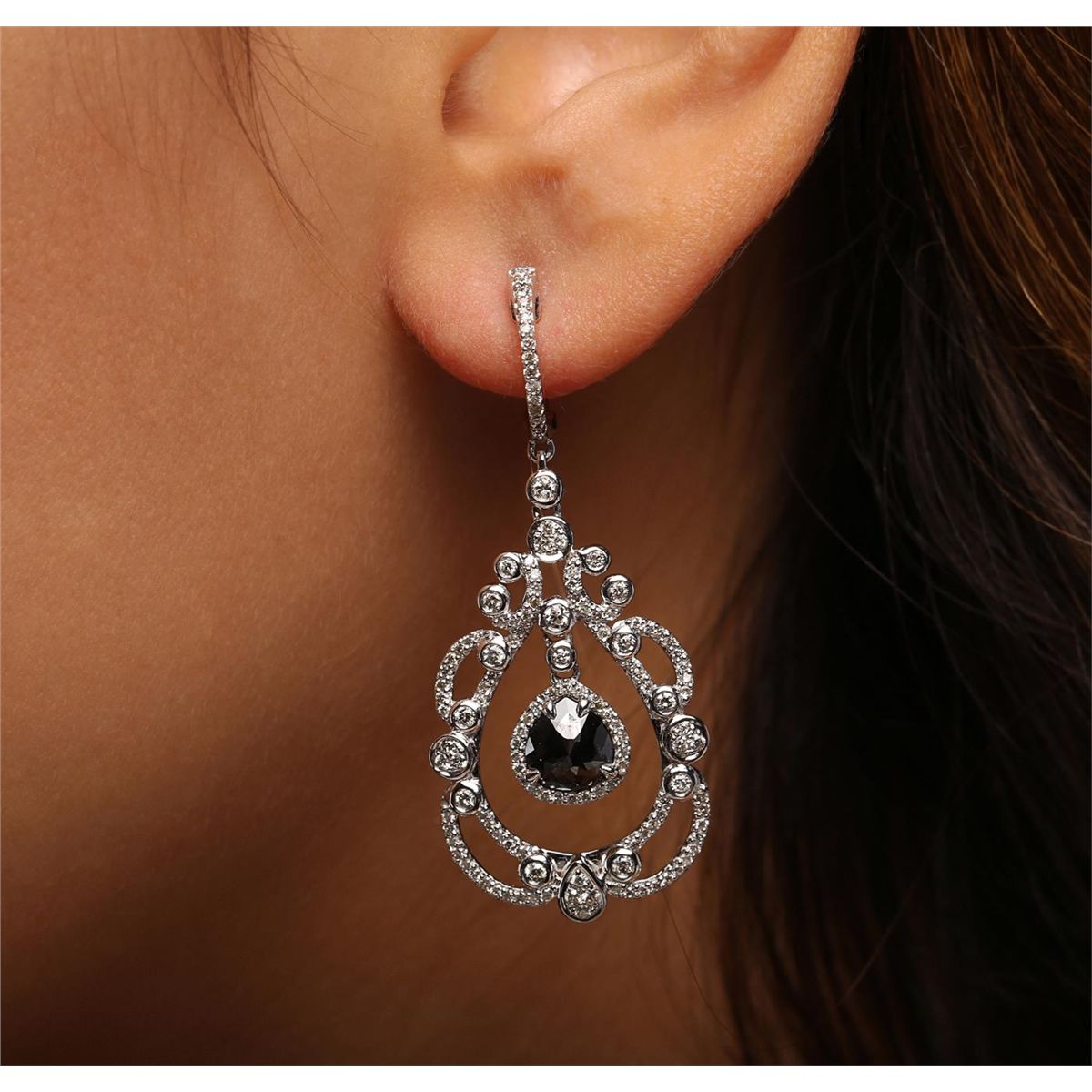 One pair of white gold earrings stamped 14k containing two natural pear rose cut fancy black diamonds, enhanced for color, with a total weight of 3.28ct. The earrings also contain 276 round brilliant cut side stones that are I-J color, SI3-I1 clarity with a total weight of 1.52ct. Total weight of the earrings is 9.20 grams. EGL Appraised at $5,100.00.