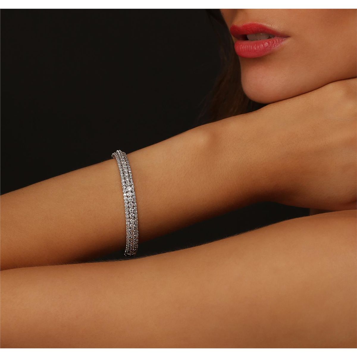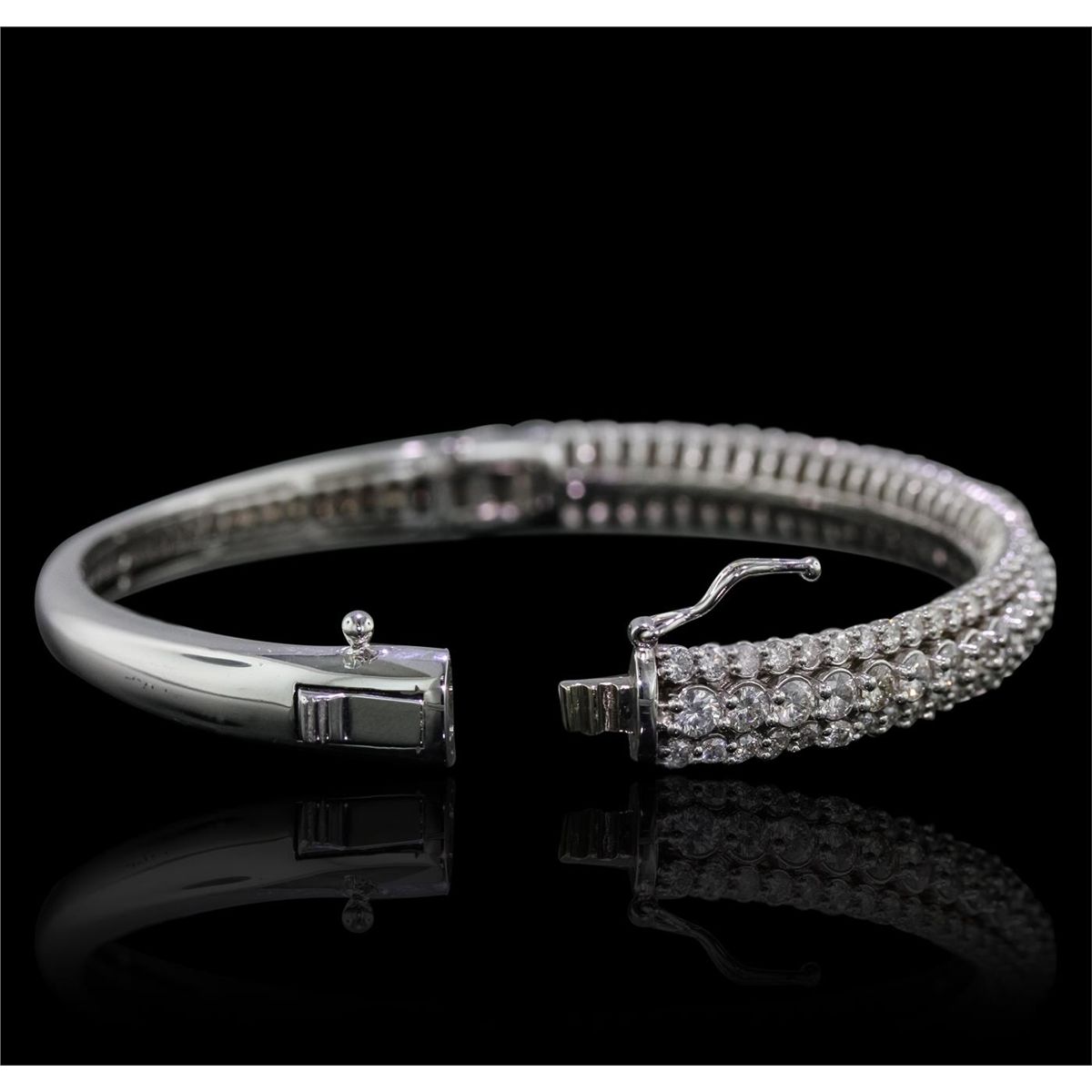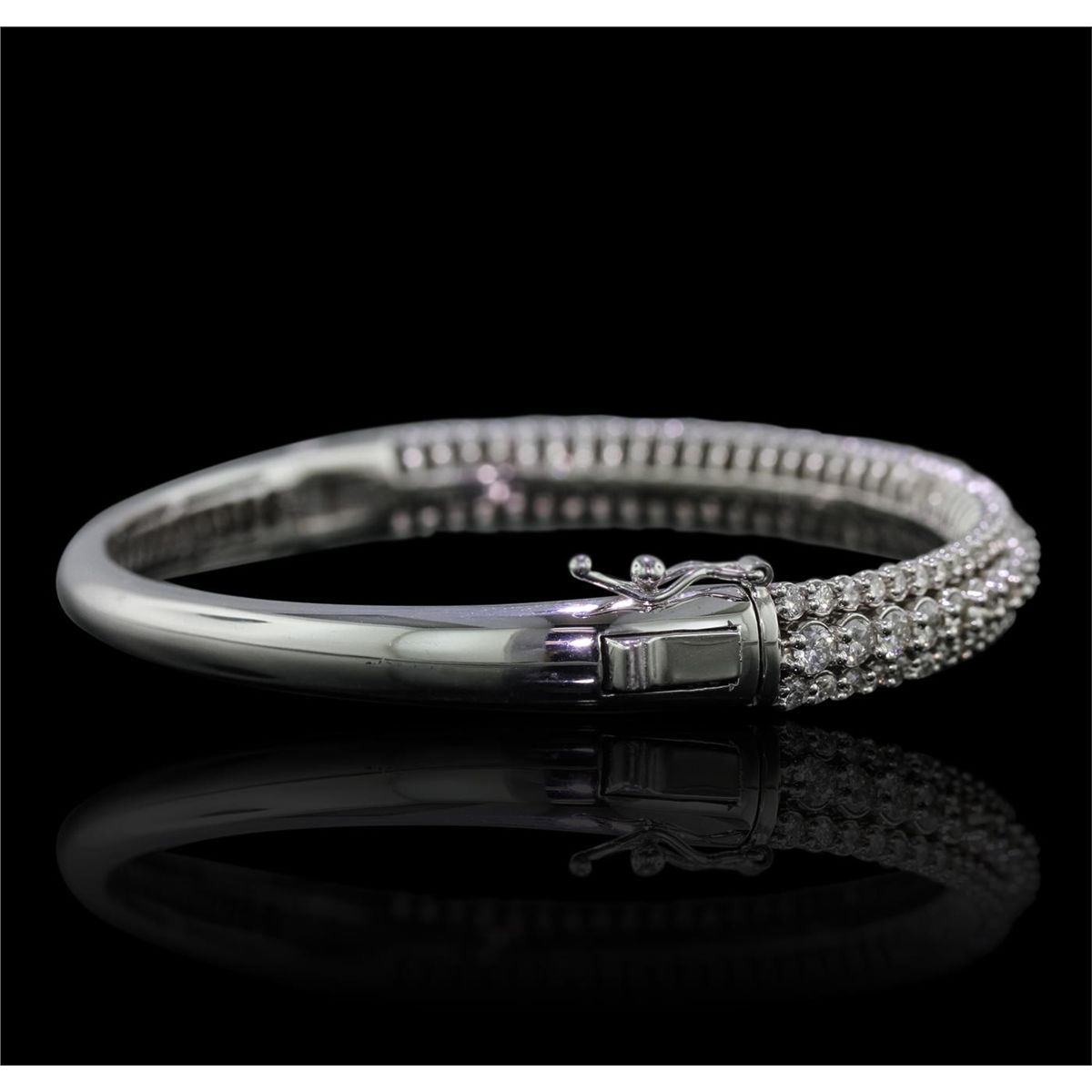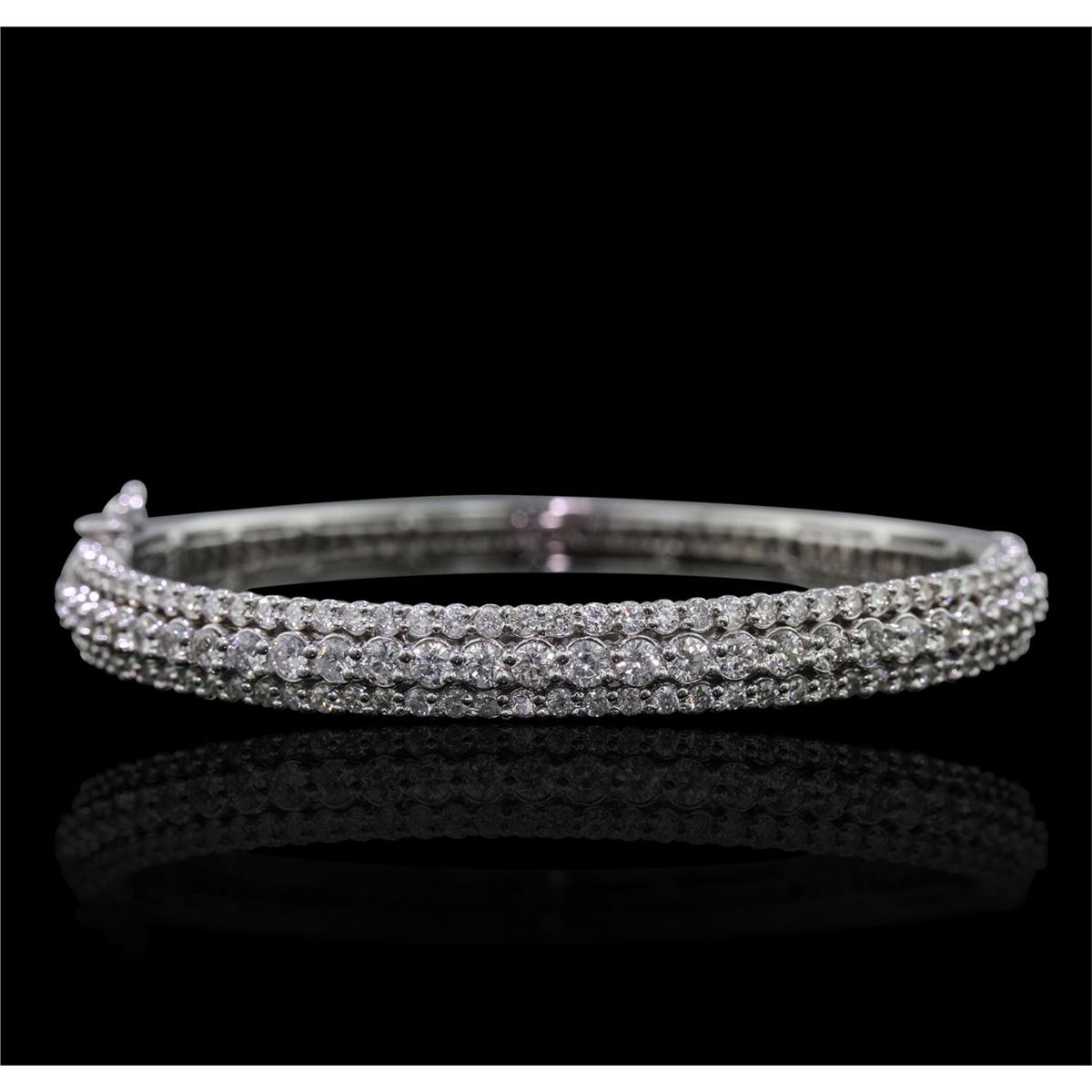 One electronically tested 14KT white gold Ladies cast bangle bracelet with a hidden box clasp with a bright polish finish. Condition is new. Identified with markings of "14K". Containing: Thirty prong set round brilliant cut diamonds, measuring 3.00 - 3.00 x 1.80mm (depth est.) approximate. Total Weight of 30 Stones = 2.96ct. Clarity: I-1 to I-2. Color: I - J, Cut is Good. Eighty-Six prong set round brilliant cut diamonds, measuring 1.80 - 1.80 x 1.08mm (depth est.) approximate. Total Weight of 86 Stones = 1.83ct. Clarity: I-1 to I-2. Color: H - I, Cut is Good. Total Weight of Diamonds 4.80ct. Total Weight of Bangle Bracelet 25.20 grams. GGL Appraised at $17,270.00.