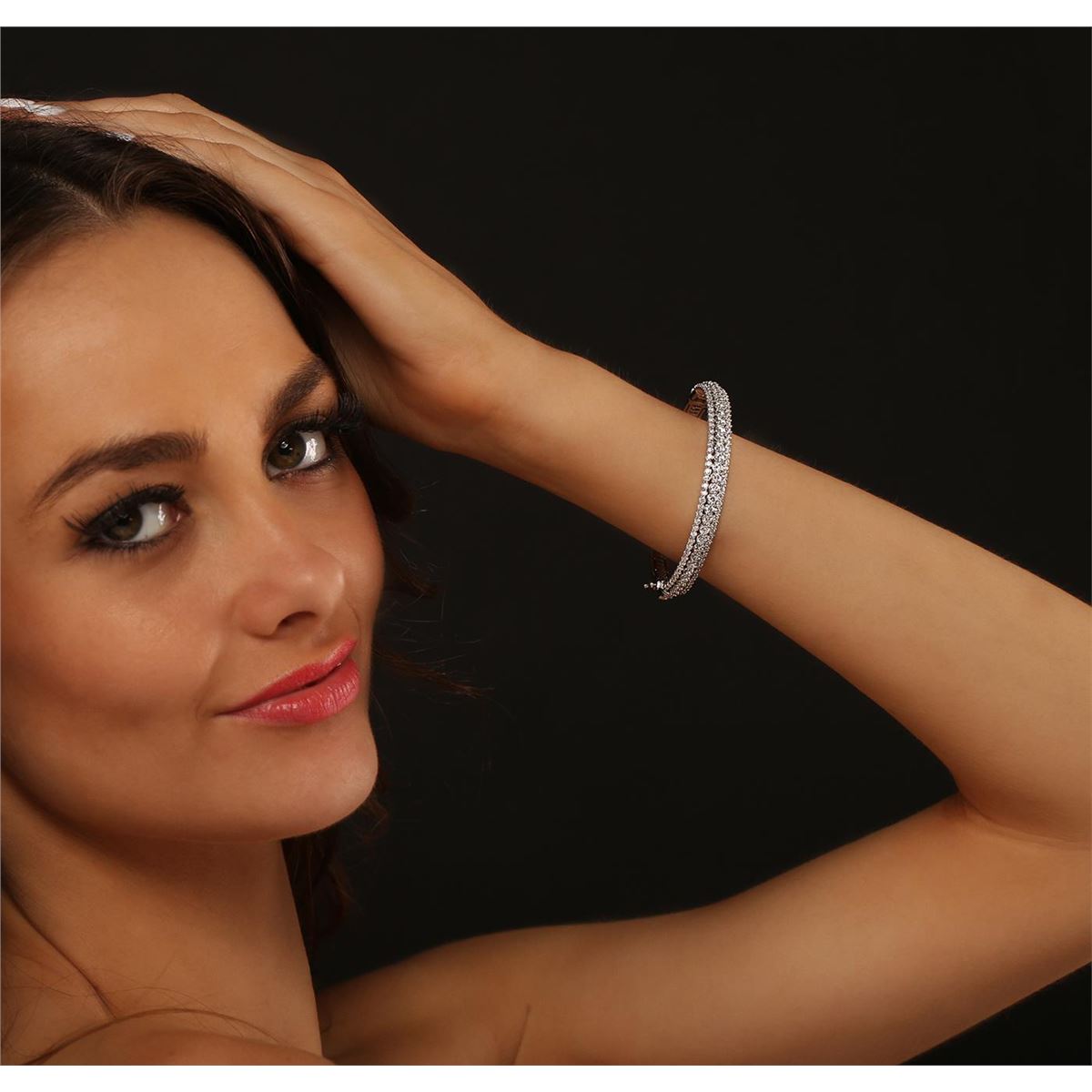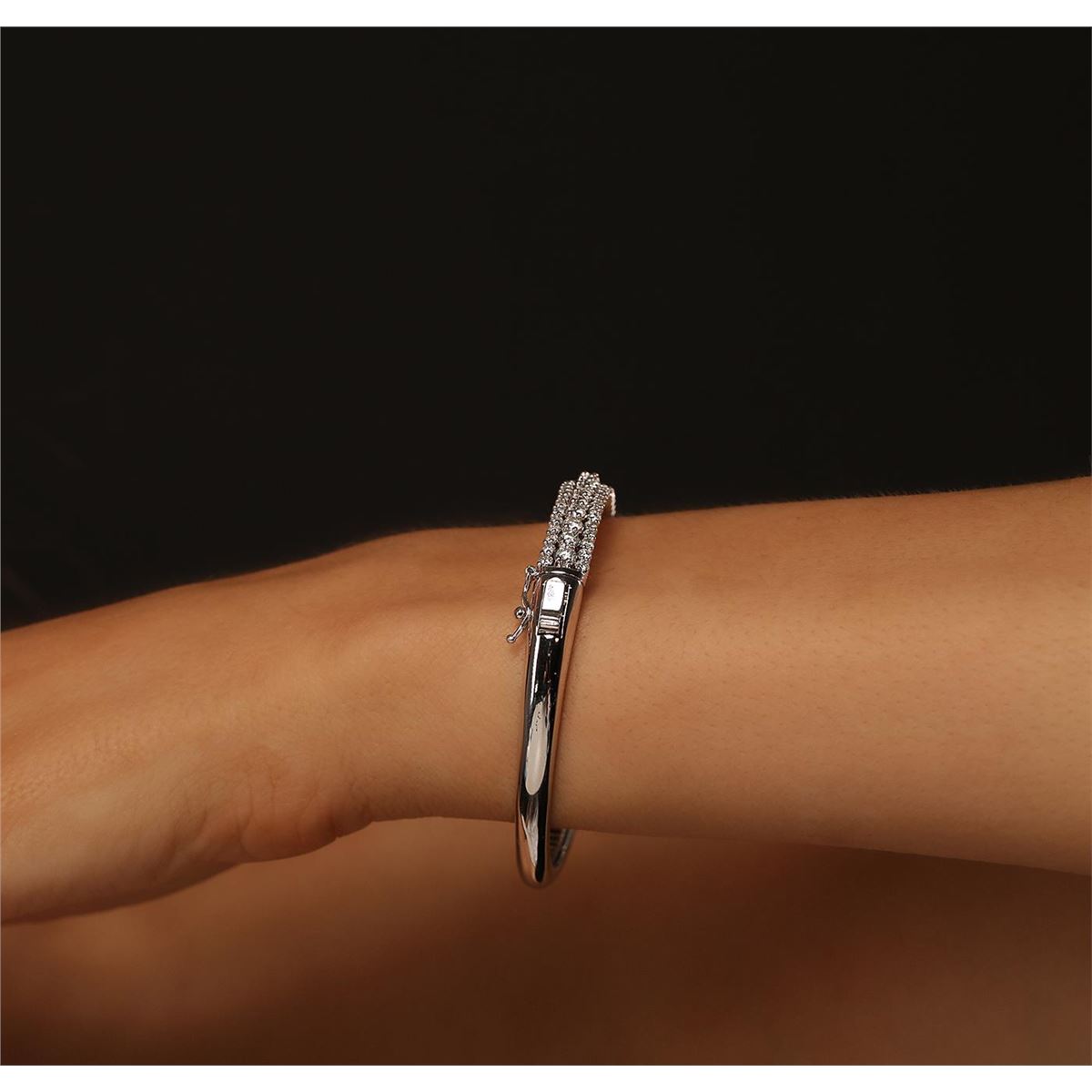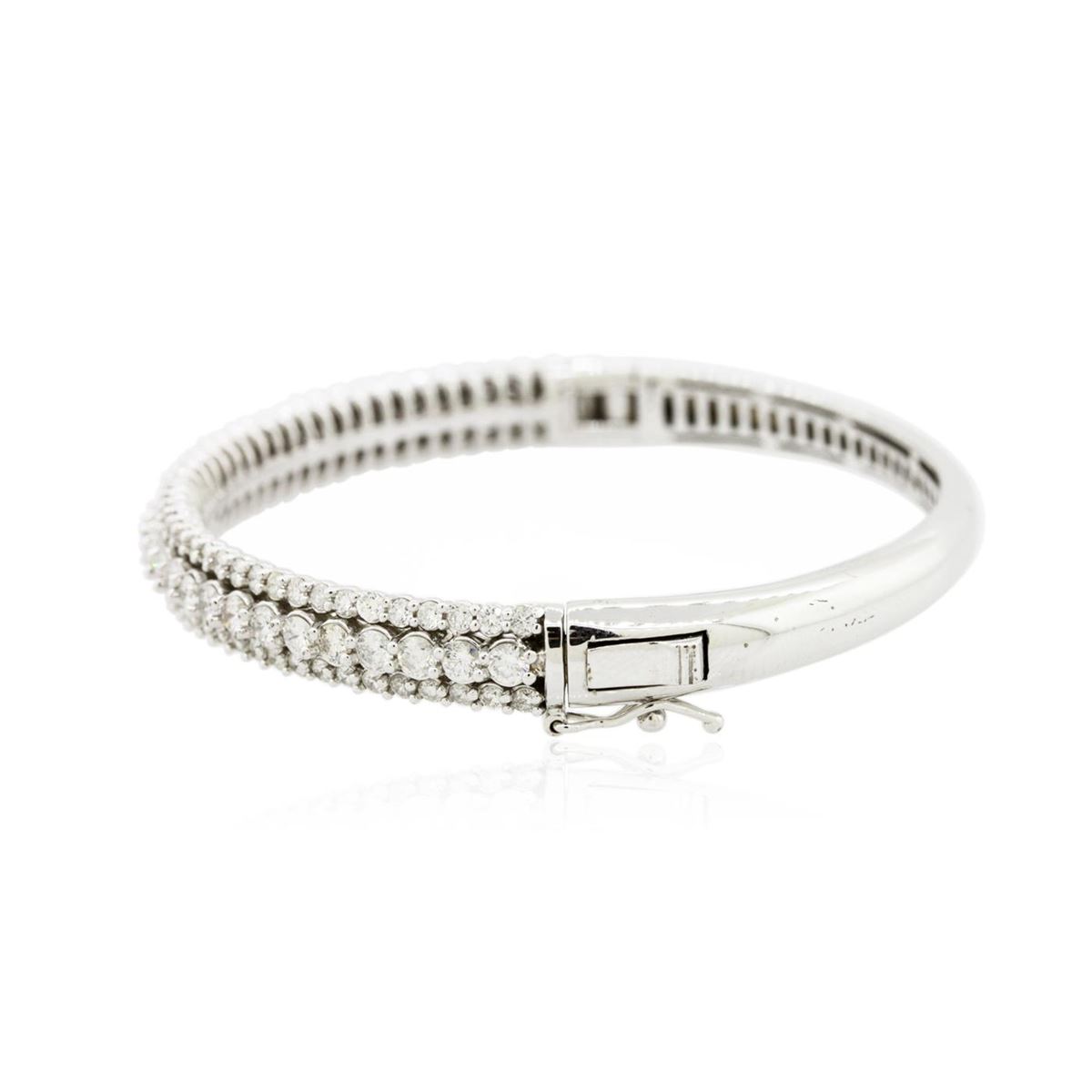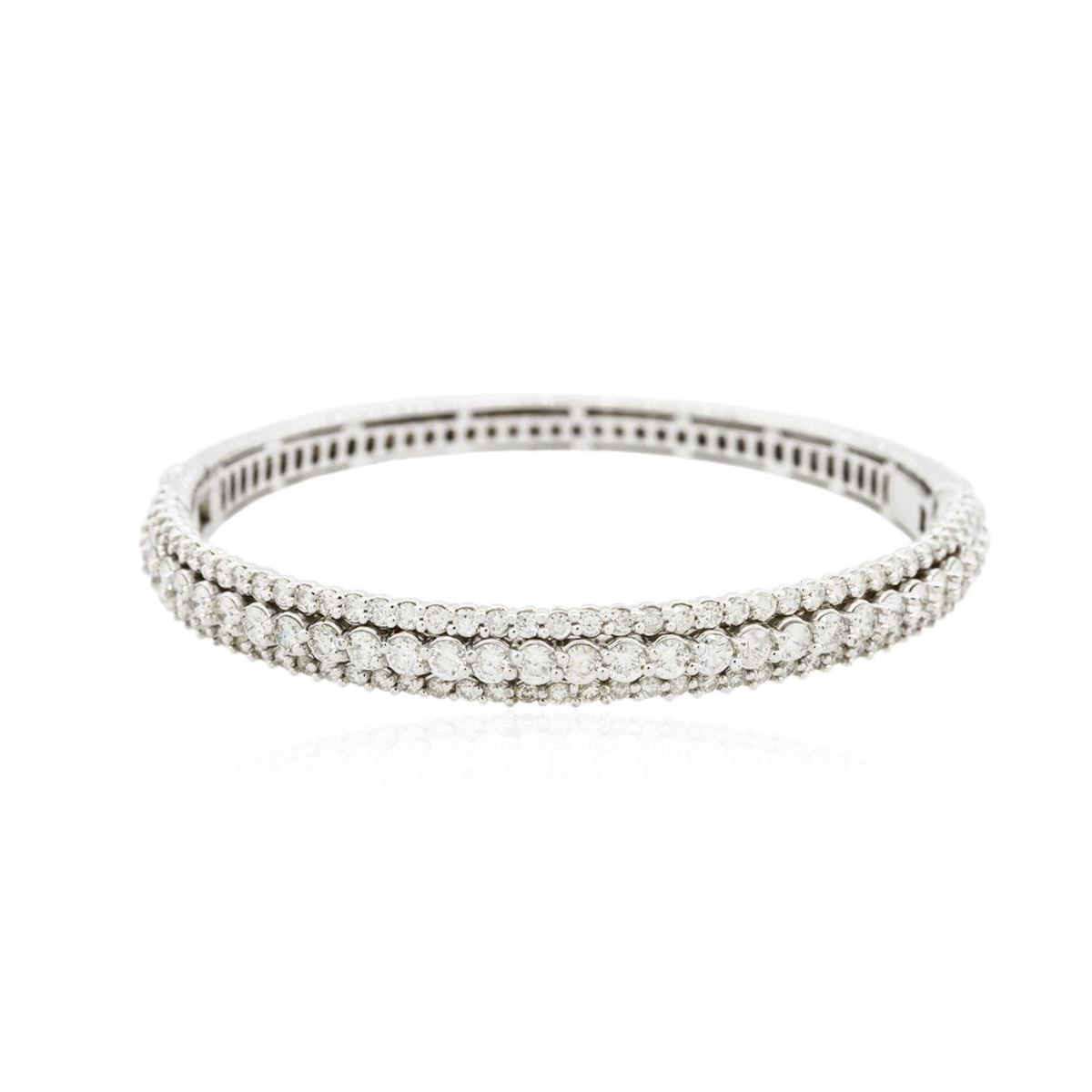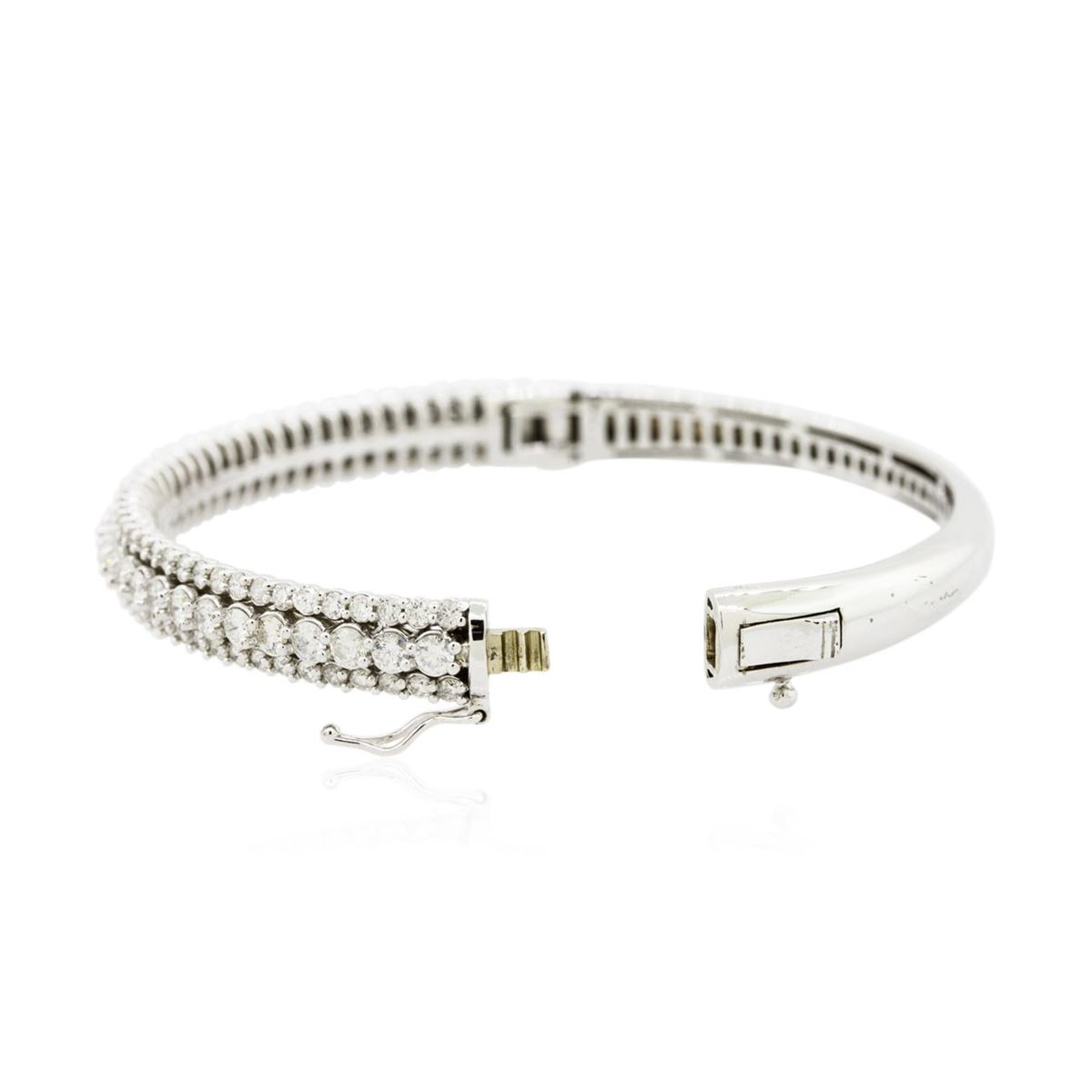 One electronically tested 14KT white gold Ladies cast bangle bracelet with a hidden box clasp with a bright polish finish. Condition is new. Identified with markings of "14K". Containing: Thirty prong set round brilliant cut diamonds, measuring 3.00 - 3.00 x 1.80mm (depth est.) approximate. Total Weight of 30 Stones = 2.96ct. Clarity: I-1 to I-2. Color: I - J, Cut is Good. Eighty-Six prong set round brilliant cut diamonds, measuring 1.80 - 1.80 x 1.08mm (depth est.) approximate. Total Weight of 86 Stones = 1.83ct. Clarity: I-1 to I-2. Color: H - I, Cut is Good. Total Weight of Diamonds 4.80ct. Total Weight of Bangle Bracelet 25.20 grams. GGL Appraised at $17,270.00.