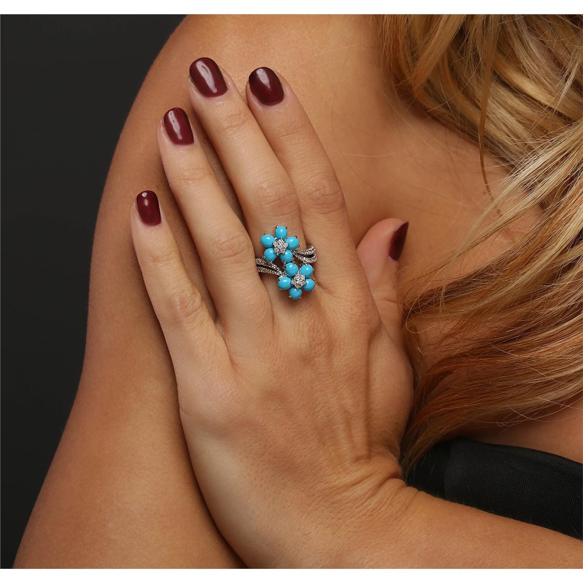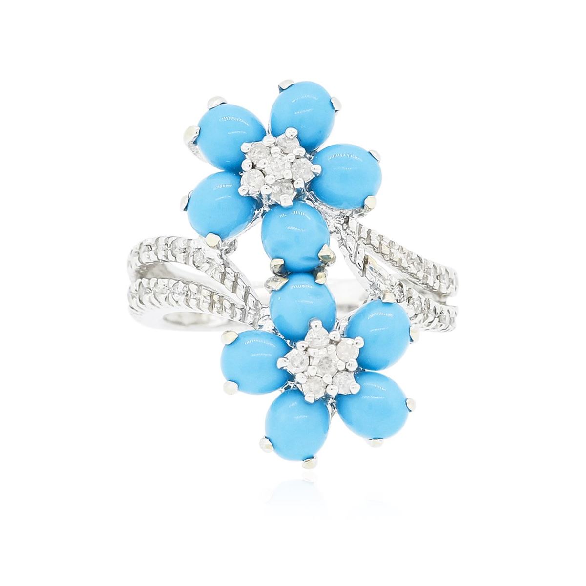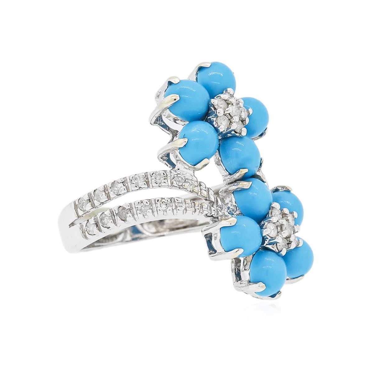 One electronically tested 14KT white gold ladies combination cast & assembled ring with a bright polish finish. Identified with markings of "14K". Condition is very good. Containing: Thirty-Four prong set round brilliant cut diamonds, measuring 1.20 - 1.20 x 0.72mm (depth est.) approximate total weight of 34 Stones = 0.21ct. Clarity: I-2 to I-3. Color: I - J. Ten prong set round cabochon cut natural turquoises, measuring 4.61 x 4.61 x 3.00mm, approximate total weight of 4.80ct., medium light, moderately strong, blue color, (GIA B 4/4), cut is good. Colored gemstones are presumed to have been subjected to commonly used enhancement processes. All diamonds and colored gemstones are graded in the mounting, unless otherwise stated. Total Weight of Colored Stones 4.80ct. Total Weight of Diamonds 0.21ct. Total Weight of Ring 5.50 grams. GGL Appraised at $2,435.00.