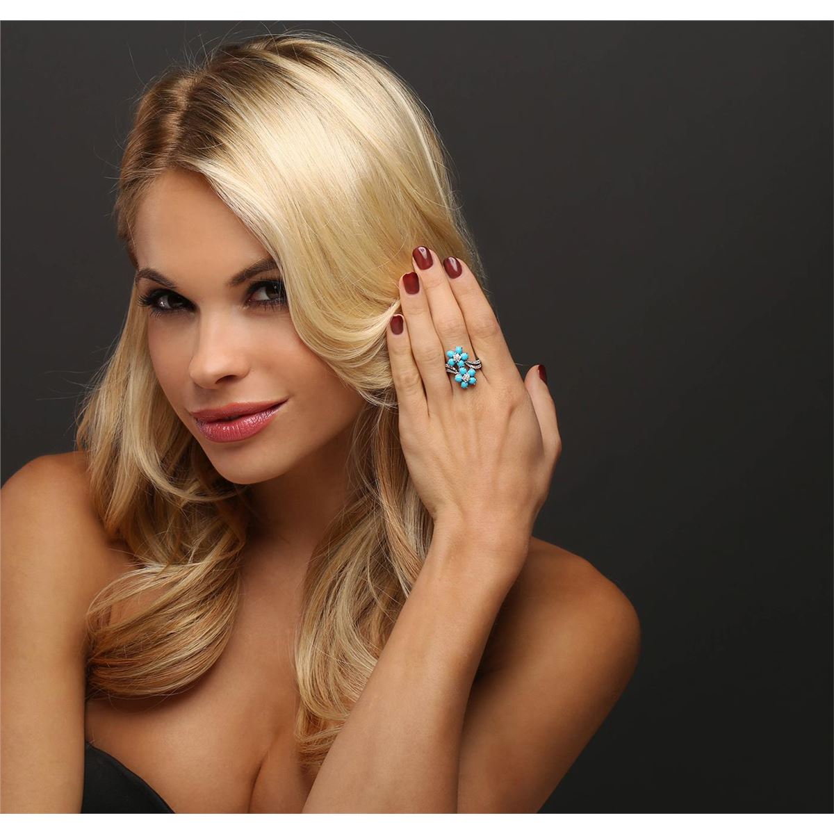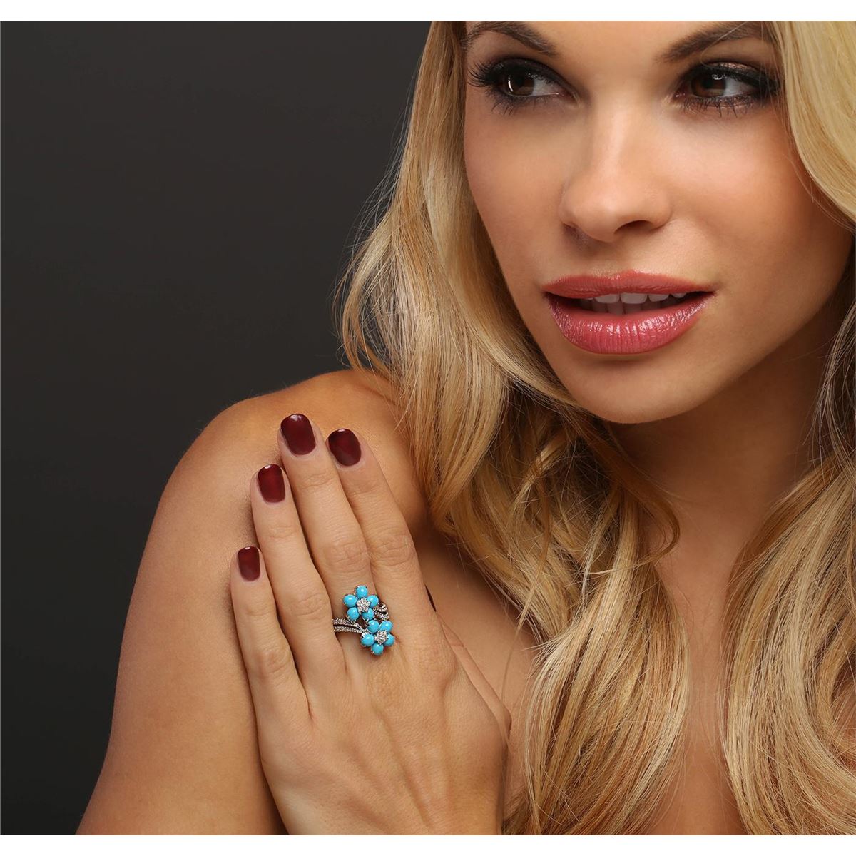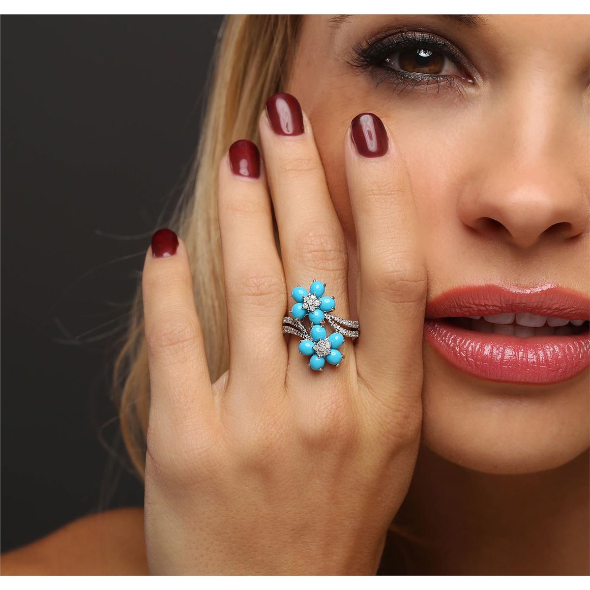 One electronically tested 14KT white gold ladies combination cast & assembled ring with a bright polish finish. Identified with markings of "14K". Condition is very good. Containing: Thirty-Four prong set round brilliant cut diamonds, measuring 1.20 - 1.20 x 0.72mm (depth est.) approximate total weight of 34 Stones = 0.21ct. Clarity: I-2 to I-3. Color: I - J. Ten prong set round cabochon cut natural turquoises, measuring 4.61 x 4.61 x 3.00mm, approximate total weight of 4.80ct., medium light, moderately strong, blue color, (GIA B 4/4), cut is good. Colored gemstones are presumed to have been subjected to commonly used enhancement processes. All diamonds and colored gemstones are graded in the mounting, unless otherwise stated. Total Weight of Colored Stones 4.80ct. Total Weight of Diamonds 0.21ct. Total Weight of Ring 5.50 grams. GGL Appraised at $2,435.00.