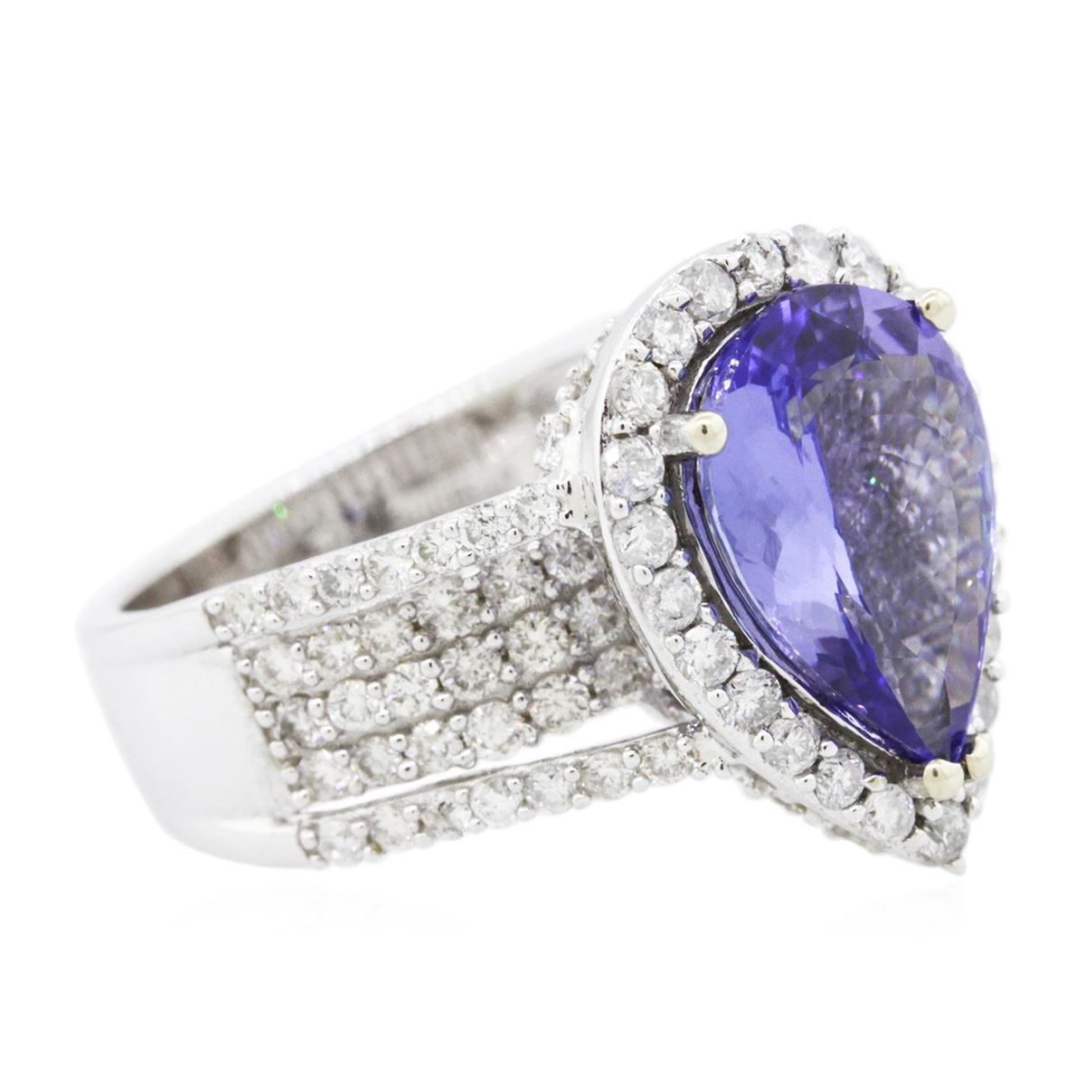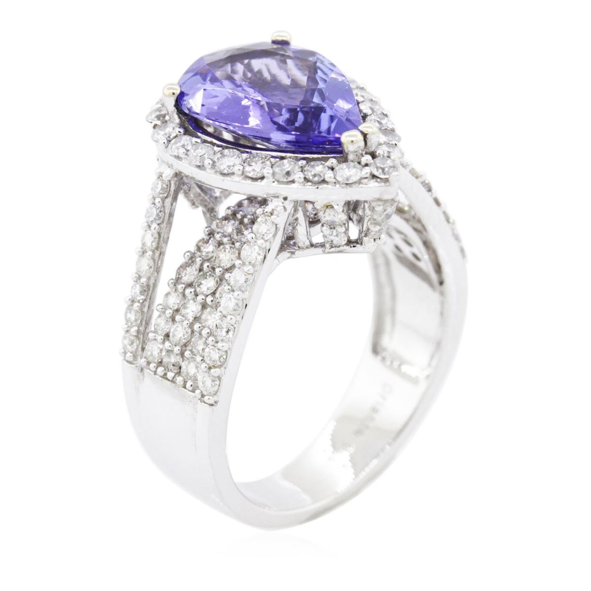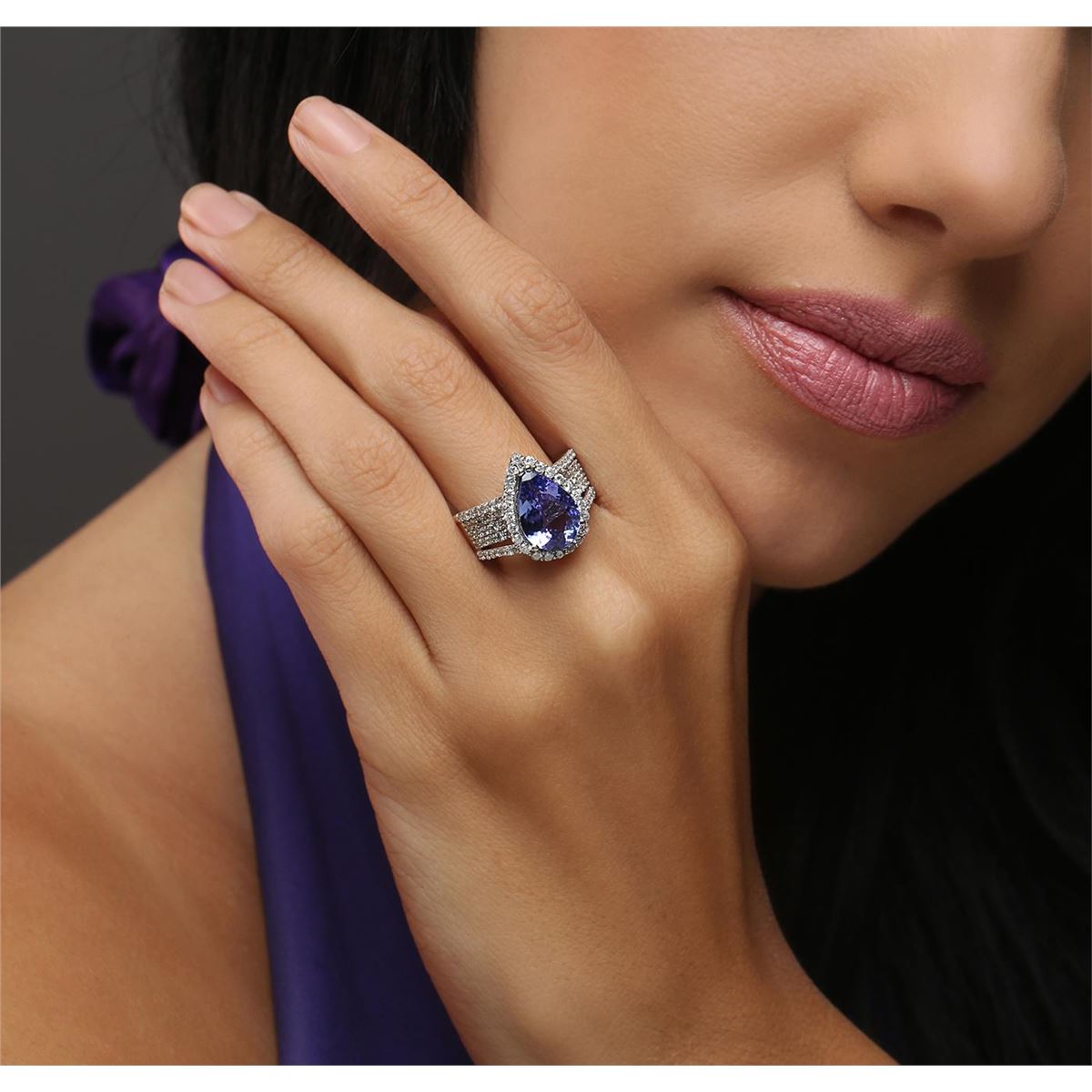 One electronically tested 14KT white gold ladies combination cast & assembled tanzanite and diamond ring with a split shank with a bright polish finish. Identified with markings of "14K". Condition is new. Containing: One prong set pear modified brilliant cut natural tanzanite, measuring 13.50 x 9.04 x 5.88mm, approximate weight of 4.81ct., clarity is eye clean, type I, medium, very slightly grayish, violet color, (GIA V 5/3), cut is good. One Hundred Twelve prong set round brilliant cut diamonds, measuring 1.50 - 1.10 x 0.78mm (depth est.) approximate total weight of 112 Stones = 0.90ct. Clarity: SI-1 to I-1. Color: J, Cut is Good. Colored gemstones are presumed to have been subjected to commonly used enhancement processes. All diamonds and colored gemstones are graded in the mounting, unless otherwise stated. Total Weight of Colored Stones 4.81ct. Total Weight of Diamonds 0.90ct. Total Weight of Ring 7.90 grams. GGL Appraised at $11,525.00.
