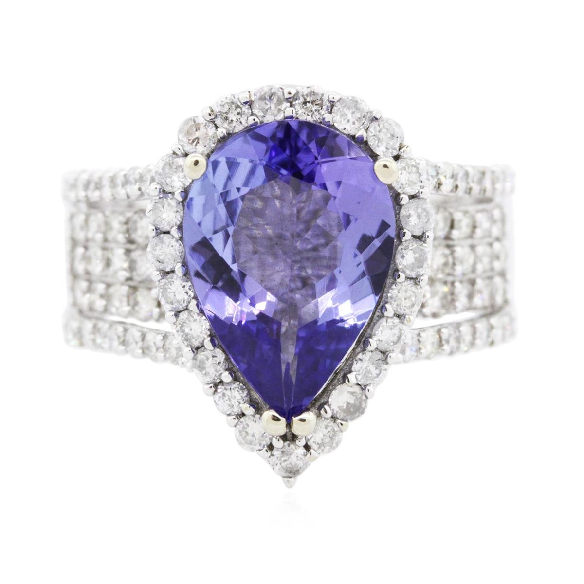 One electronically tested 14KT white gold ladies combination cast & assembled tanzanite and diamond ring with a split shank with a bright polish finish. Identified with markings of "14K". Condition is new. Containing: One prong set pear modified brilliant cut natural tanzanite, measuring 13.50 x 9.04 x 5.88mm, approximate weight of 4.81ct., clarity is eye clean, type I, medium, very slightly grayish, violet color, (GIA V 5/3), cut is good. One Hundred Twelve prong set round brilliant cut diamonds, measuring 1.50 - 1.10 x 0.78mm (depth est.) approximate total weight of 112 Stones = 0.90ct. Clarity: SI-1 to I-1. Color: J, Cut is Good. Colored gemstones are presumed to have been subjected to commonly used enhancement processes. All diamonds and colored gemstones are graded in the mounting, unless otherwise stated. Total Weight of Colored Stones 4.81ct. Total Weight of Diamonds 0.90ct. Total Weight of Ring 7.90 grams. GGL Appraised at $11,525.00.