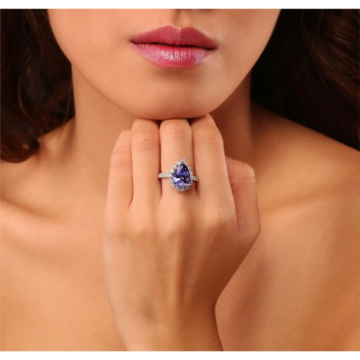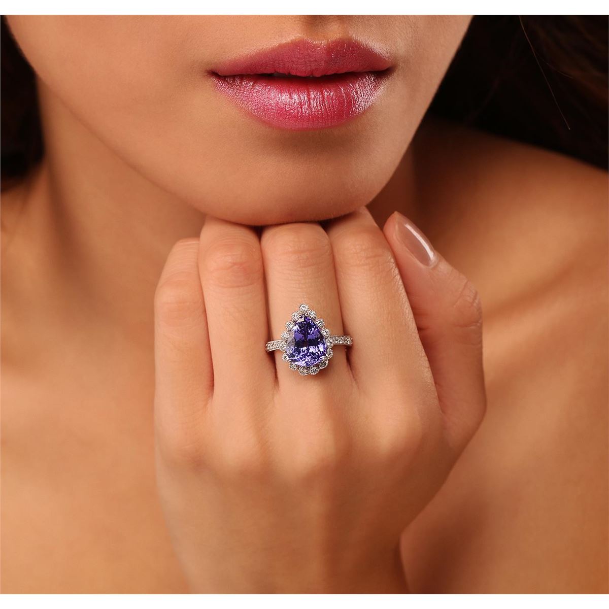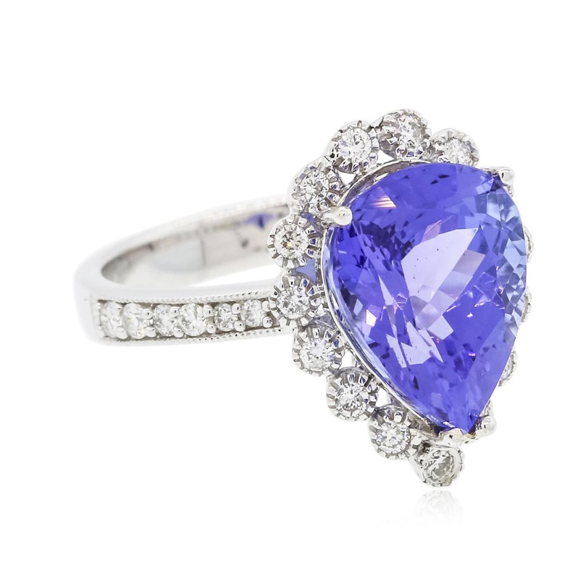 One electronically tested 14KT white gold Ladies cast ring with a bright polish finish. Condition is new. Identified with markings of "14K". Containing: One prong set pear modified brilliant cut natural tanzanite, measuring 12.00 x 9.60 x 6.23mm, approximate weight of 4.81ct., clarity is eye clean, type I, medium, moderately strong, bluish violet color, (GIA bV 5/4), cut is very good. Colored gemstones are presumed to have been subjected to commonly used color/clarity enhancement processes. Twenty-Seven prong set round brilliant cut diamonds, measuring 1.60 - 1.30 x 0.87mm (depth est.) approximate. Total Weight of 27 Stones = 0.30ct. Clarity: I-1 to I-2. Color: I - J, Cut is Good. Total Weight of Colored Stones 4.81ct. Total Weight of Diamonds 0.30ct. Total Weight of Ring 4.80 Grams. GGL Appraised at $8,685.00.