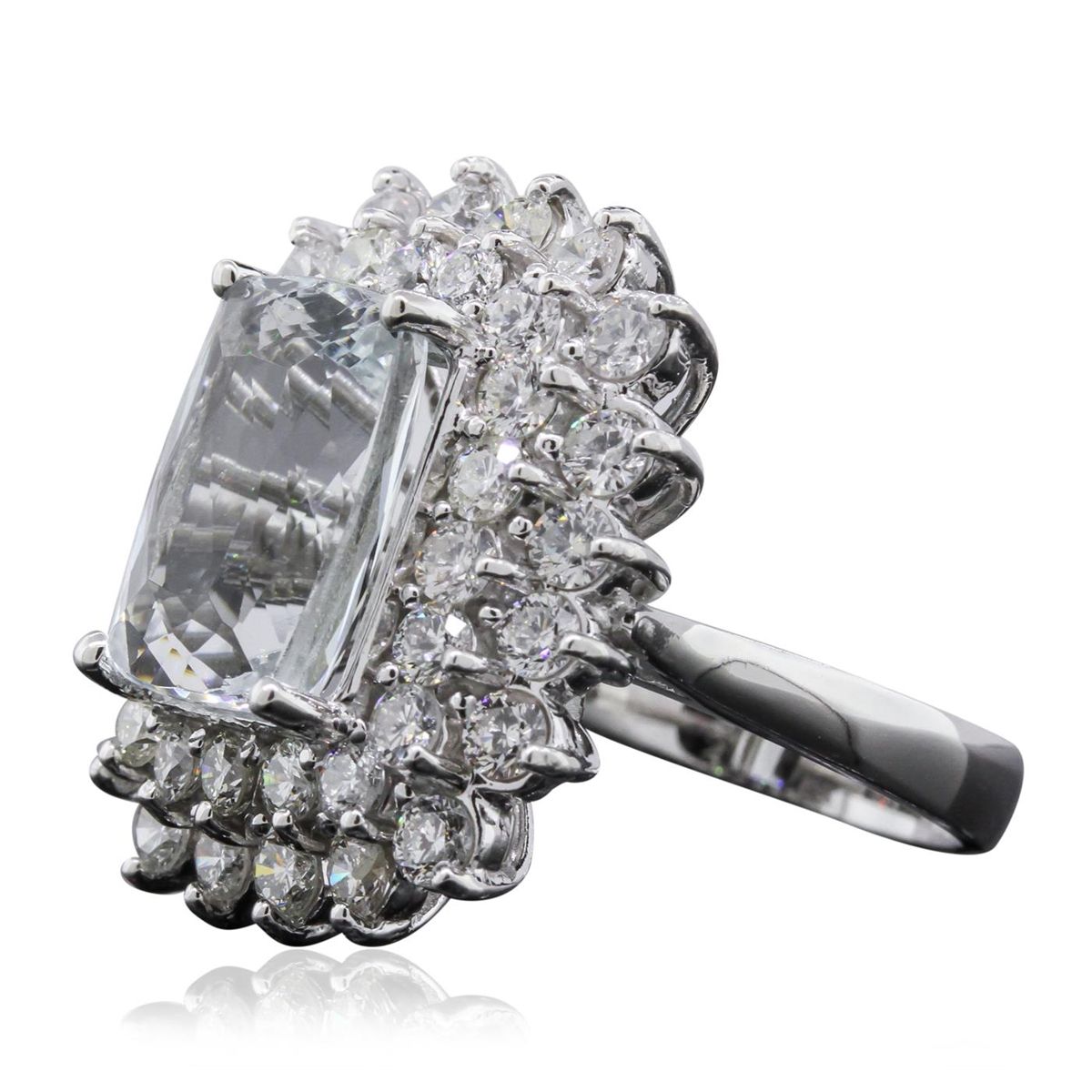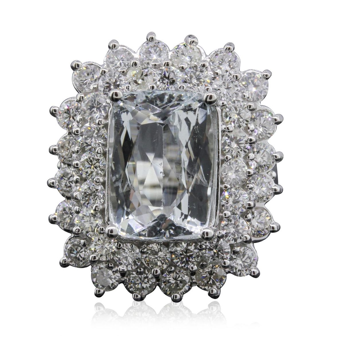 One electronically tested 14KT white gold ladies cast aquamarine and diamond ring with a bright polish finish. Condition is new, good workmanship. The aquamarine is set within a two tiered diamond lattice gallery, completed by a three millimeter wide band. Identified with markings of "K14". Containing: One prong set rectangular cushion mixed cut natural aquamarine, measuring 12.70 x 9.00 x 6.10mm, 8%. bulge factor, approximate weight of 4.81ct., clarity is eye clean, type I, light, very slightly grayish, blue color, (GIA B 3/3), cut is good. Transmitting light with no distortion, transparent. Refractive index testing results of 1.56 to 1.57. This is a conclusive result for Aquamarine (Beryl). Graded in the setting. Forty prong set round brilliant cut diamonds, measuring 2.80 - 2.60 x 1.62mm (depth est.) approximate. Total Weight of 40 Stones = 2.98ct. Graded in the setting. Clarity: SI-2 to I-1. Color: G - I. Total Weight of Colored Stones 4.81ct. Total Weight of Diamonds 2.98ct. Total Weight of Ring 11.00 grams. AIG Appraised at $11,540.00.