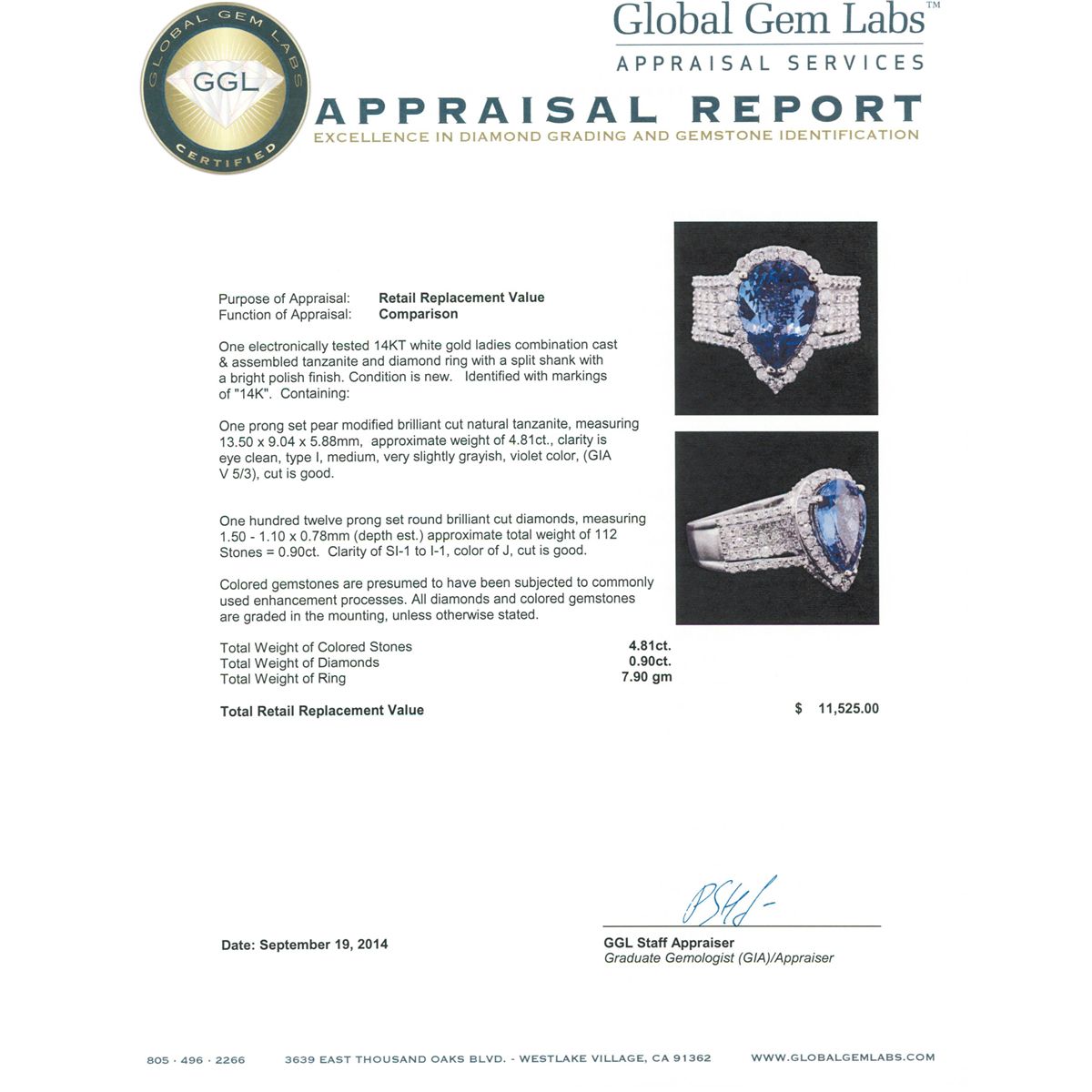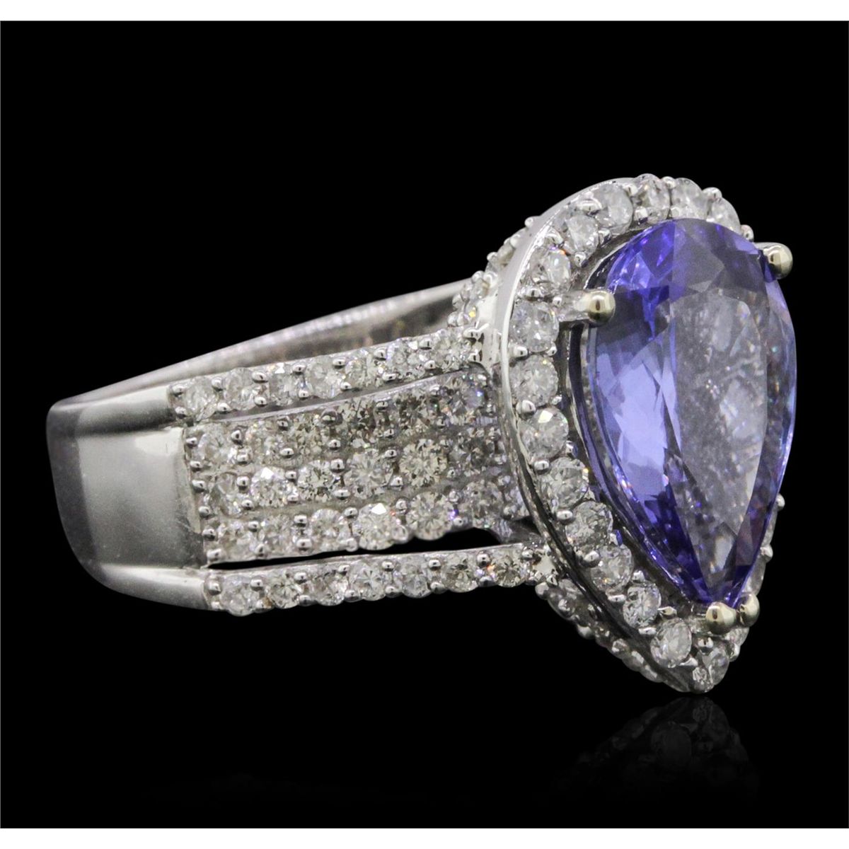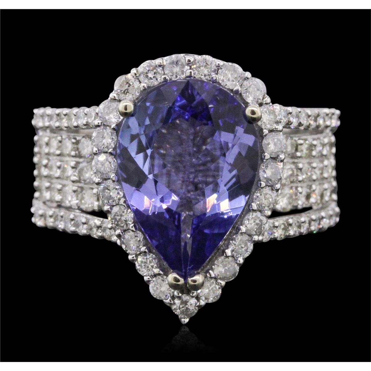 One electronically tested 14KT white gold ladies combination cast & assembled tanzanite and diamond ring with a split shank with a bright polish finish. Identified with markings of "14K". Condition is new. Containing: One prong set pear modified brilliant cut natural tanzanite, measuring 13.50 x 9.04 x 5.88mm, approximate weight of 4.81ct., clarity is eye clean, type I, medium, very slightly grayish, violet color, (GIA V 5/3), cut is good. One Hundred Twelve prong set round brilliant cut diamonds, measuring 1.50 - 1.10 x 0.78mm (depth est.) approximate total weight of 112 Stones = 0.90ct. Clarity: SI-1 to I-1. Color: J, Cut is Good. Colored gemstones are presumed to have been subjected to commonly used enhancement processes. All diamonds and colored gemstones are graded in the mounting, unless otherwise stated. Total Weight of Colored Stones 4.81ct. Total Weight of Diamonds 0.90ct. Total Weight of Ring 7.90 grams. GGL Appraised at $11,525.00.