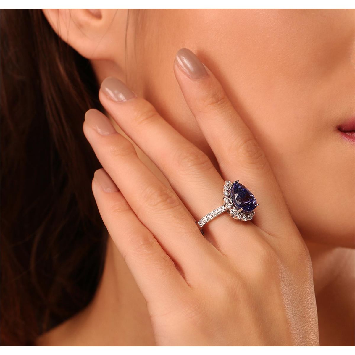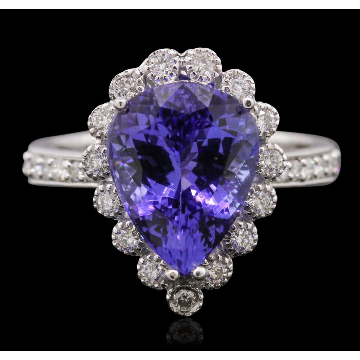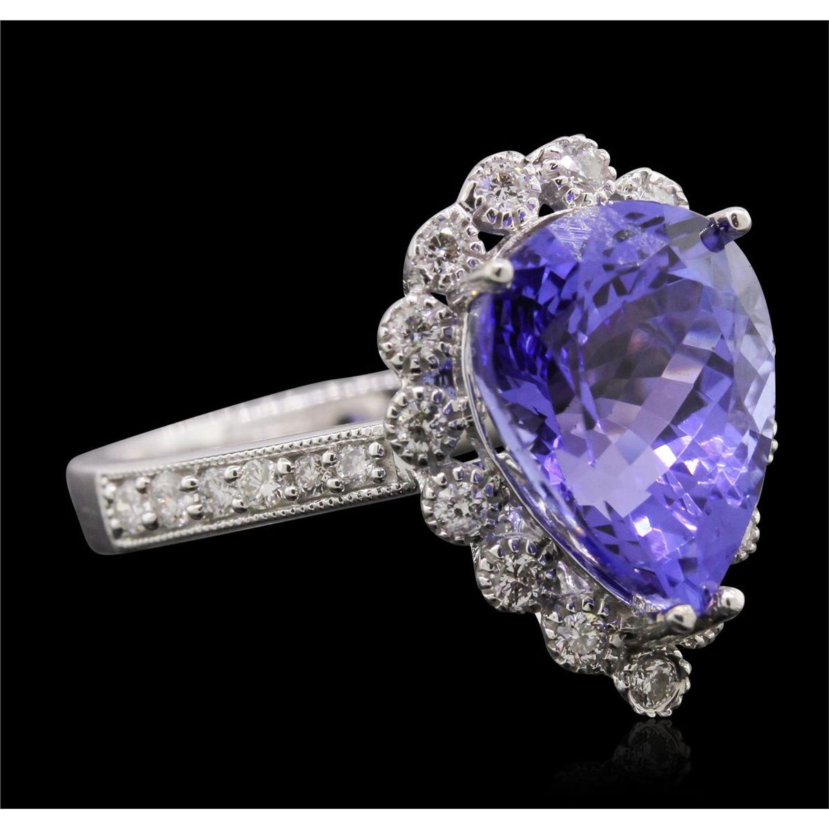 One electronically tested 14KT white gold Ladies cast ring with a bright polish finish. Condition is new. Identified with markings of "14K". Containing: One prong set pear modified brilliant cut natural tanzanite, measuring 12.00 x 9.60 x 6.23mm, approximate weight of 4.81ct., clarity is eye clean, type I, medium, moderately strong, bluish violet color, (GIA bV 5/4), cut is very good. Colored gemstones are presumed to have been subjected to commonly used color/clarity enhancement processes. Twenty-Seven prong set round brilliant cut diamonds, measuring 1.60 - 1.30 x 0.87mm (depth est.) approximate. Total Weight of 27 Stones = 0.30ct. Clarity: I-1 to I-2. Color: I - J, Cut is Good. Total Weight of Colored Stones 4.81ct. Total Weight of Diamonds 0.30ct. Total Weight of Ring 4.80 Grams. GGL Appraised at $8,685.00.