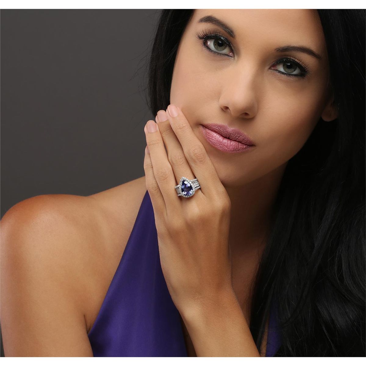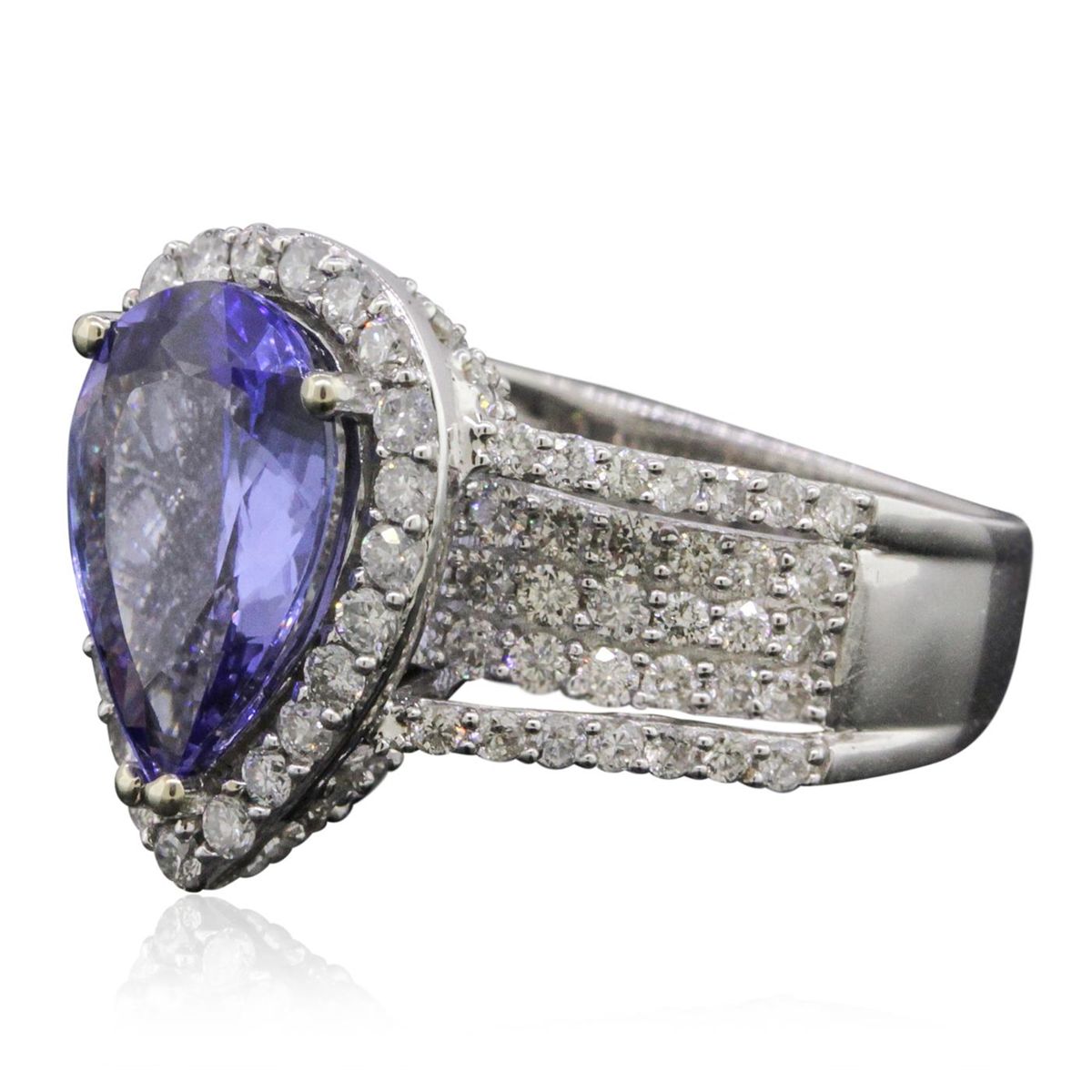 One electronically tested 14KT white gold ladies combination cast & assembled tanzanite and diamond ring with a split shank with a bright polish finish. Identified with markings of "14K". Condition is new. Containing: One prong set pear modified brilliant cut natural tanzanite, measuring 13.50 x 9.04 x 5.88mm, approximate weight of 4.81ct., clarity is eye clean, type I, medium, very slightly grayish, violet color, (GIA V 5/3), cut is good. One Hundred Twelve prong set round brilliant cut diamonds, measuring 1.50 - 1.10 x 0.78mm (depth est.) approximate total weight of 112 Stones = 0.90ct. Clarity: SI-1 to I-1. Color: J, Cut is Good. Colored gemstones are presumed to have been subjected to commonly used enhancement processes. All diamonds and colored gemstones are graded in the mounting, unless otherwise stated. Total Weight of Colored Stones 4.81ct. Total Weight of Diamonds 0.90ct. Total Weight of Ring 7.90 grams. GGL Appraised at $11,525.00.