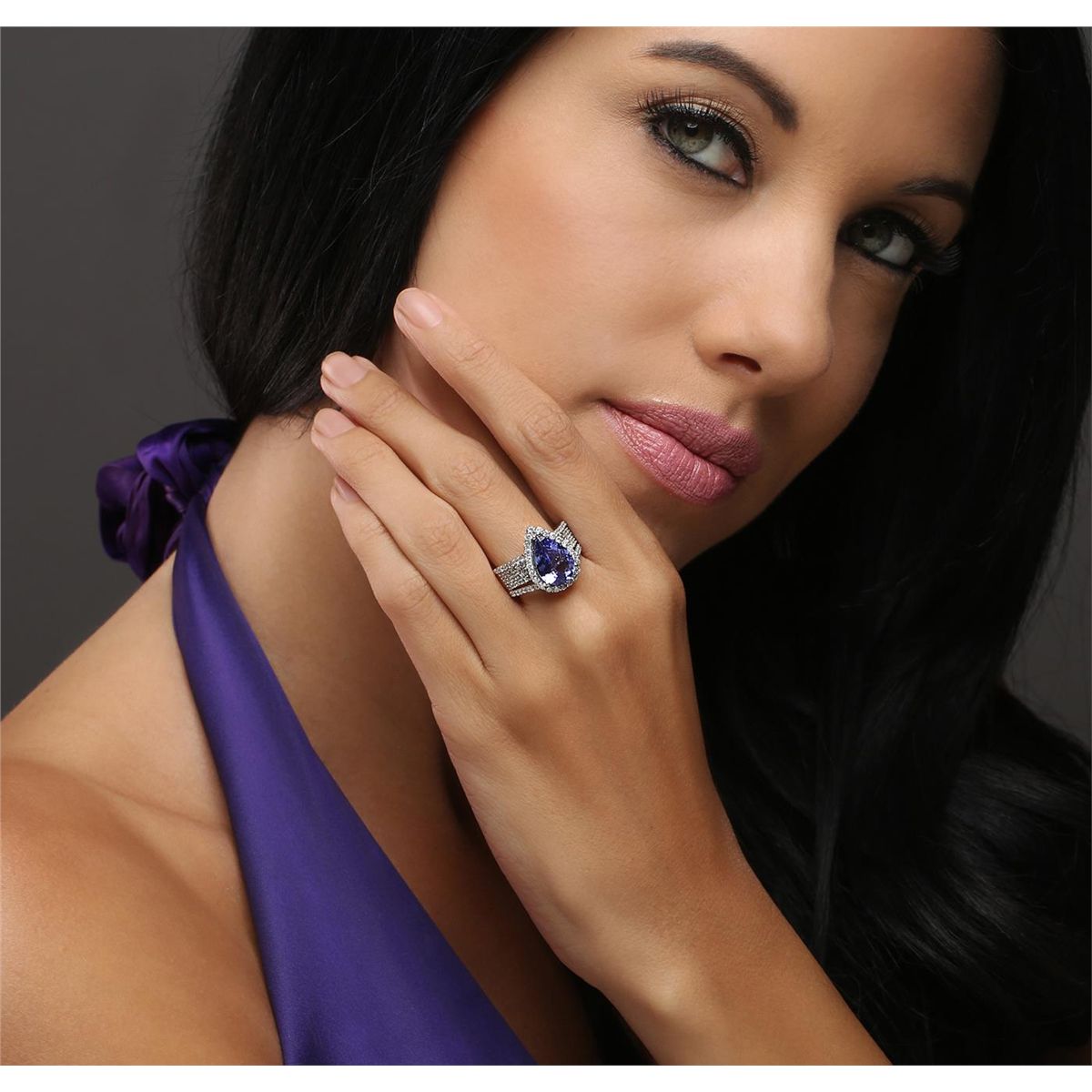 One electronically tested 14KT white gold ladies combination cast & assembled tanzanite and diamond ring with a split shank with a bright polish finish. Identified with markings of "14K". Condition is new. Containing: One prong set pear modified brilliant cut natural tanzanite, measuring 13.50 x 9.04 x 5.88mm, approximate weight of 4.81ct., clarity is eye clean, type I, medium, very slightly grayish, violet color, (GIA V 5/3), cut is good. One Hundred Twelve prong set round brilliant cut diamonds, measuring 1.50 - 1.10 x 0.78mm (depth est.) approximate total weight of 112 Stones = 0.90ct. Clarity: SI-1 to I-1. Color: J, Cut is Good. Colored gemstones are presumed to have been subjected to commonly used enhancement processes. All diamonds and colored gemstones are graded in the mounting, unless otherwise stated. Total Weight of Colored Stones 4.81ct. Total Weight of Diamonds 0.90ct. Total Weight of Ring 7.90 grams. GGL Appraised at $11,525.00.