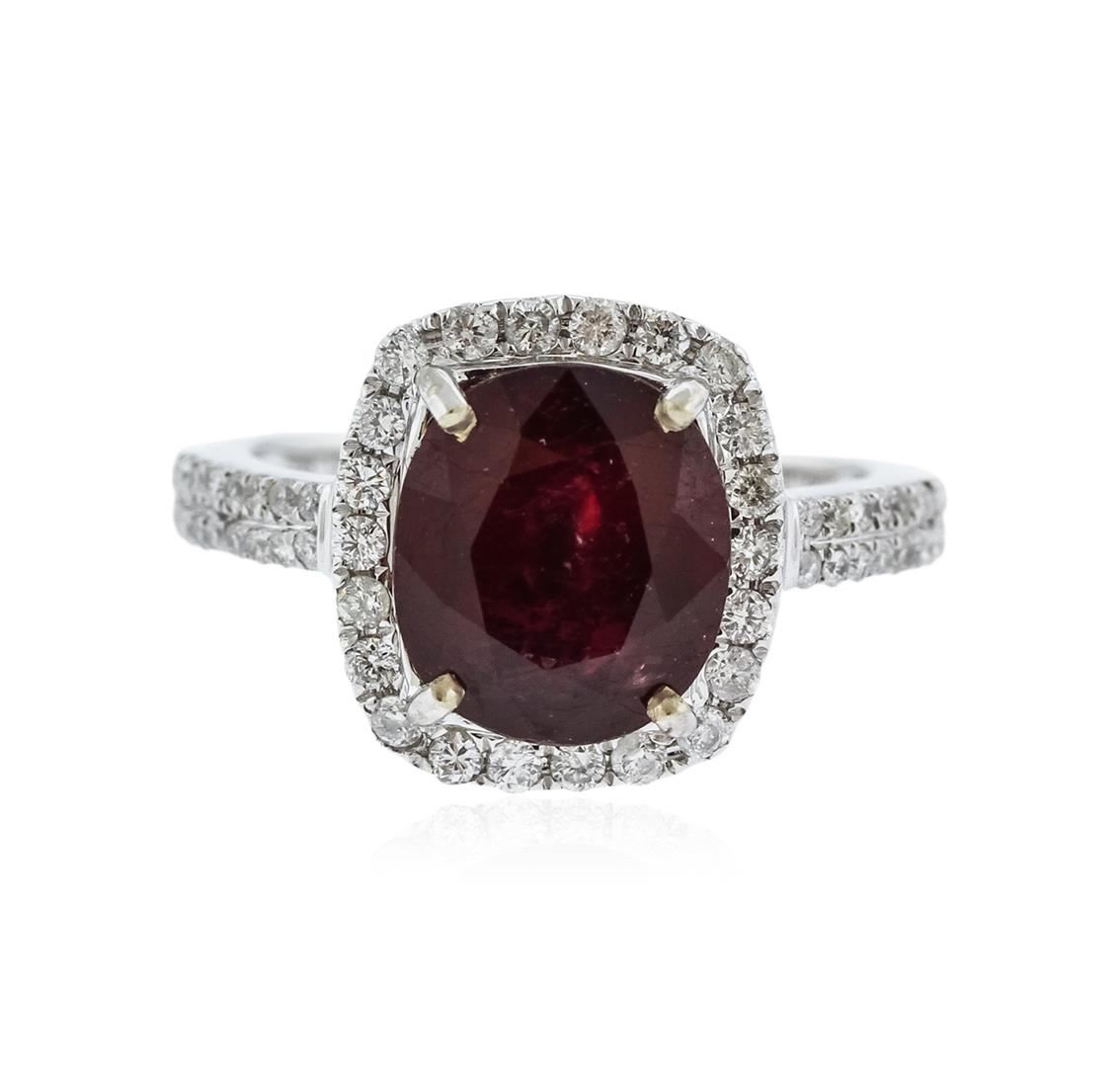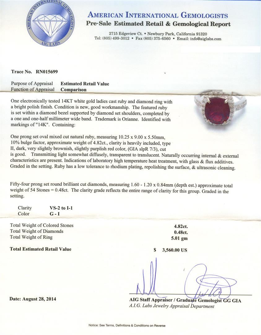 One electronically tested 14KT white gold ladies cast ruby and diamond ring with a bright polish finish. The featured ruby is set within a diamond bezel supported by diamond set shoulders, completed by a one and one-half millimeter wide band. Trademark is Orianne. Identified with markings of "14K". Condition is new, good workmanship. Containing: One prong set oval mixed cut natural ruby, measuring 10.25 x 9.00 x 5.50mm, 10%. bulge factor, approximate weight of 4.82ct., clarity is heavily included, type II, dark, very slightly brownish, slightly purplish red color, (GIA slpR 7/3), cut is good. Transmitting light somewhat diffusely, transparent to translucent. Naturally occurring internal & external characteristics are present. Indications of laboratory high temperature heat treatment, with glass & flux additives. Graded in the setting. Ruby has a low tolerance to rhodium plating, repolishing the surface, & ultrasonic cleaning. Fifty-Four prong set round brilliant cut diamonds, measuring 1.60 - 1.20 x 0.84mm (depth est.) approximate total weight of 54 Stones = 0.48ct. The clarity grade reflects the entire range of clarity for this group. Graded in the setting. Clarity: VS-2 to I-1. Color: G - I. Total Weight of Colored Stones 4.82ct. Total Weight of Diamonds 0.48ct. Total Weight of Ring 5.01 grams. AIG Appraised at $3,560.00.