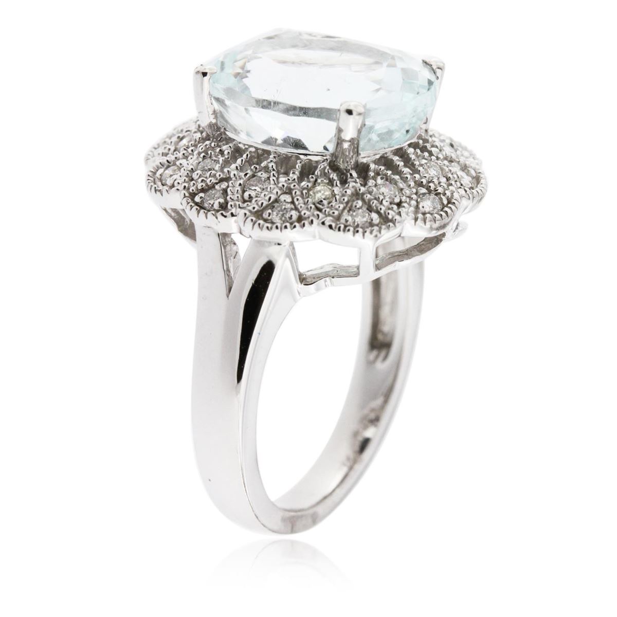 One electronically tested 14KT white gold ladies cast aquamarine and diamond ring with a bright polish finish. Identified with markings of "14K". Condition is new. Containing: One prong set oval modified brilliant cut natural aquamarine, measuring 13.00 x 10.00 x 6.50mm, approximate weight of 4.83ct., clarity is eye clean, type I, very light, slightly grayish, blue color, (GIA B 2/2), cut is good. Twenty-Four prong set round brilliant cut diamonds, measuring 1.30 - 1.30 x 0.78mm (depth est.) approximate total weight of 24 Stones = 0.19ct. Clarity: SI-2 to I-1. Color: H - I. Colored gemstones are presumed to have been subjected to commonly used enhancement processes. All diamonds and colored gemstones are graded in the mounting, unless otherwise stated. Total Weight of Colored Stones 4.83ct. Total Weight of Diamonds 0.19ct. Total Weight of Ring 8.10 grams. GGL Appraised at $3,840.00.