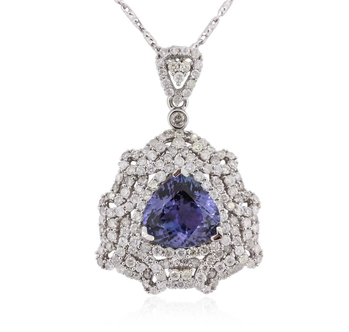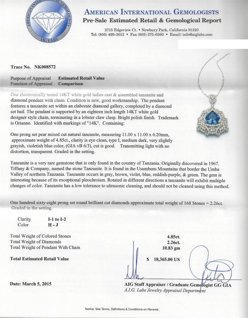 One electronically tested 14KT white gold ladies cast & assembled tanzanite and diamond pendant with chain. The pendant features a tanzanite set within an elaborate diamond gallery, completed by a diamond set bail. The pendant is supported by an eighteen inch length 14KT white gold designer style chain, terminating in a lobster claw clasp. Bright polish finish. Trademark is Orianne. Identified with markings of "14K". Condition is new, good workmanship. Containing: One prong set pear mixed cut natural tanzanite, measuring 11.00 x 11.00 x 6.20mm, approximate weight of 4.85ct., clarity is eye clean, type I, medium dark, very slightly grayish, violetish blue color, (GIA vB 6/3), cut is good. Transmitting light with no distortion, transparent. Graded in the setting. Tanzanite is a very rare gemstone that is only found in the country of Tanzania. Originally discovered in 1967. Tiffany & Company, named the stone Tanzanite. It is found in the Usumburu Mountains that border the Umba Valley of northern Tanzania. Tanzanite occurs in gray, brown, violet, blue, reddish-purple, & green. The gem is interesting because of its exceptional pleochroism. Rotated in different directions a tanzanite will exhibit multiple changes of color. Tanzanite has a low tolerance to ultrasonic cleaning, and should not be cleaned using this method. One Hundred Sixty-Eight prong set round brilliant cut diamonds approximate total weight of 168 Stones = 2.26ct. Graded in the setting. Clarity: I-1 to I-2. Color: H - J. Total Weight of Colored Stones 4.85ct. Total Weight of Diamonds 2.26ct. Total Weight of Pendant With Chain 10.83gm. AIG Appraised at $18,365.00.