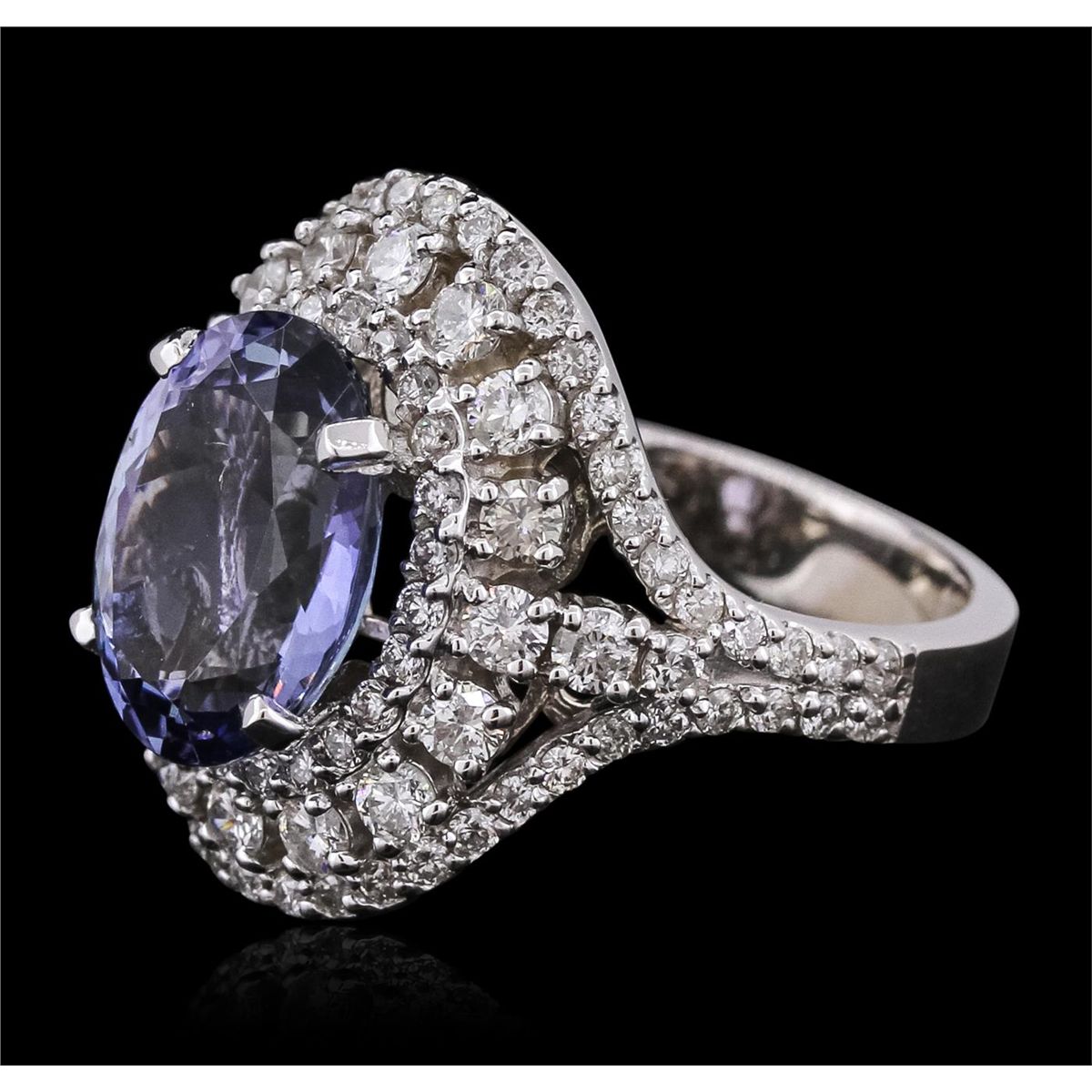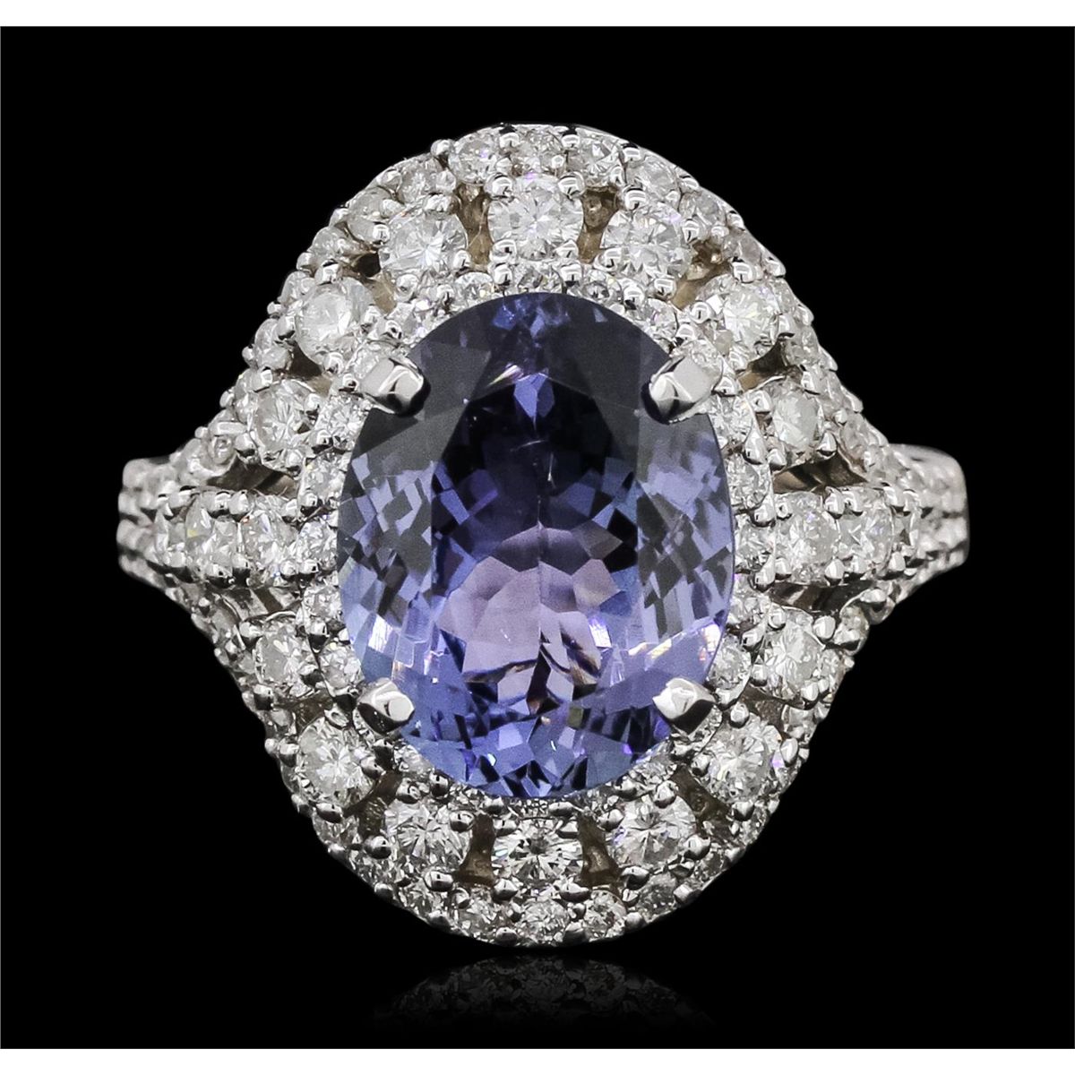 One electronically tested 14KT white gold ladies cast tanzanite and diamond ring with a bright polish finish. The featured tanzanite is set within tiered diamond bezels supported by diamond set shoulders, completed by a three and one-half millimeter wide band. Identified with markings of "K14". Condition is new, good workmanship. Containing: One prong set oval mixed cut natural tanzanite, measuring 12.25 x 9.60 x 5.75mm, 6% bulge factor, approximate weight of 4.87ct., clarity is eye clean, type I, medium, very slightly grayish, bluish violet color, (GIA bV 5/3), cut is good. Transmitting light with no distortion, transparent. Graded in the setting. Tanzanite is a very rare gemstone that is only found in the country of Tanzania. Originally discovered in 1967. Tiffany & Company, named the stone Tanzanite. It is found in the Usumburu Mountains that border the Umba Valley of northern Tanzania. Tanzanite occurs in gray, brown, violet, blue, reddish-purple, & green. The gem is interesting because of its exceptional pleochroism. Rotated in different directions a tanzanite will exhibit multiple changes of color. Tanzanite has a low tolerance to ultrasonic cleaning, and should not be cleaned using this method. Eighteen prong set round brilliant cut diamonds, measuring 2.30 - 2.20 x 1.35mm (depth est.) approximate total weight of 18 Stones = 0.84ct. Graded in the setting. Clarity: SI-1 to I-1. Color: H - J Eighty prong set round brilliant cut diamonds, measuring 1.60 - 1.40 x 0.90mm (depth est.) approximate total weight of 80 Stones = 1.08ct. Graded in the setting. Clarity: SI-1 to I-1. Color: H - J. Total Weight of Colored Stones 4.87ct. Total Weight of Diamonds 1.92ct. Total Weight of Ring 8.88 grams. AIG Appraised at $18,065.00.