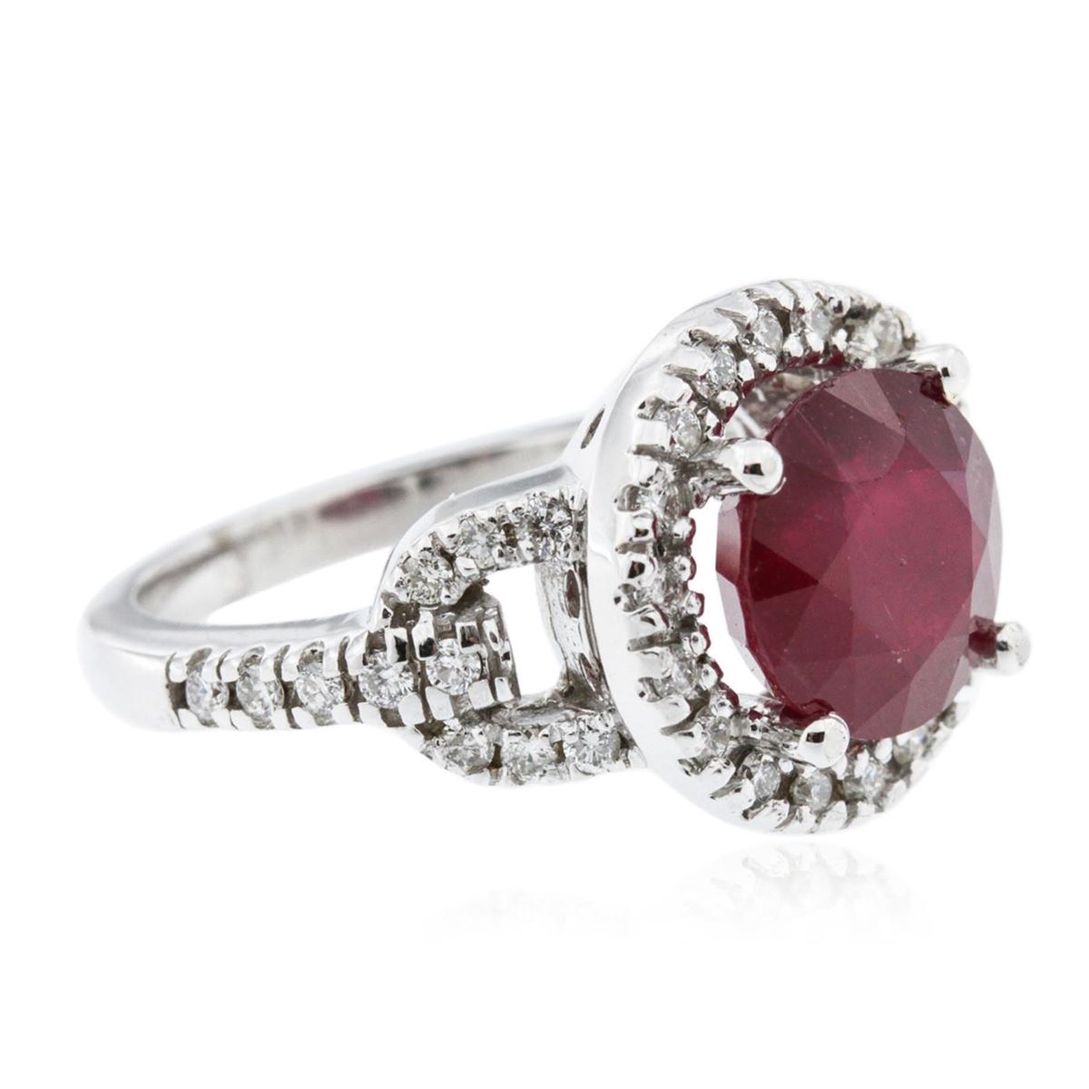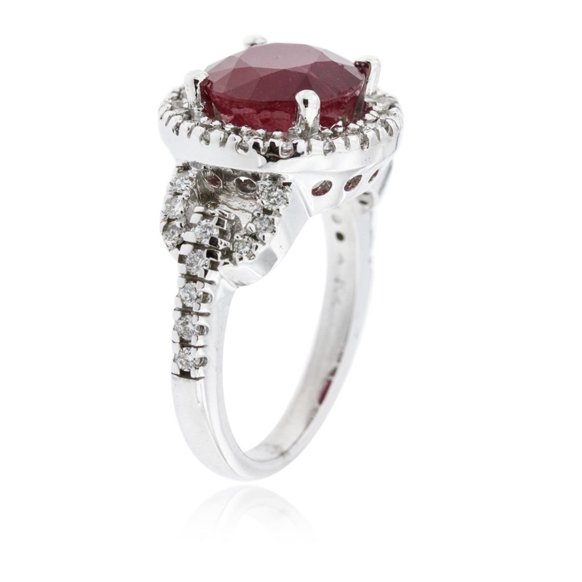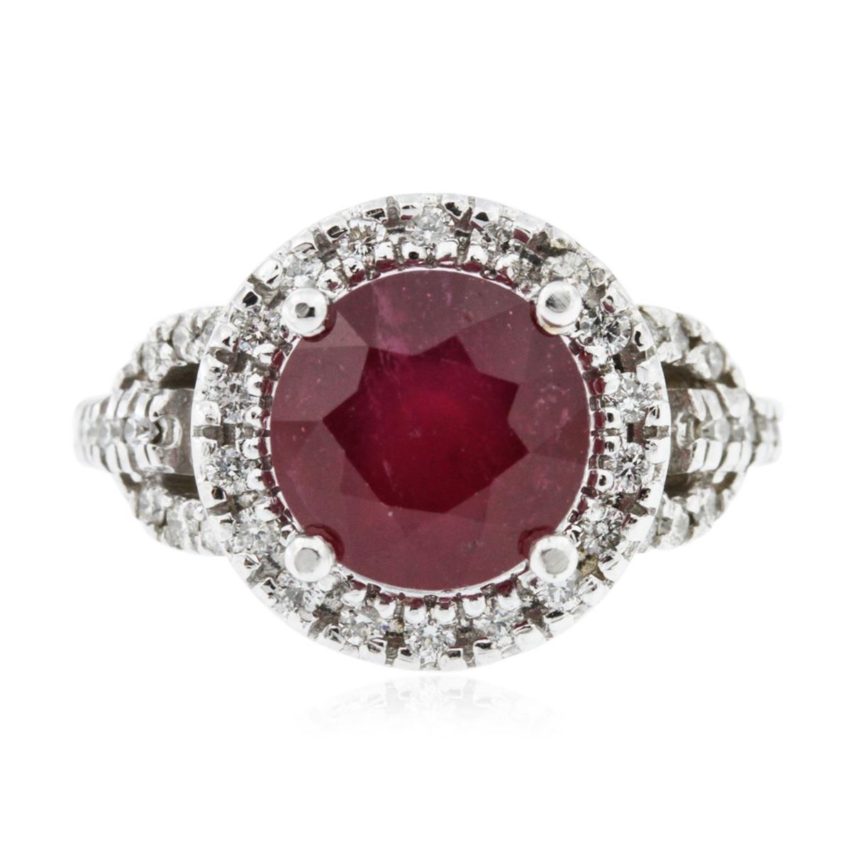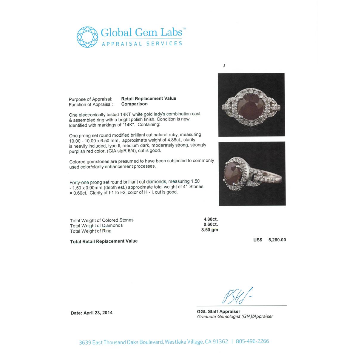One electronically tested 14KT white gold Ladies combination cast & assembled ring with a bright polish finish. Condition is new. Identified with markings of "14K". Containing: One prong set round modified brilliant cut natural ruby, measuring 10.00 - 10.00 x 6.50 mm, approximate weight of 4.88ct., clarity is heavily included, type II, medium dark, moderately strong, strongly purplish red color, (GIA stpR 6/4), cut is good. Colored gemstones are presumed to have been subjected to commonly used color/clarity enhancement processes. Forty-One prong set round brilliant cut diamonds, measuring 1.50 - 1.50 x 0.90mm (depth est.) approximate. Total Weight of 41 Stones = 0.60ct. Clarity: I-1 to I-2. Color: H - I, Cut is Good. Total Weight of Colored Stones 4.88ct. Total Weight of Diamonds 0.60ct. Total Weight of Ring 8.50 grams. GGL Appraised at $5,260.00.