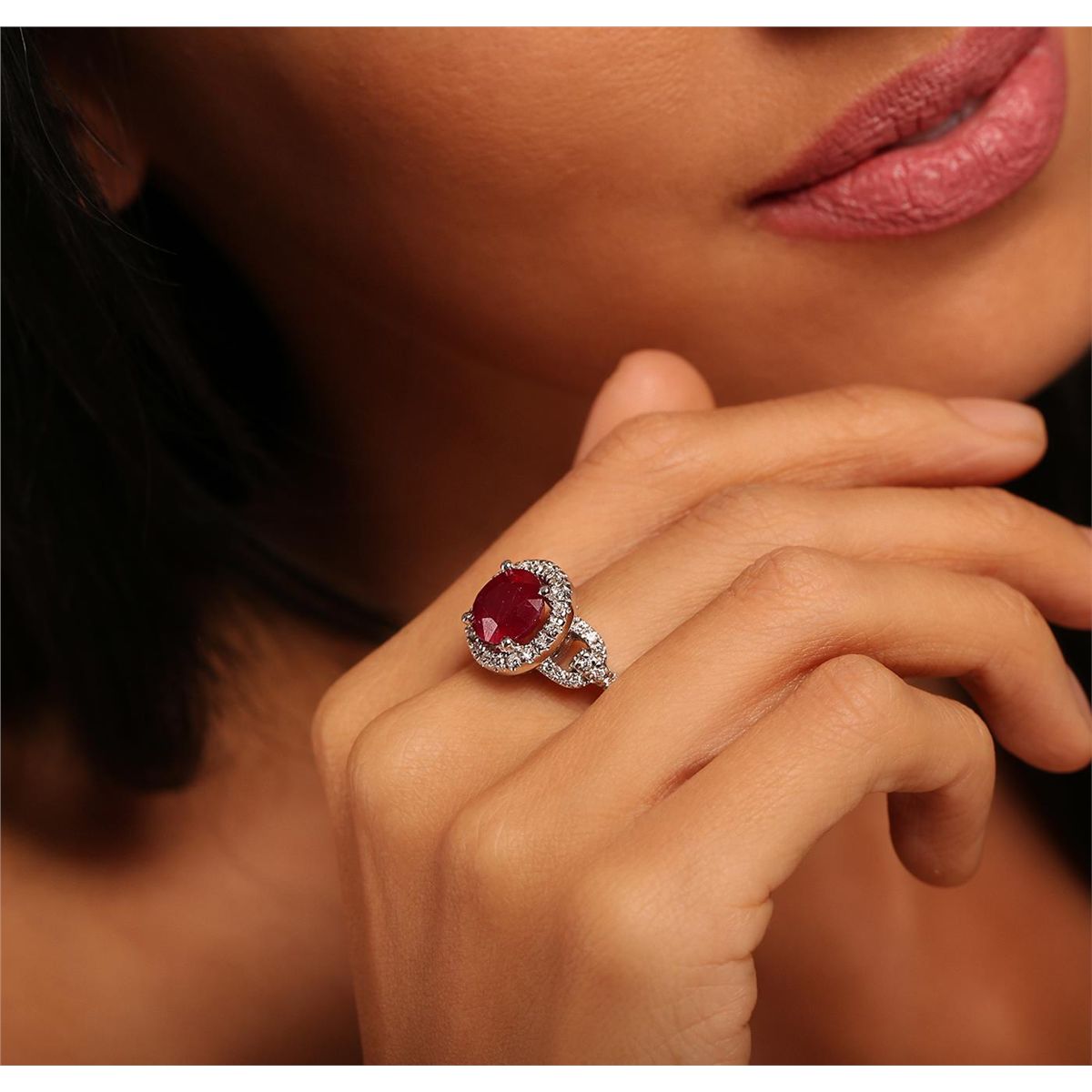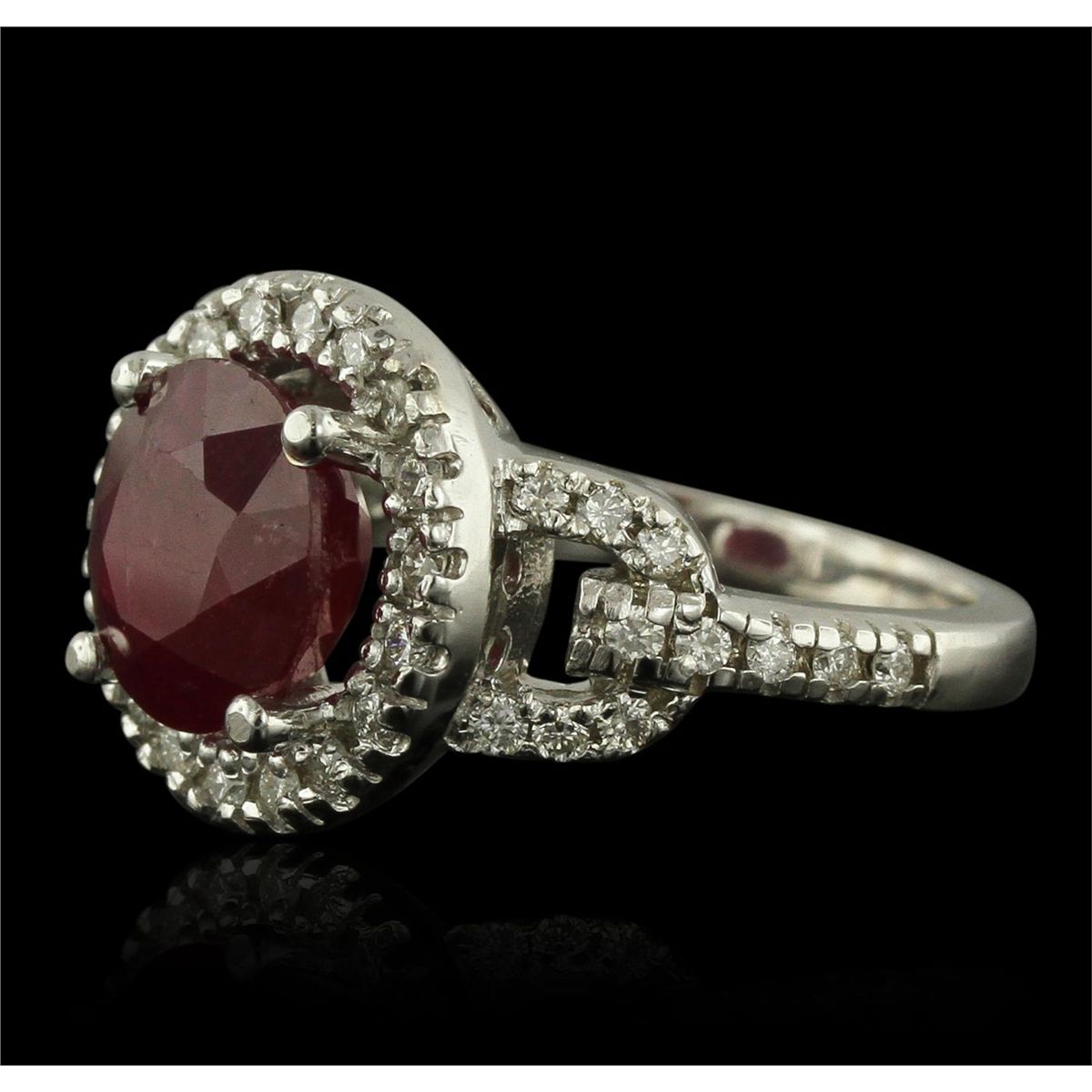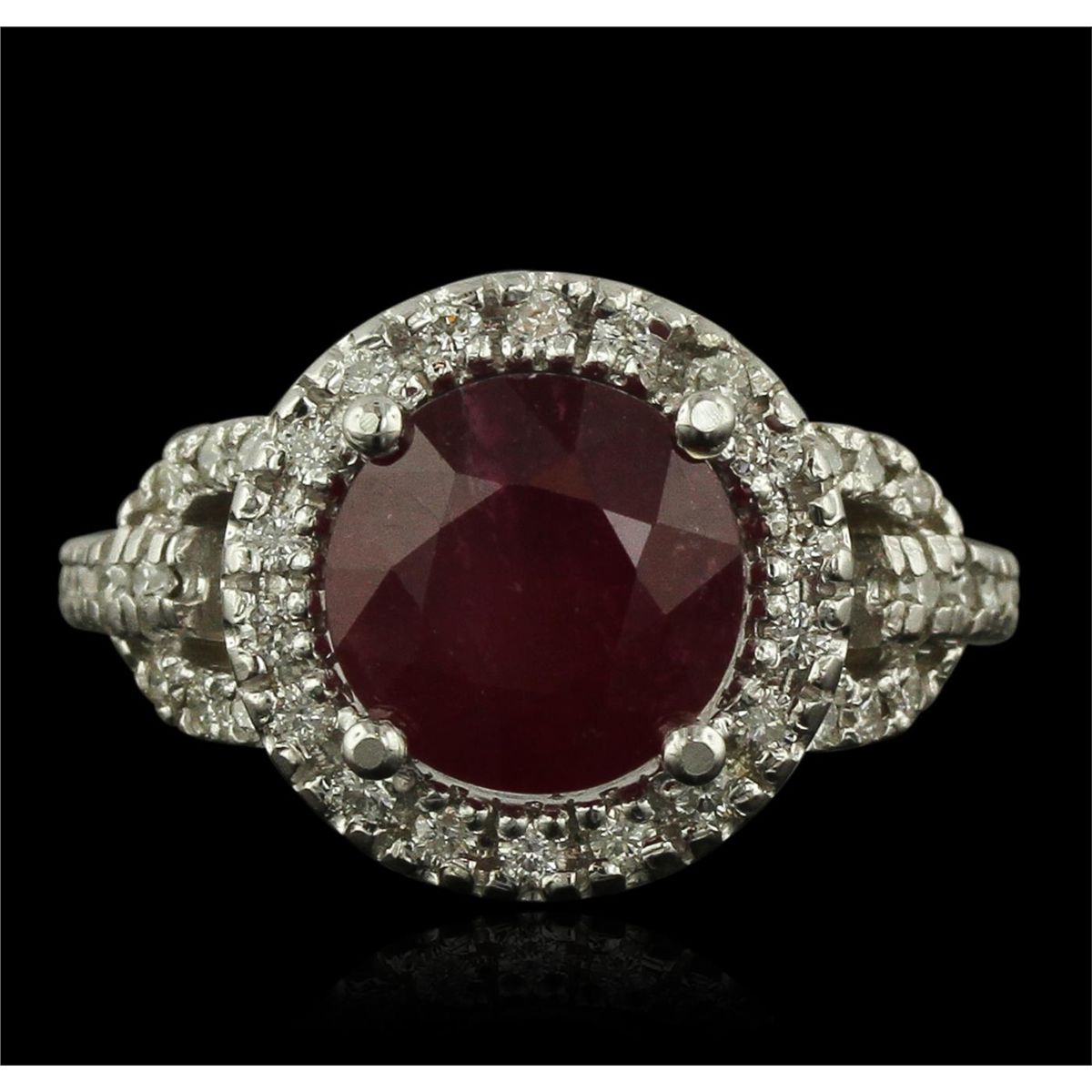 One electronically tested 14KT white gold Ladies combination cast & assembled ring with a bright polish finish. Condition is new. Identified with markings of "14K". Containing: One prong set round modified brilliant cut natural ruby, measuring 10.00 - 10.00 x 6.50 mm, approximate weight of 4.88ct., clarity is heavily included, type II, medium dark, moderately strong, strongly purplish red color, (GIA stpR 6/4), cut is good. Colored gemstones are presumed to have been subjected to commonly used color/clarity enhancement processes. Forty-One prong set round brilliant cut diamonds, measuring 1.50 - 1.50 x 0.90mm (depth est.) approximate. Total Weight of 41 Stones = 0.60ct. Clarity: I-1 to I-2. Color: H - I, Cut is Good. Total Weight of Colored Stones 4.88ct. Total Weight of Diamonds 0.60ct. Total Weight of Ring 8.50 grams. GGL Appraised at $5,260.00.
