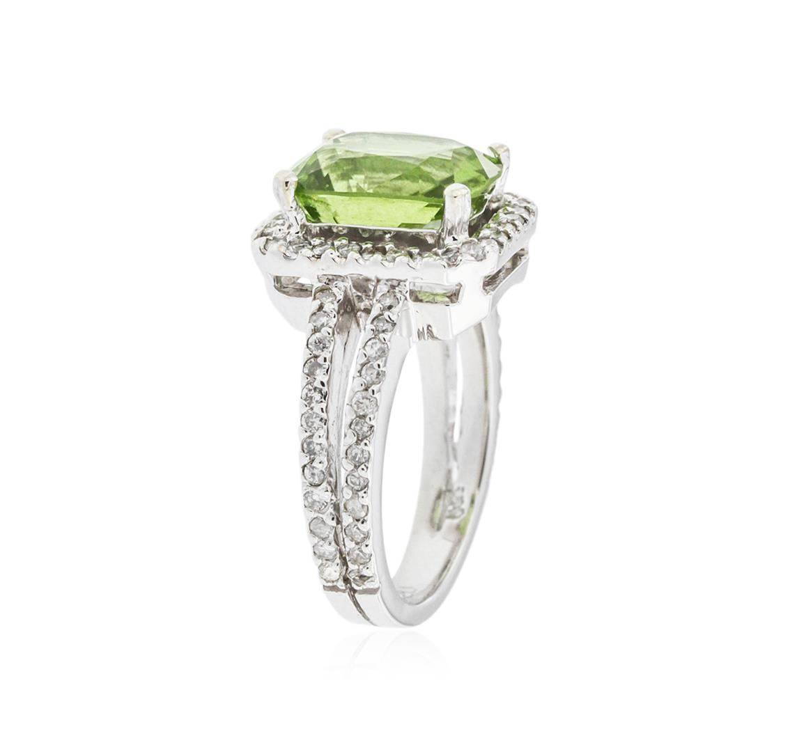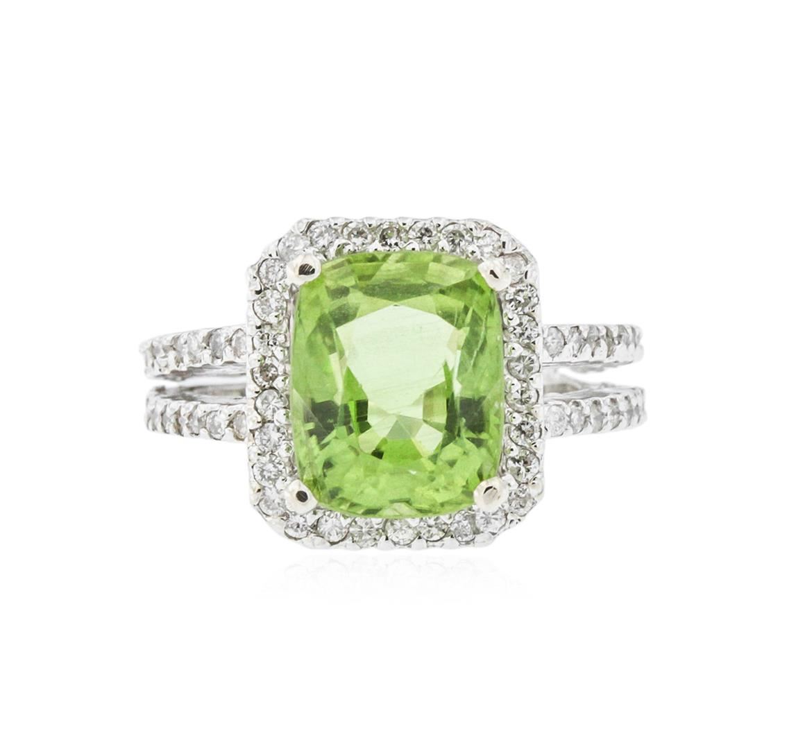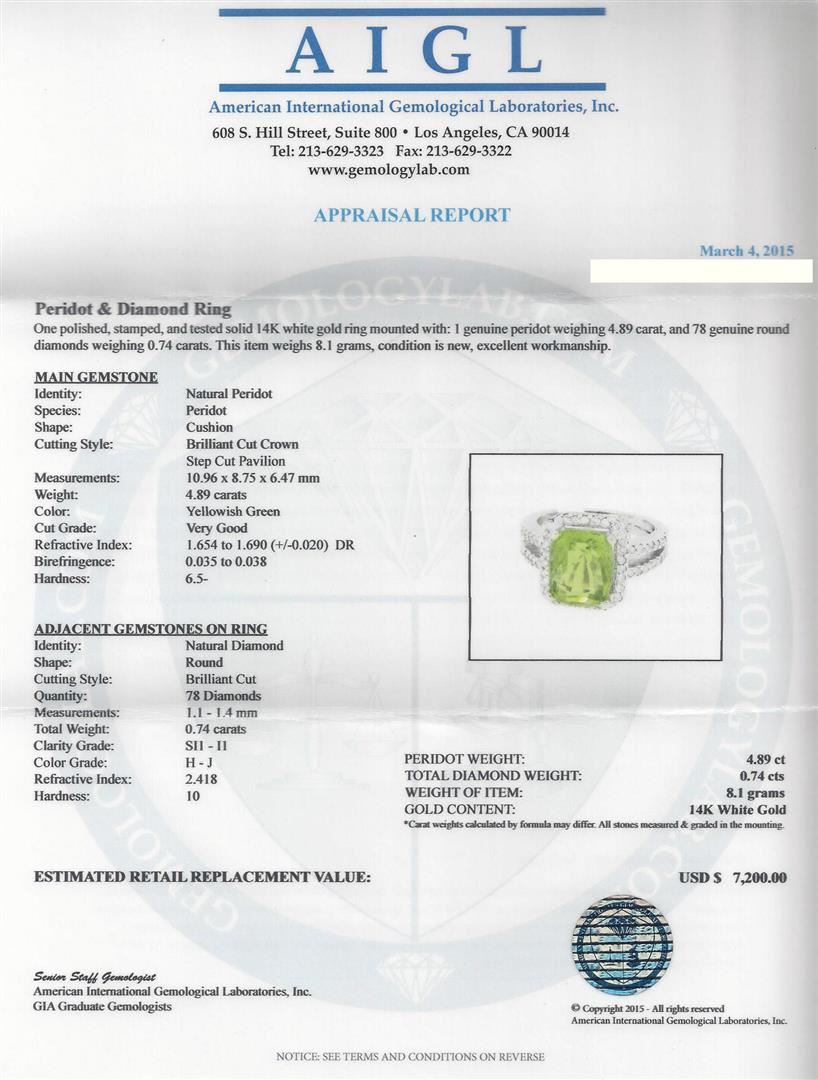 One polished, stamped, and tested solid 14K white gold ring mounted with: 1 genuine peridot weighing 4.89 carat, and 78 genuine round diamonds weighing 0.74 carats. This item weighs 8.1 grams, condition is new, excellent workmanship. MAIN GEMSTONE: Identity: Natural Peridot. Species: Peridot. Shape: Cushion. Cutting Style: Brilliant Cut Crown Step Cut Pavilion. Measurements: 10.96 x 8.75 x 6.47 mm. Weight: 4.89 carats. Color: Yellowish Green. Cut Grade: Very Good. Refractive Index: 1.654 to 1.690 (+/-0.020) DR. Birefringence: 0.035 to 0.038. Hardness: 6.5 - . ADJACENT GEMSTONES ON RING: Identity: Natural Diamond. Shape: Round. Cutting Style: Brilliant Cut. Quantity: 78 Diamonds. Measurements: 1.1 - 1.4 mm. Total Weight: 0.74 carats. Clarity Grade: SI1 - I1. Color Grade: H - J. Refractive Index: 2.418. Hardness: 10. Peridot Weight: 4.89 ct. Total Diamond Weight: 0.74 cts. Weight of Item: 8.1 grams. Gold Content: 14K White Gold. AIGL Appraised at $7,200.00.
