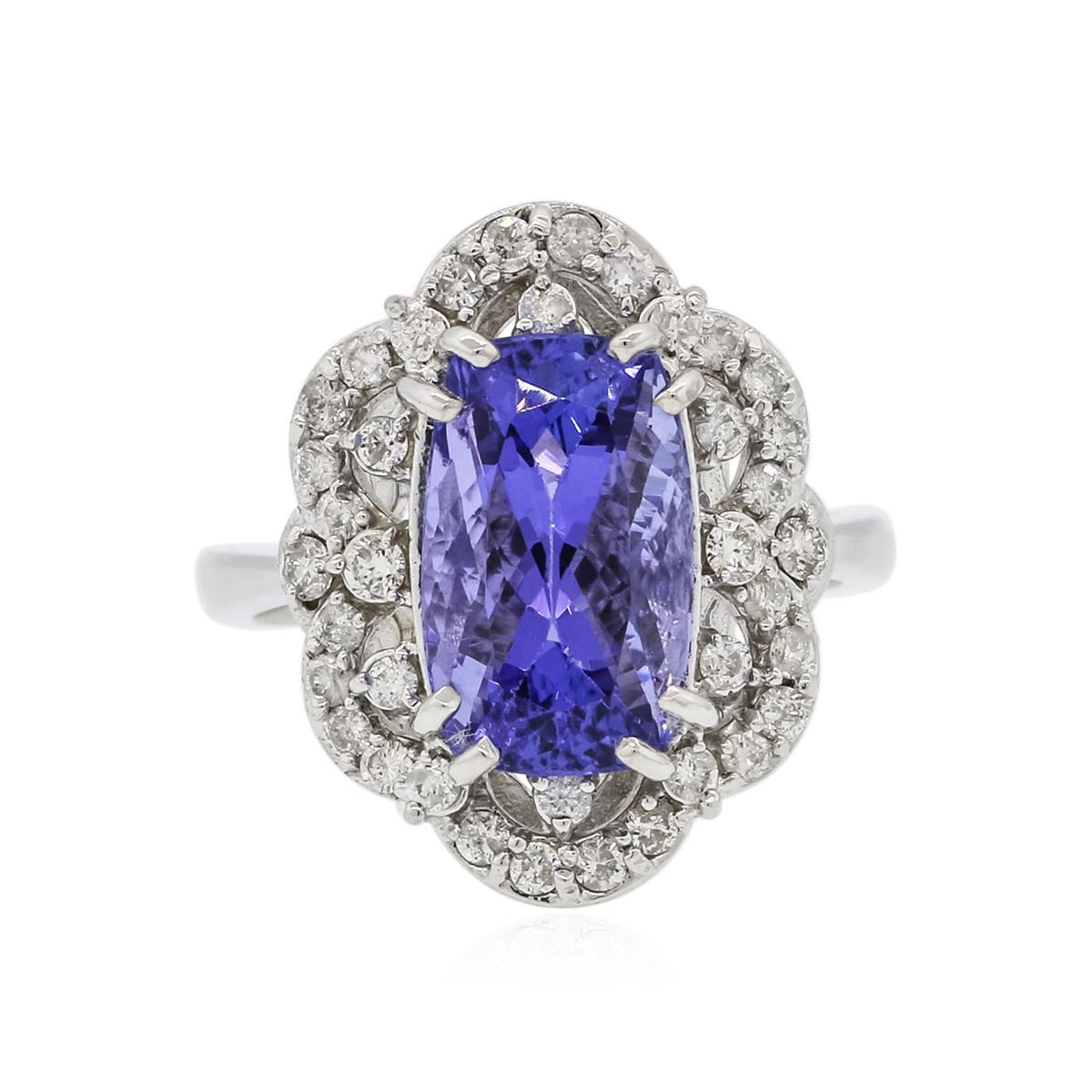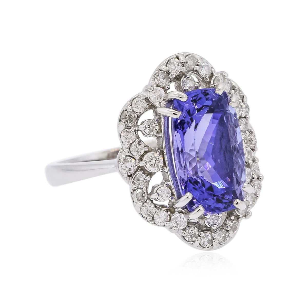 One electronically tested 14KT white gold ladies combination cast & assembled ring with a bright polish finish. Condition is new. Identified with markings of "K14". Containing: One prong set rectangular cushion modified brilliant cut natural tanzanite, measuring 12.40 x 7.57 x 6.62mm, approximate weight of 4.89ct., clarity is eye clean, type I, medium light, very slightly grayish, violet color, (GIA V 4/3), cut is good. Forty-Two prong set round brilliant cut diamonds, measuring 2.00 - 1.50 x 1.05mm (depth est.) approximate. Total Weight of 42 Stones = 0.85ct. Clarity: SI-2 to I-2. Color: I - J, Cut is Good. Colored gemstones are presumed to have been subjected to commonly used enhancement processes. All diamonds and colored gemstones are graded in the mounting, unless otherwise stated. Total Weight of Colored Stones 4.89ct. Total Weight of Diamonds 0.85ct. Total Weight of Ring 6.20 grams. GGL Appraised at $10,040.00.