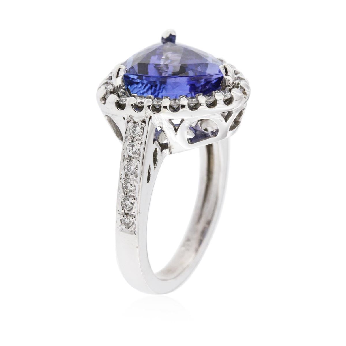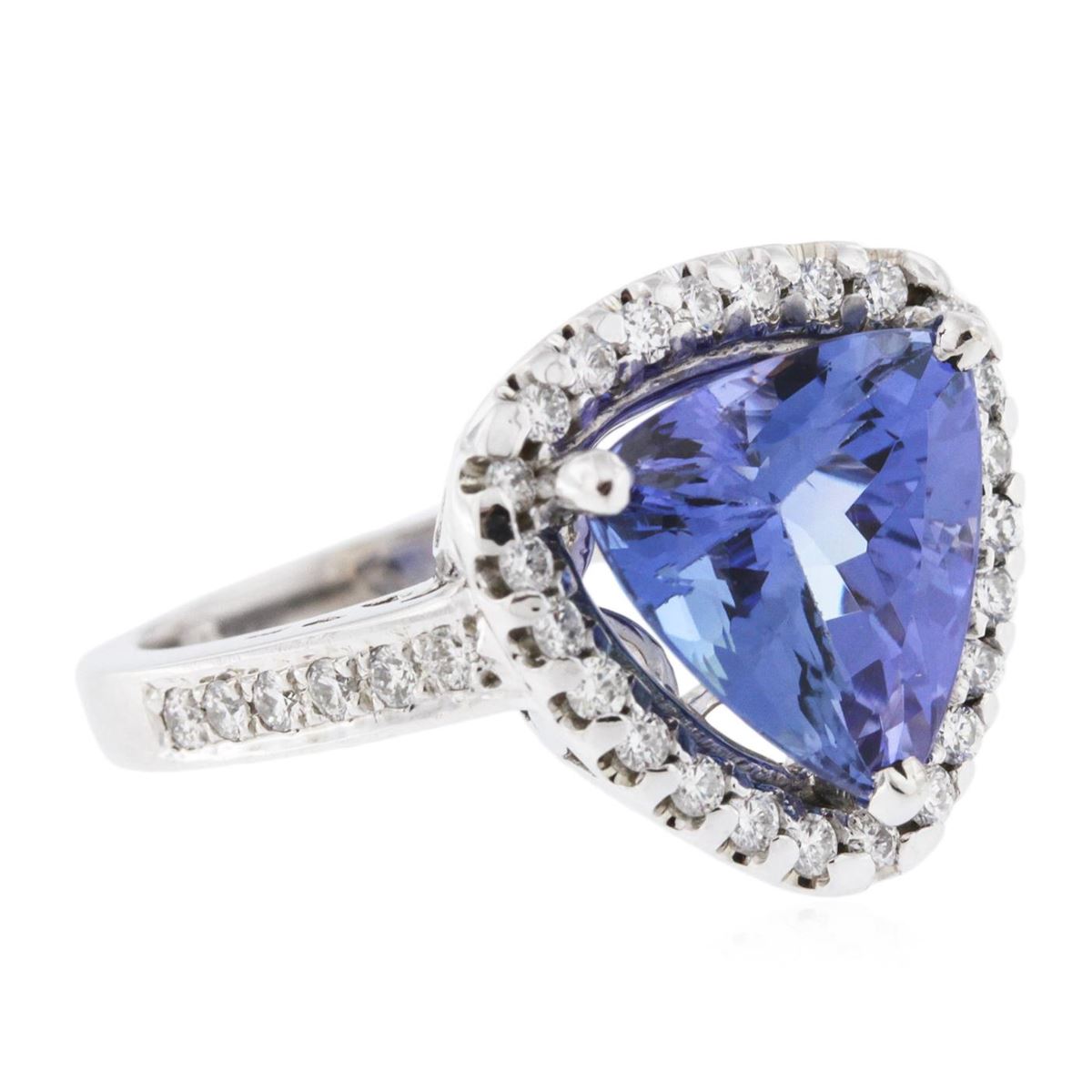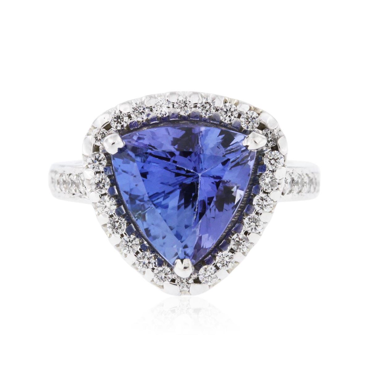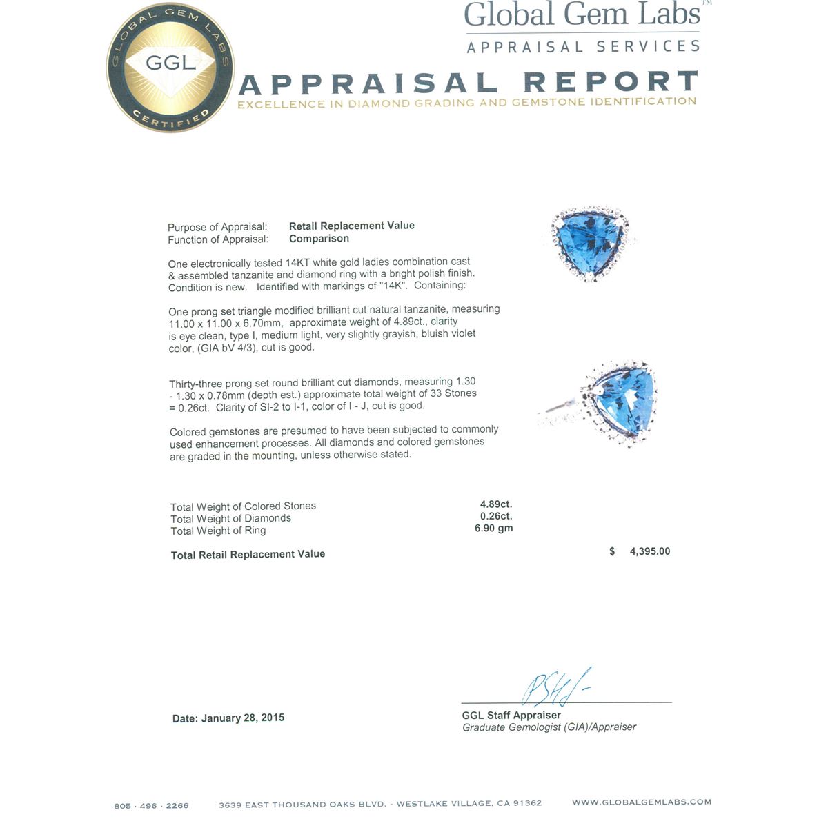 One electronically tested 14KT white gold ladies combination cast & assembled tanzanite and diamond ring with a bright polish finish. Identified with markings of "14K". Condition is new. Containing: One prong set triangle modified brilliant cut natural tanzanite, measuring 11.00 x 11.00 x 6.70mm, approximate weight of 4.89ct., clarity is eye clean, type I, medium light, very slightly grayish, bluish violet color, (GIA bV 4/3), cut is good. Thirty-Three prong set round brilliant cut diamonds, measuring 1.30 - 1.30 x 0.78mm (depth est.) approximate total weight of 33 Stones = 0.26ct. Clarity: SI-2 to I-1. Color: I - J, Cut is Good. Colored gemstones are presumed to have been subjected to commonly used enhancement processes. All diamonds and colored gemstones are graded in the mounting, unless otherwise stated. Total Weight of Colored Stones 4.89ct. Total Weight of Diamonds 0.26ct. Total Weight of Ring 6.90 grams. GGL Appraised at $4,395.00.