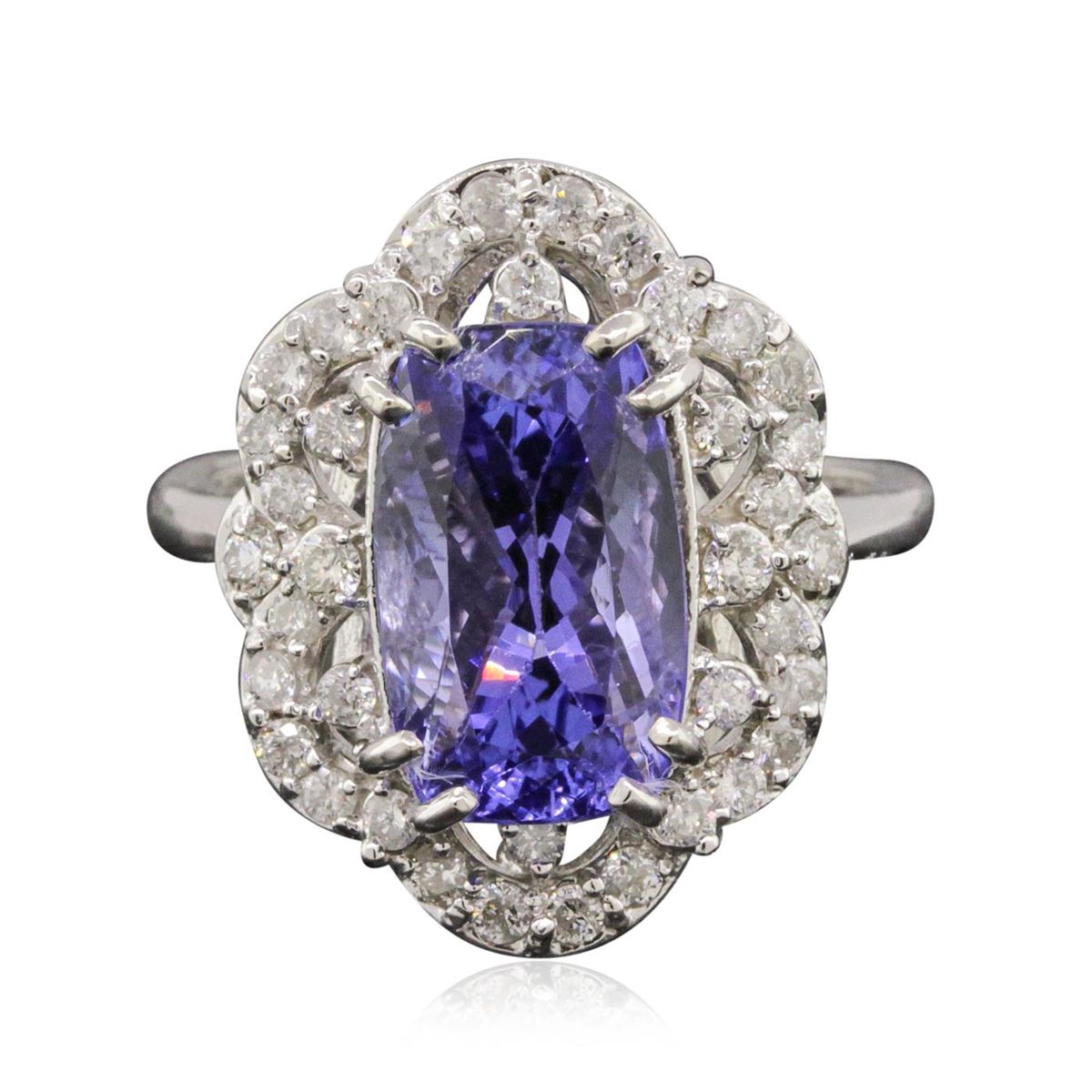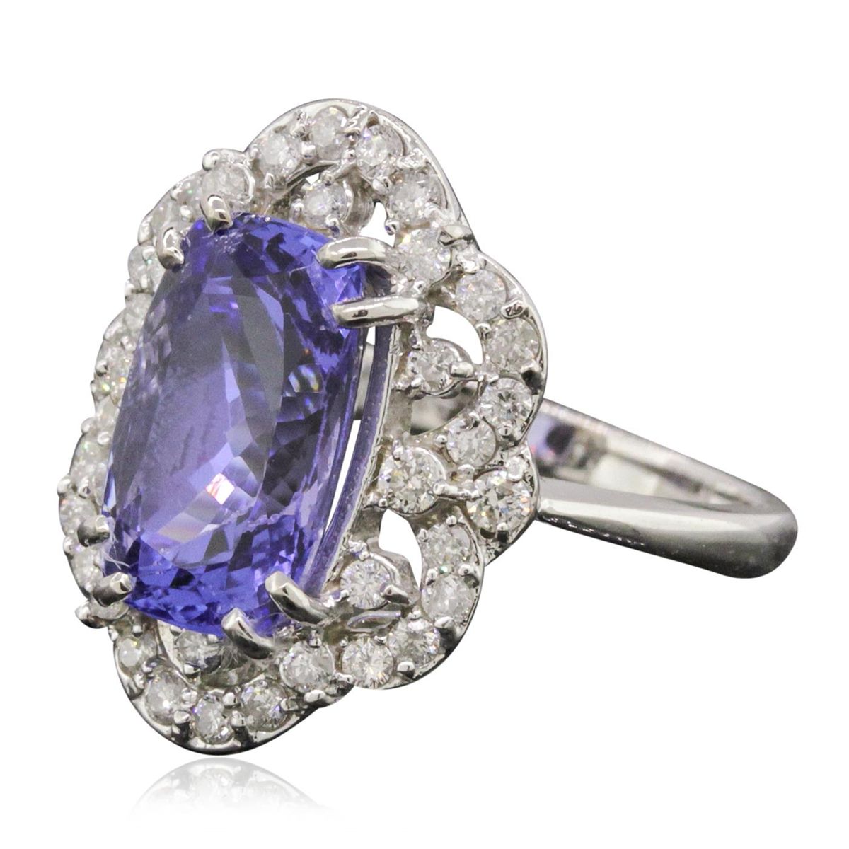 One electronically tested 14KT white gold ladies combination cast & assembled ring with a bright polish finish. Condition is new. Identified with markings of "K14". Containing: One prong set rectangular cushion modified brilliant cut natural tanzanite, measuring 12.40 x 7.57 x 6.62mm, approximate weight of 4.89ct., clarity is eye clean, type I, medium light, very slightly grayish, violet color, (GIA V 4/3), cut is good. Forty-Two prong set round brilliant cut diamonds, measuring 2.00 - 1.50 x 1.05mm (depth est.) approximate. Total Weight of 42 Stones = 0.85ct. Clarity: SI-2 to I-2. Color: I - J, Cut is Good. Colored gemstones are presumed to have been subjected to commonly used enhancement processes. All diamonds and colored gemstones are graded in the mounting, unless otherwise stated. Total Weight of Colored Stones 4.89ct. Total Weight of Diamonds 0.85ct. Total Weight of Ring 6.20 grams. GGL Appraised at $10,040.00.