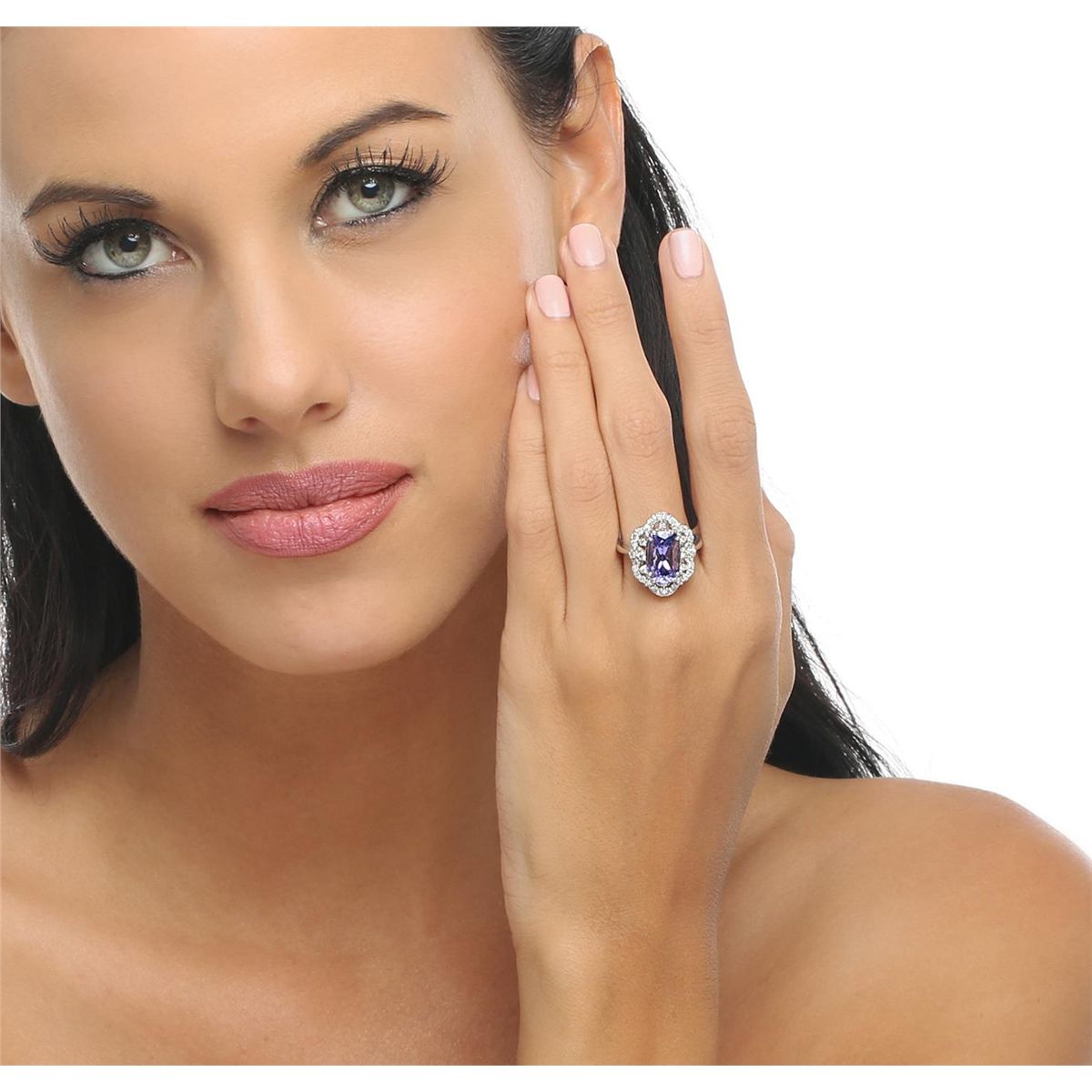 One electronically tested 14KT white gold ladies combination cast & assembled ring with a bright polish finish. Condition is new. Identified with markings of "K14". Containing: One prong set rectangular cushion modified brilliant cut natural tanzanite, measuring 12.40 x 7.57 x 6.62mm, approximate weight of 4.89ct., clarity is eye clean, type I, medium light, very slightly grayish, violet color, (GIA V 4/3), cut is good. Forty-Two prong set round brilliant cut diamonds, measuring 2.00 - 1.50 x 1.05mm (depth est.) approximate. Total Weight of 42 Stones = 0.85ct. Clarity: SI-2 to I-2. Color: I - J, Cut is Good. Colored gemstones are presumed to have been subjected to commonly used enhancement processes. All diamonds and colored gemstones are graded in the mounting, unless otherwise stated. Total Weight of Colored Stones 4.89ct. Total Weight of Diamonds 0.85ct. Total Weight of Ring 6.20 grams. GGL Appraised at $10,040.00.
