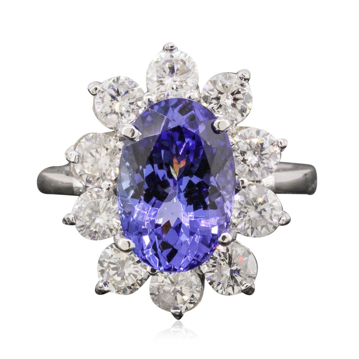 One electronically tested 14KT white gold ladies combination cast & assembled ring with a bright polish finish. Condition is new. Identified with markings of "K14". Containing: One prong set oval modified brilliant cut natural tanzanite, measuring 12.40 x 8.40 x 6.75mm, approximate weight of 4.89ct., clarity is eye clean, type I, medium, moderately strong, bluish violet color, (GIA bV 5/4), cut is good. Ten prong set round brilliant cut diamonds, measuring 3.80 - 3.80 x 2.28mm (depth est.) approximate total weight of 10 Stones = 2.01ct. Clarity: SI-2 to I-1. Color: J, Cut is Good. Colored gemstones are presumed to have been subjected to commonly used enhancement processes. All diamonds and colored gemstones are graded in the mounting, unless otherwise stated. Total Weight of Colored Stones 4.89ct. Total Weight of Diamonds 2.01ct. Total Weight of Ring 7.00 grams. GGL Appraised at $15,305.00.