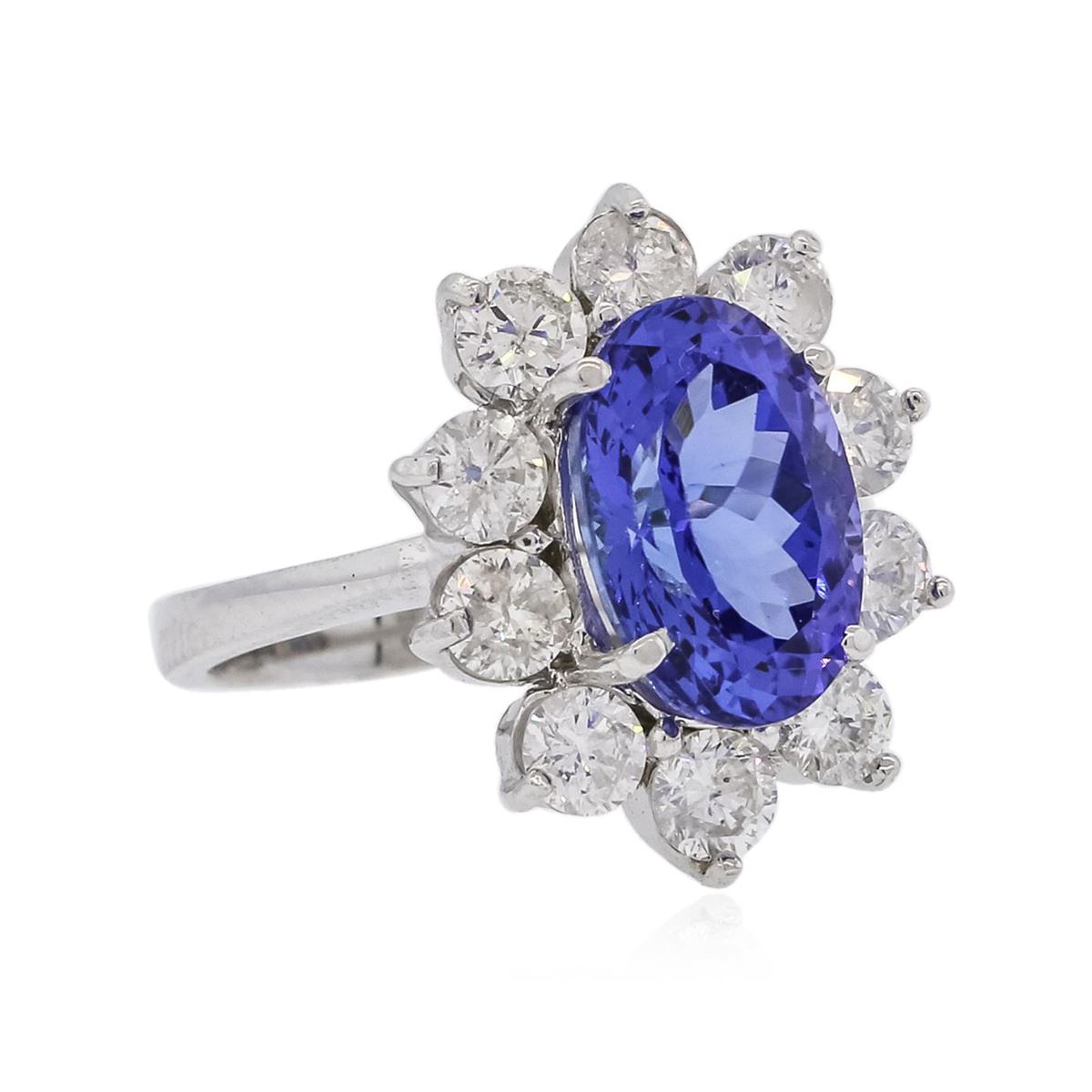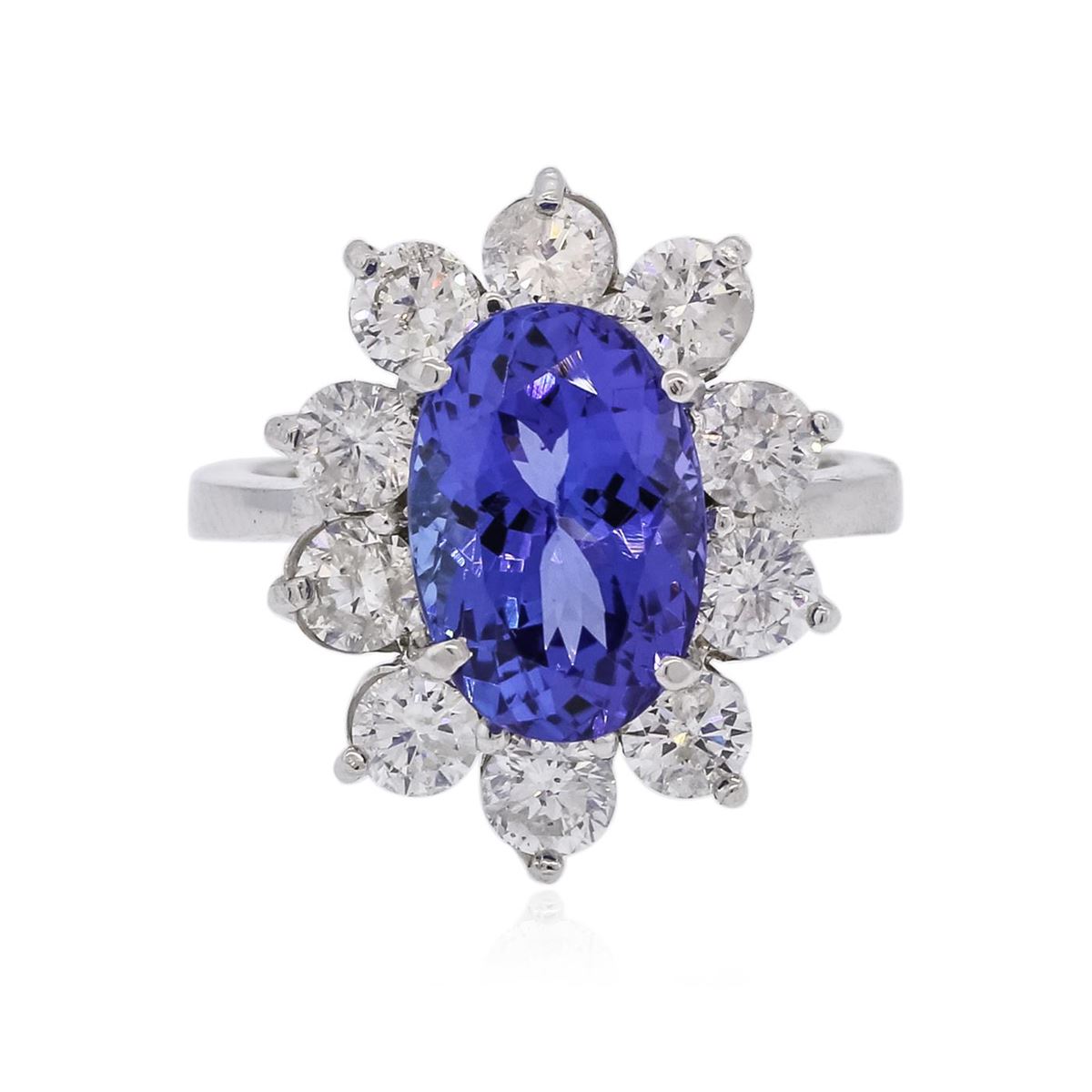 One electronically tested 14KT white gold ladies combination cast & assembled ring with a bright polish finish. Condition is new. Identified with markings of "K14". Containing: One prong set oval modified brilliant cut natural tanzanite, measuring 12.40 x 8.40 x 6.75mm, approximate weight of 4.89ct., clarity is eye clean, type I, medium, moderately strong, bluish violet color, (GIA bV 5/4), cut is good. Ten prong set round brilliant cut diamonds, measuring 3.80 - 3.80 x 2.28mm (depth est.) approximate total weight of 10 Stones = 2.01ct. Clarity: SI-2 to I-1. Color: J, Cut is Good. Colored gemstones are presumed to have been subjected to commonly used enhancement processes. All diamonds and colored gemstones are graded in the mounting, unless otherwise stated. Total Weight of Colored Stones 4.89ct. Total Weight of Diamonds 2.01ct. Total Weight of Ring 7.00 grams. GGL Appraised at $15,305.00.