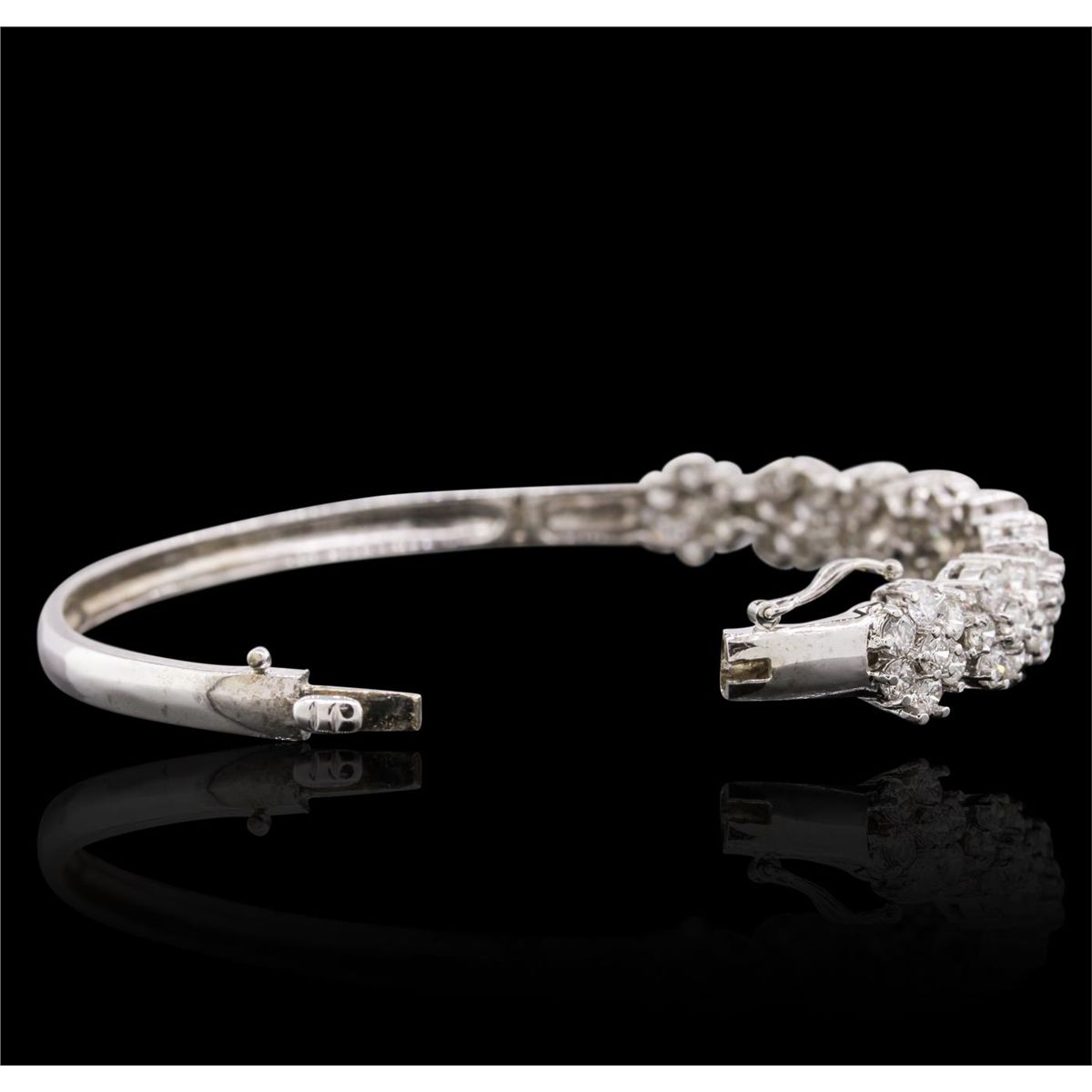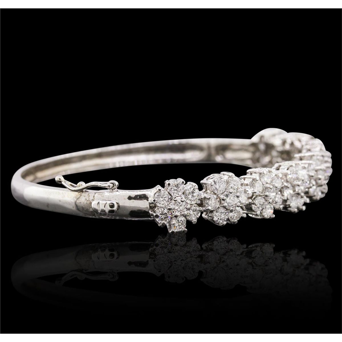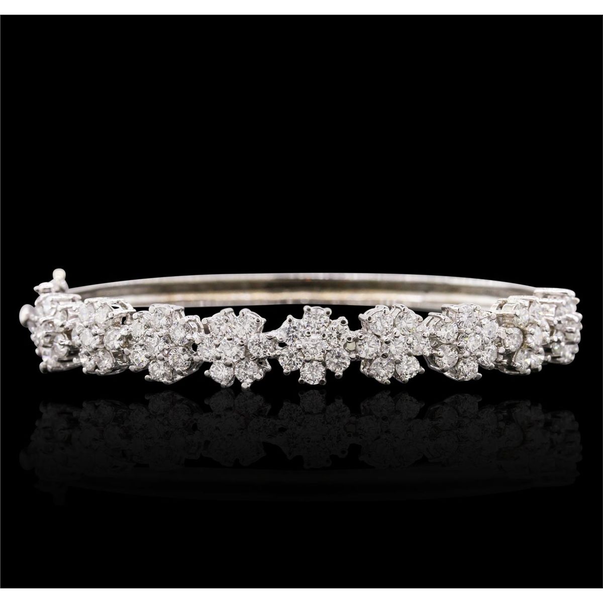 One electronically tested 14KT white gold ladies cast diamond bangle bracelet with a bright polish finish. Condition is new, good workmanship. The bracelet features a rigid ribbon of diamond florets. Six and one-half inch length bangle bracelet terminating in a concealed clasp with twin safeties. Identified with markings of "K14". Containing: Sixty-Three prong set round brilliant cut diamonds, measuring 2.90 - 2.60 x 1.65mm (depth est.) approximate. Total Weight of 63 Stones = 4.89ct. Graded in the setting. Clarity: SI-1 to I-1 . Color: H - J. Total Weight of Diamonds 4.89ct.. Total Weight of Bangle Bracelet 17.30gm. AIG Appraised at $17,300.00.
