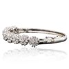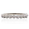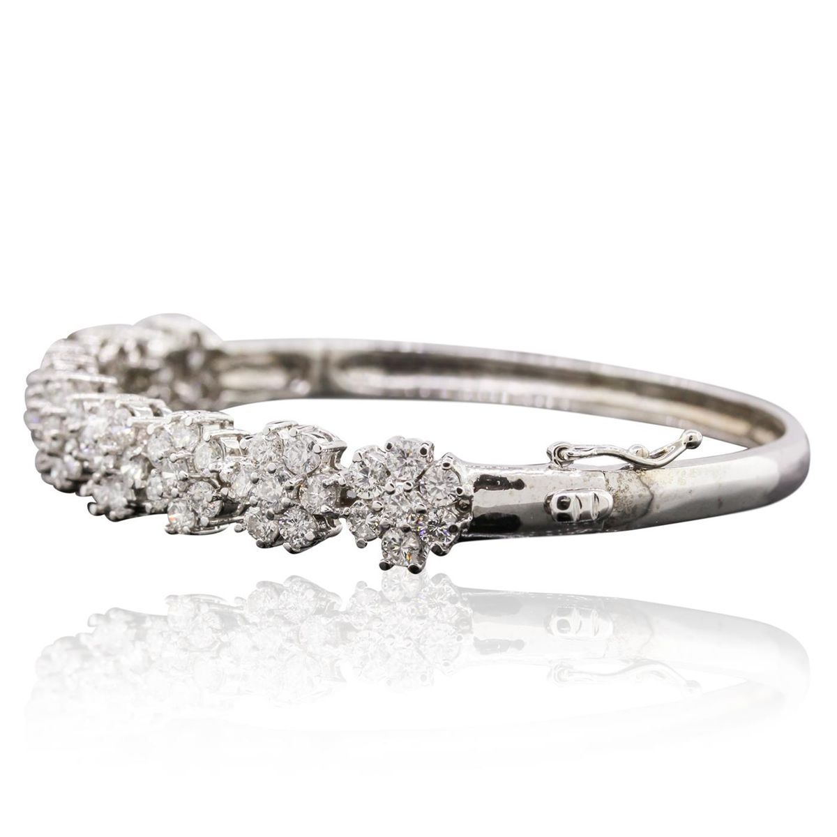 One electronically tested 14KT white gold ladies cast diamond bangle bracelet with a bright polish finish. Condition is new, good workmanship. The bracelet features a rigid ribbon of diamond florets. Six and one-half inch length bangle bracelet terminating in a concealed clasp with twin safeties. Identified with markings of "K14". Containing: Sixty-Three prong set round brilliant cut diamonds, measuring 2.90 - 2.60 x 1.65mm (depth est.) approximate. Total Weight of 63 Stones = 4.89ct. Graded in the setting. Clarity: SI-1 to I-1 . Color: H - J. Total Weight of Diamonds 4.89ct.. Total Weight of Bangle Bracelet 17.30gm. AIG Appraised at $17,300.00.
