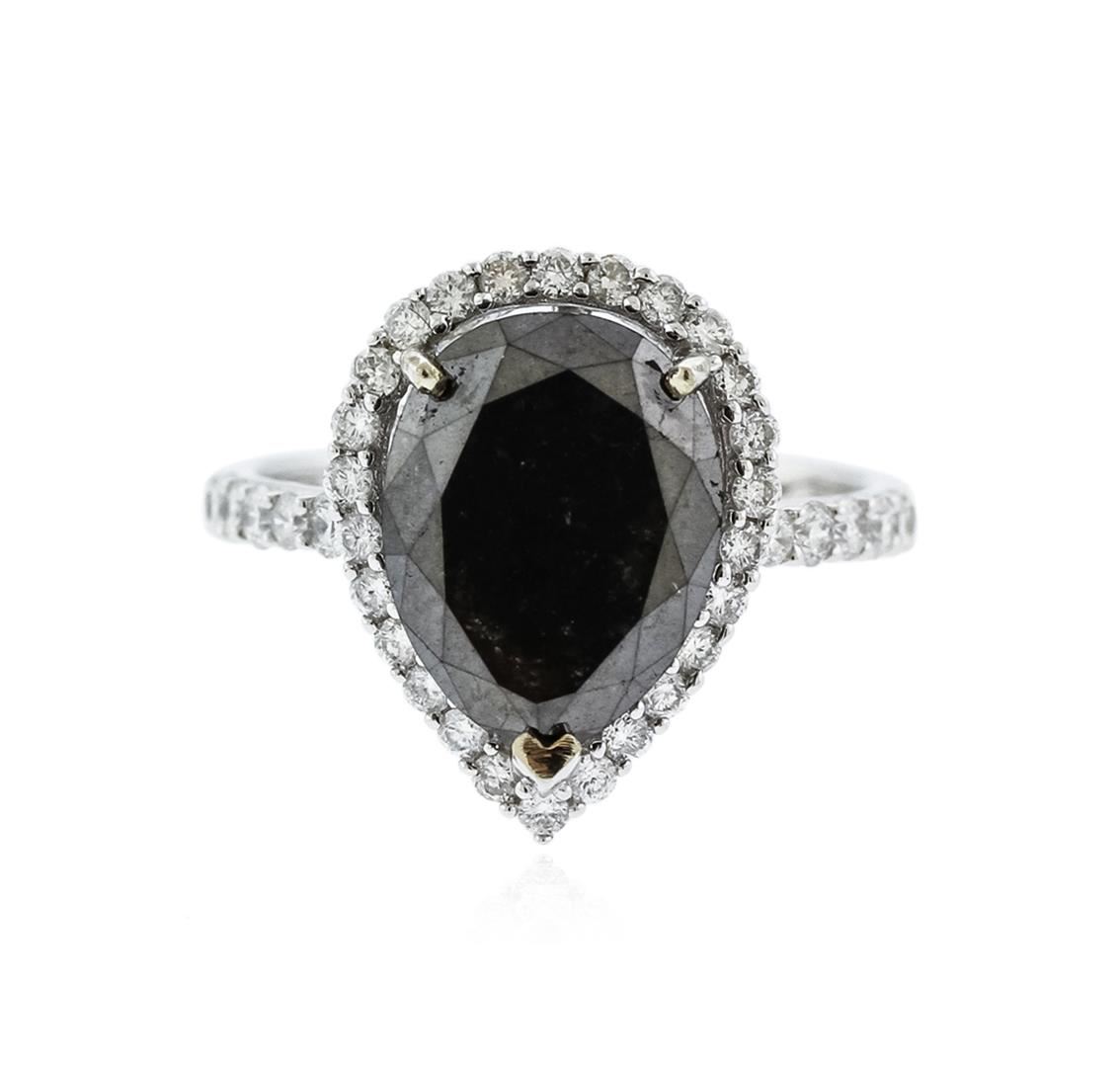 One electronically tested 14KT white gold ladies cast black and white diamond ring with a bright polish finish. The featured black diamond is set within a white diamond bezel, supported by white diamond set shoulders and completed by a two and one-half millimeter wide band. Trademark is Orianne. Identified with markings of "14K". Condition is new, good workmanship. Containing: One prong set pear shaped cut diamond, measuring 12.50 x 9.10 x 4.60mm, 20.00.%. GTCF approximate weight of 4.30ct. Indications of multiple laboratory enhancements. The specific gravity of black diamond is 3.120 to 3.165. Diamond tester results are non reactive. Graded in the setting. Clarity Declasse. Color: Fancy Black; Irradiated. Depth: 50.6%. Table: 65.9%. Thirty-Six prong set round brilliant cut diamonds, measuring 1.90 - 1.50 x 1.02mm (depth est.) approximate total weight of 36 Stones = 0.60ct. Graded in the setting. Clarity: I-1 to I-2. Color: G - I. Total Weight of Diamonds 4.90ct. Total Weight of Ring 4.10 grams. AIG Appraised at $6,685.00.