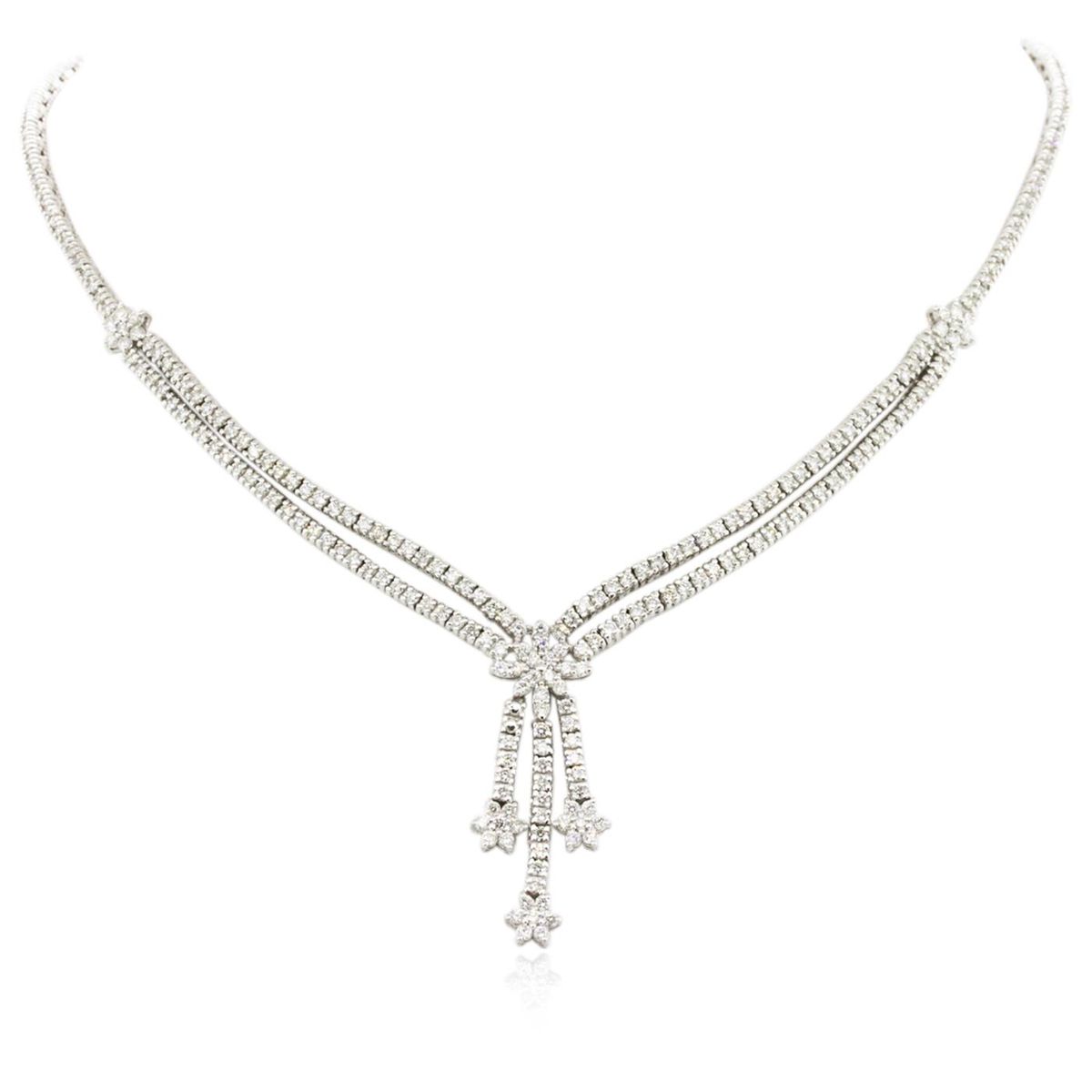 One electronically tested 14KT white gold ladies cast & assembled diamond necklace with a bright polish finish. Sixteen inch length necklace features a double diamond ribbon fringe accented by three floret dangles, and supported by a diamond ribbon transitioning into matching white gold links. The necklace is completed by a concealed clasp with safety bar. Identified with markings of "14K". Condition is new, good workmanship. Containing: Two Hundred Forty-Five prong set round brilliant cut diamonds, measuring 1.80 - 1.70 x 1.05mm (depth est.) approximate total weight of 245 Stones = 4.90ct. The color grade reflects the entire range of color for this group. Graded in the setting. Clarity: SI-1 to I-1 . Color: G - J. Total Weight of Diamonds 4.90ct. Total Weight of Necklace 28.88 grams. AIG Appraised at $19,415.00.