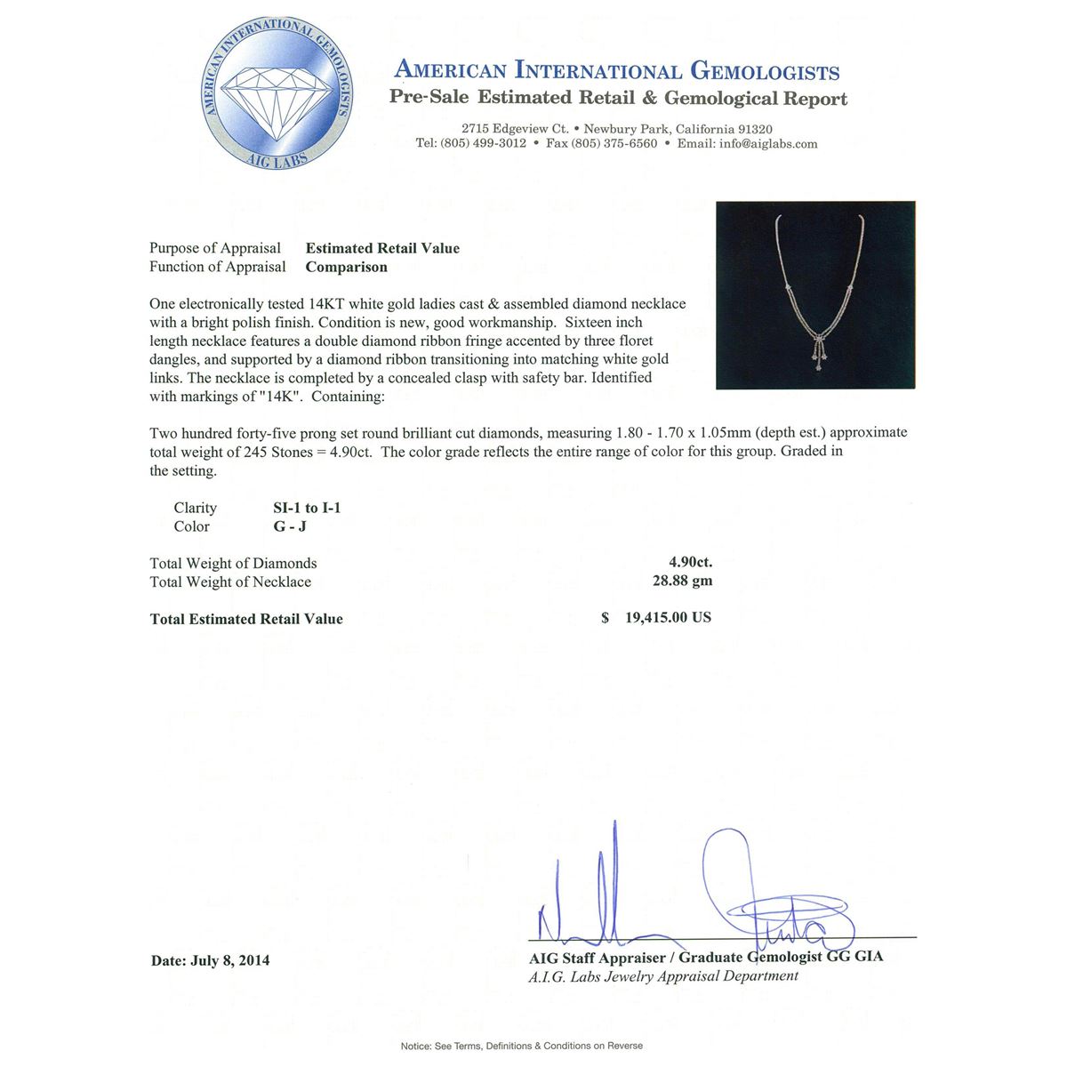 One electronically tested 14KT white gold ladies cast & assembled diamond necklace with a bright polish finish. Sixteen inch length necklace features a double diamond ribbon fringe accented by three floret dangles, and supported by a diamond ribbon transitioning into matching white gold links. The necklace is completed by a concealed clasp with safety bar. Identified with markings of "14K". Condition is new, good workmanship. Containing: Two Hundred Forty-Five prong set round brilliant cut diamonds, measuring 1.80 - 1.70 x 1.05mm (depth est.) approximate total weight of 245 Stones = 4.90ct. The color grade reflects the entire range of color for this group. Graded in the setting. Clarity: SI-1 to I-1 . Color: G - J. Total Weight of Diamonds 4.90ct. Total Weight of Necklace 28.88 grams. AIG Appraised at $19,415.00.