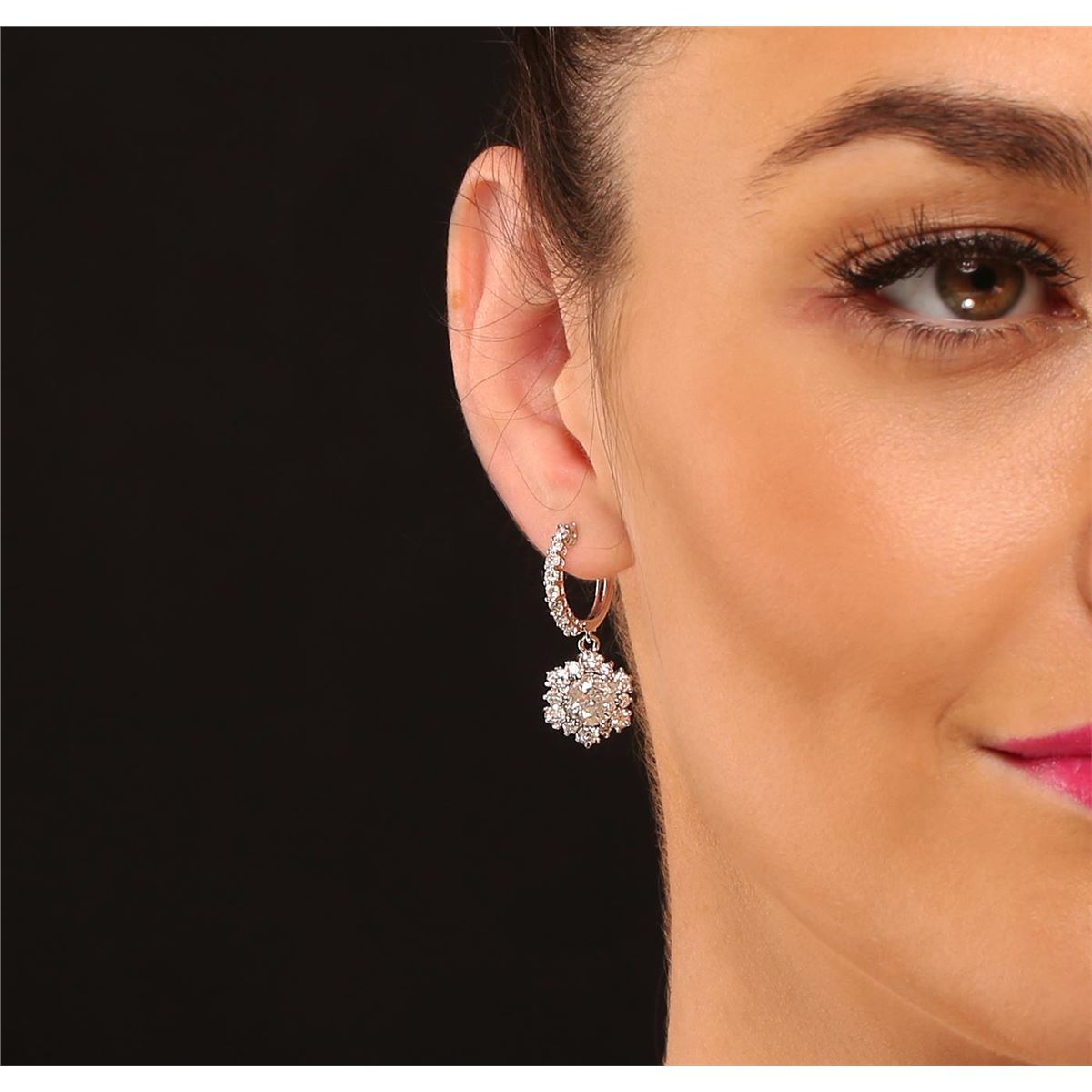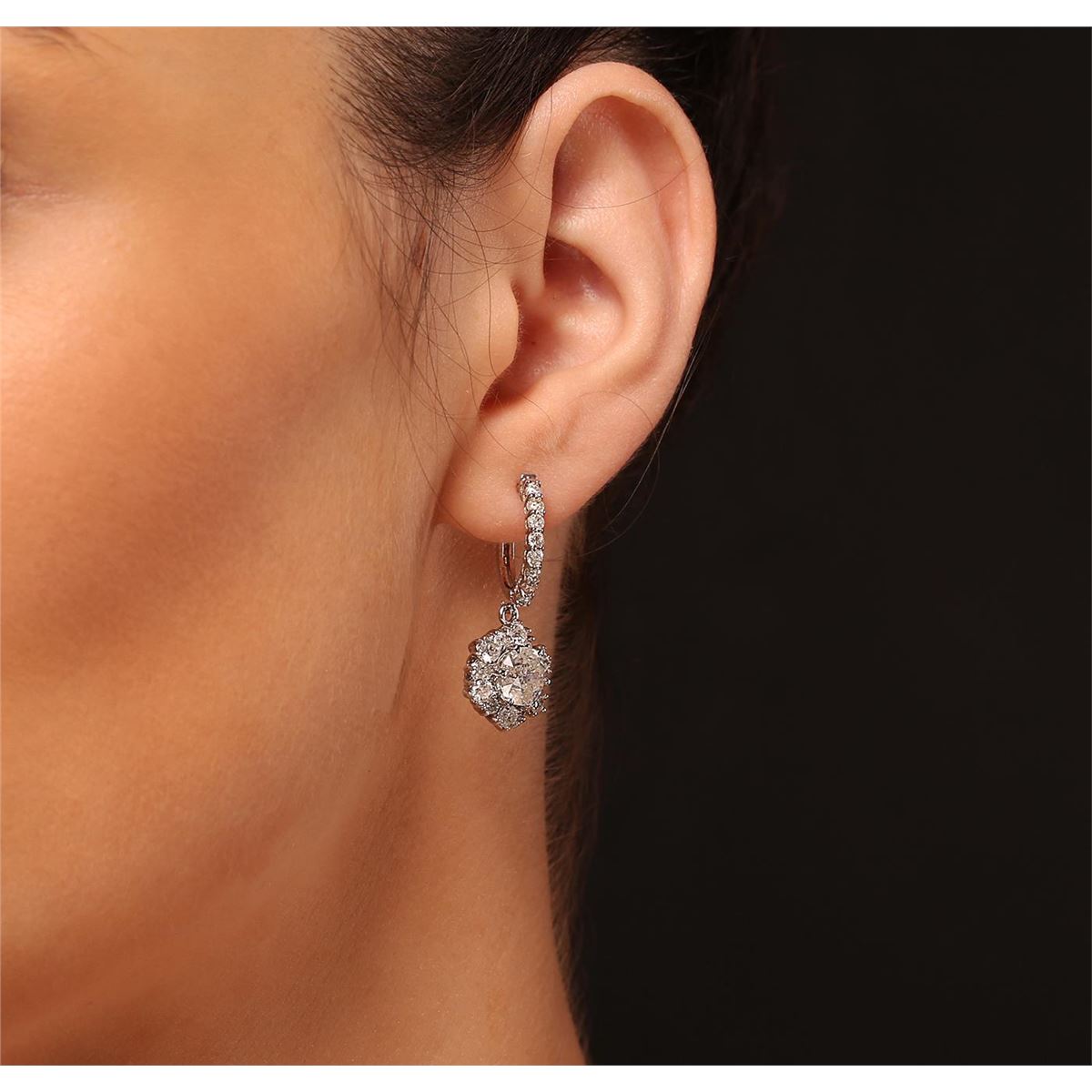 One pair electronically tested 14KT white gold ladies cast & assembled diamond dangle earrings with hinged, snap locking posts. Condition is new, good workmanship. Each earring features a diamond floret dangle, completed by a diamond huggie. Bright polish finish. Identified with markings of "585". Containing: Two prong set round brilliant cut diamonds, measuring 7.20 - 7.00 x 4.55mm (depth est.), 5.00.%. GTCF approximate. Total Weight of 2 Stones = 3.03ct. Graded in the setting. Clarity: I-1 to I-2. Color: J - K. Twelve prong set round brilliant cut diamonds, measuring 2.70 - 2.60 x 1.59mm (depth est.) approximate. Total Weight of 12 Stones = 0.91ct. Graded in the setting. Clarity: I-1 to I-2. Color: H - J. Twenty-Eight prong set round brilliant cut diamonds, measuring 2.10 - 2.00 x 1.23mm (depth est.) approximate. Total Weight of 28 Stones = 0.98ct. Graded in the setting. Clarity: I-1 to I-3. Color: I - K. Total Weight of Diamonds 4.92ct. Total Weight of Earrings 7.26 grams. AIG Appraised at $32,665.00.