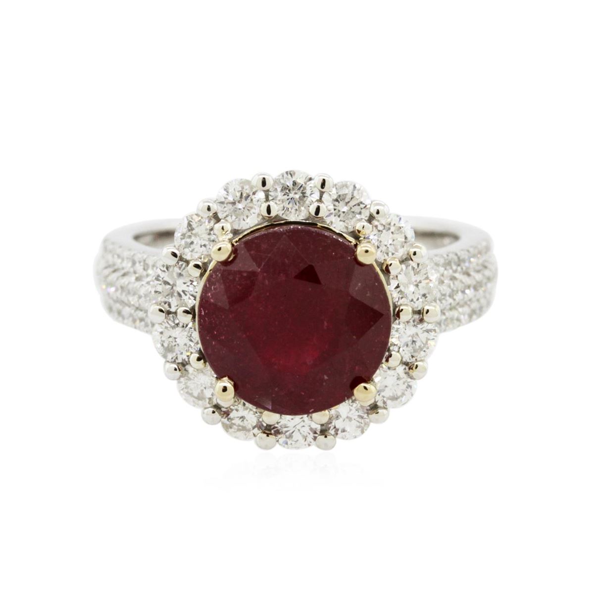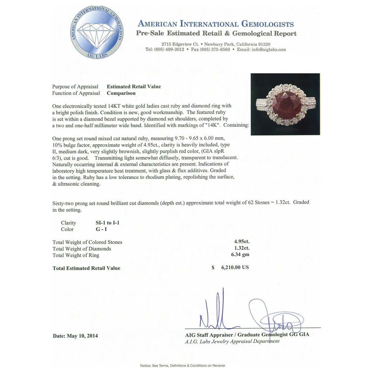 One electronically tested 14KT white gold ladies cast ruby and diamond ring with a bright polish finish. Condition is new, good workmanship. The featured ruby is set within a diamond bezel supported by diamond set shoulders, completed by a two and one-half millimeter wide band. Identified with markings of "14K". Containing: One prong set round mixed cut natural ruby, measuring 9.70 - 9.65 x 6.00 mm, 10%. bulge factor, approximate weight of 4.95ct., clarity is heavily included, type II, medium dark, very slightly brownish, slightly purplish red color, (GIA slpR 6/3), cut is good. Transmitting light somewhat diffusely, transparent to translucent. Naturally occurring internal & external characteristics are present. Indications of laboratory high temperature heat treatment, with glass & flux additives. Graded in the setting. Ruby has a low tolerance to rhodium plating, repolishing the surface, & ultrasonic cleaning. Sixty-Two prong set round brilliant cut diamonds (depth est.) approximate. Total Weight of 62 Stones = 1.32ct. Graded in the setting. Clarity: SI-1 to I-1. Color: G - I. Total Weight of Colored Stones 4.95ct. Total Weight of Diamonds 1.32ct. Total Weight of Ring 6.34grams. AIG Appraised at $6,210.00.