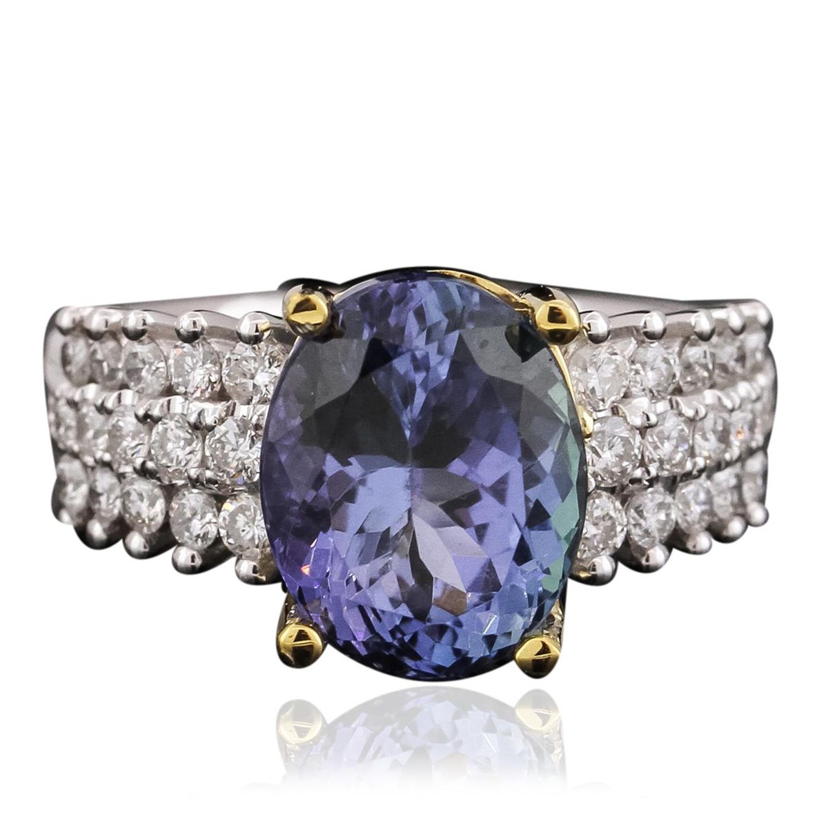 One electronically tested 14KT white gold ladies cast tanzanite and diamond ring. The featured tanzanite is supported by diamond set shoulders, completed by a two millimeter wide band. Bright polish finish with yellow gold accents. Identified with markings of "14K". Condition is new, good workmanship. Containing: One prong set oval brilliant cut natural tanzanite, measuring 11.15 x 9.00 x 6.75mm, 8% bulge factor, approximate weight of 4.96ct., clarity is eye clean, type I, medium dark, slightly grayish, bluish violet color, (GIA bV 6/2), cut is good. Transmitting light with no distortion, transparent. Graded in the setting. Tanzanite is a very rare gemstone that is only found in the country of Tanzania. Originally discovered in 1967. Tiffany & Company, named the stone Tanzanite. It is found in the Usumburu Mountains that border the Umba Valley of northern Tanzania. Tanzanite occurs in gray, brown, violet, blue, reddish-purple, & green. The gem is interesting because of its exceptional pleochroism. Rotated in different directions a tanzanite will exhibit multiple changes of color. Tanzanite has a low tolerance to ultrasonic cleaning, and should not be cleaned using this method. Thirty prong set round brilliant cut diamonds, measuring 2.00 - 1.80 x 1.14mm (depth est.) approximate total weight of 30 Stones = 0.85ct. Graded in the setting. Clarity: SI-1 to I-1. Color: G - I. Total Weight of Colored Stones 4.96ct. Total Weight of Diamonds 0.85ct. Total Weight of Ring 5.97 grams. AIG Appraised at $12,780.00.
