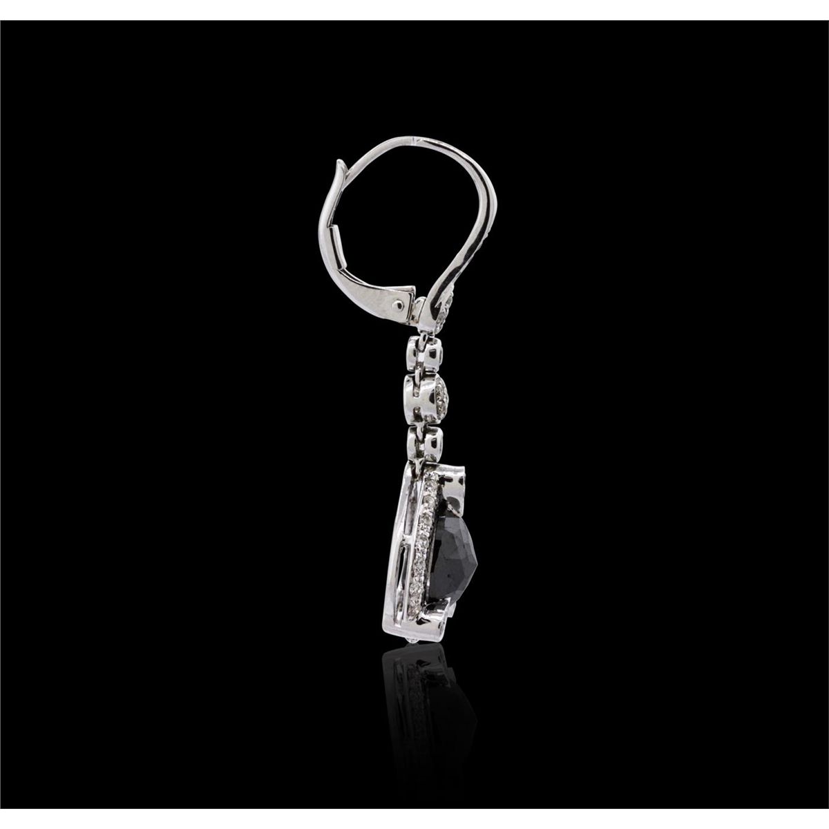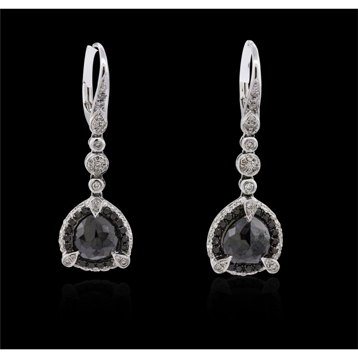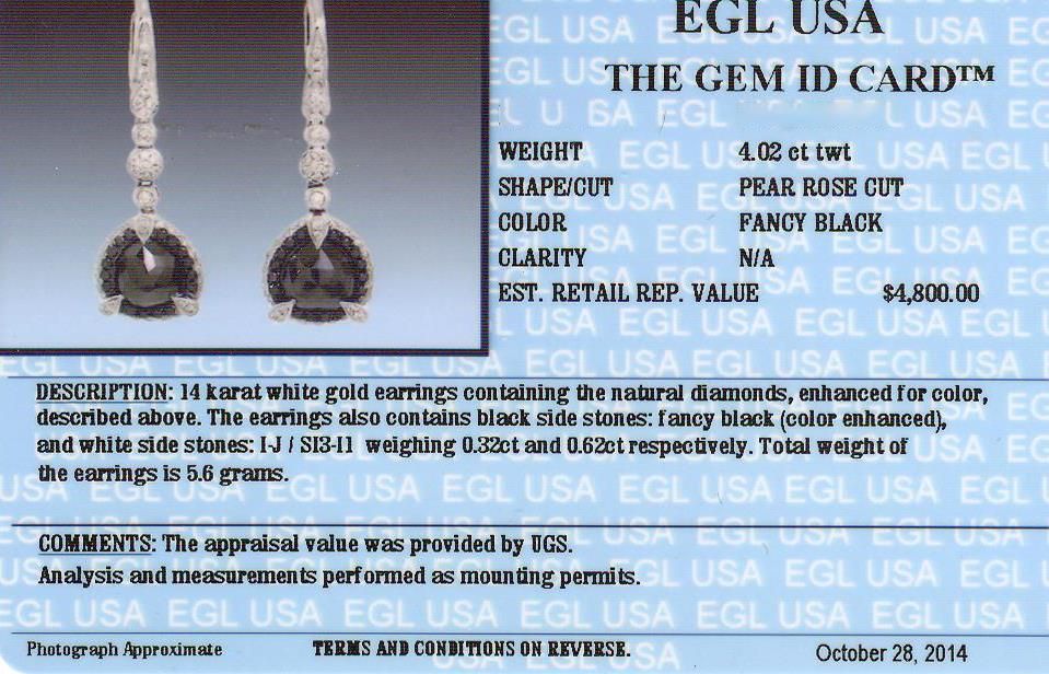 One pair of 14KT white gold earrings containing two natural pear rose cut fancy black diamonds, enhanced for color, with a total weight of 4.02ct. The earrings also contain black side stones: fancy black (color enhanced), and white side stone: I-J / SI3-I1 weighing 0.32ct and 0.62ct respectively. Total weight of the earrings is 5.60 grams. EGL Appraised at $4,800.00.