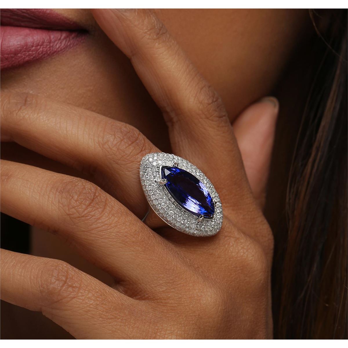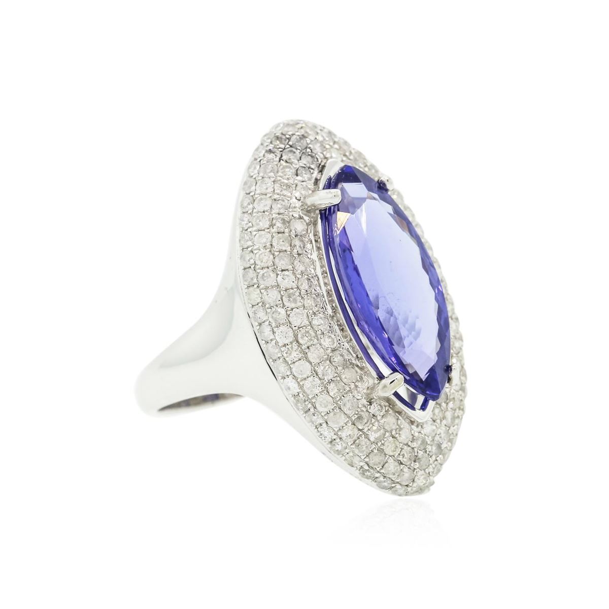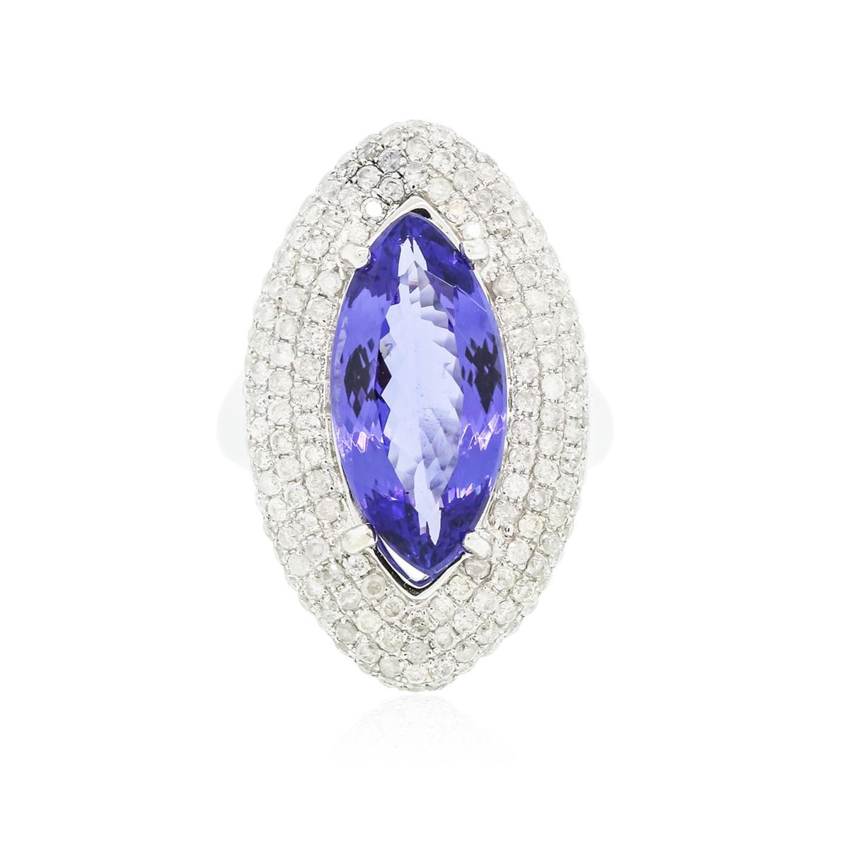 One electronically tested 14KT white gold Ladies cast ring with a bright polish finish. Condition is new. Identified with markings of "14K". Containing: One prong set marquise modified brilliant cut natural tanzanite, measuring 18.00 x 8.70 x 5.00mm, approximate weight of 4.98ct., clarity is eye clean, type I, medium, very slightly grayish, violet color, (GIA V 5/3), cut is good. Colored gemstones are presumed to have been subjected to commonly used color/clarity enhancement processes. One Hundred Seventy-Two prong set round brilliant cut diamonds, measuring 1.30 - 1.30 x 0.78mm (depth est.) approximate. Total Weight of 172 Stones = 1.38ct. Clarity: I-1 to I-2. Color: H - I, Cut is Good. All grading of diamonds and colored gemstones in this piece of jewelry are graded in the mounting, unless otherwise stated. Total Weight of Colored Stones 4.98ct. Total Weight of Diamonds 1.38ct. Total Weight of Ring 7.70 grams. GGL Appraised at $13,090.00.