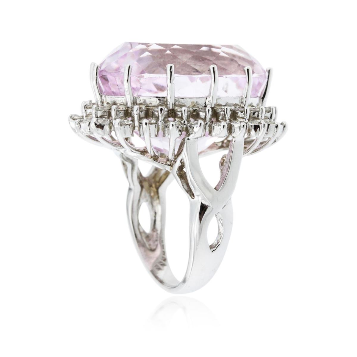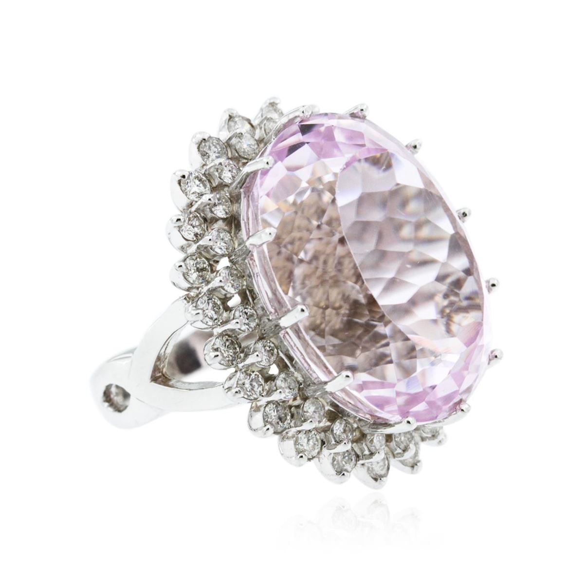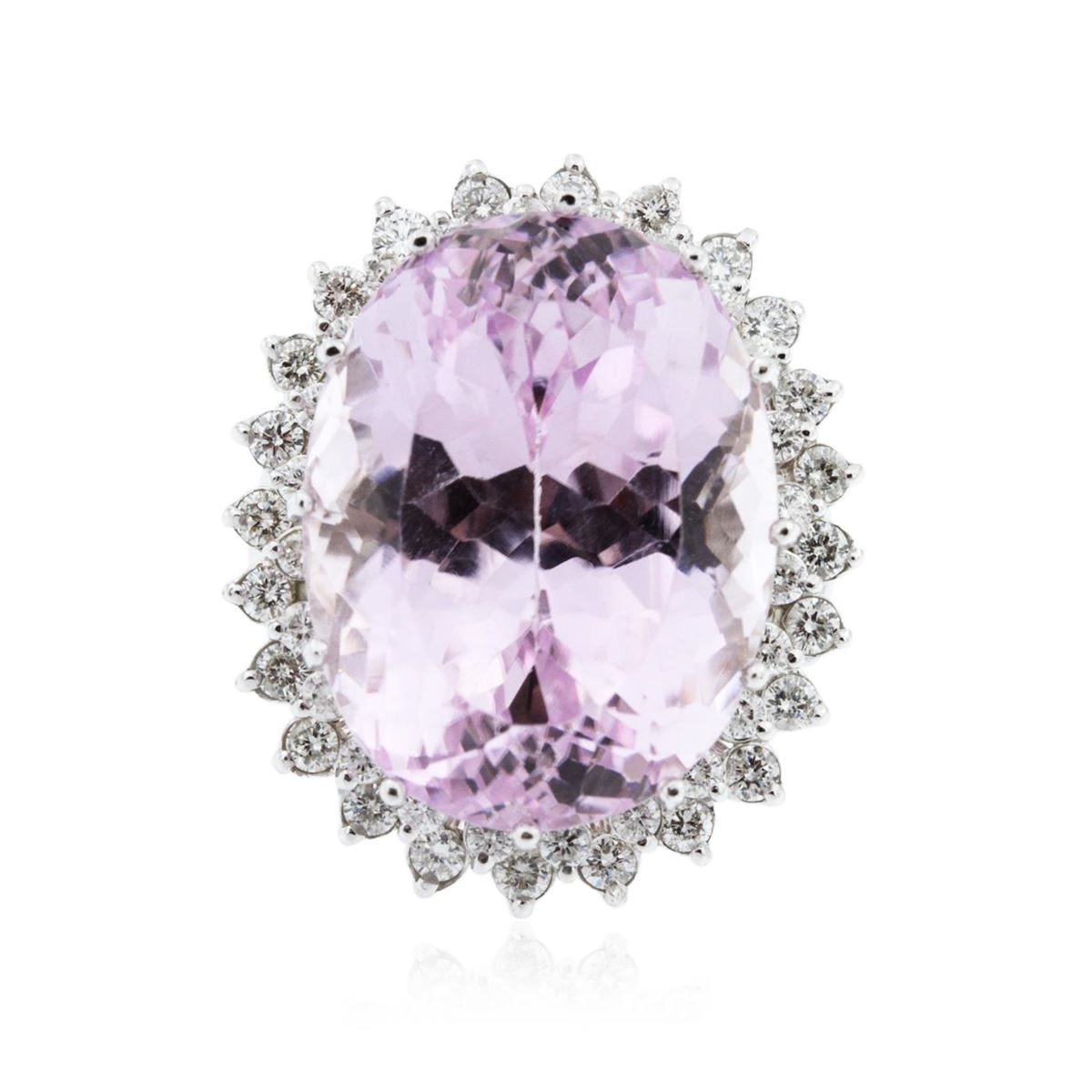 One electronically tested 14KT white gold ladies cast kunzite and diamond ring with a bright polish finish. Condition is new, good workmanship. The featured kunzite is set within a two tiered diamond bezel supported by intertwining shoulders, completed by a two and one-half millimeter wide band. Identified with markings of "K14". Containing: One prong set oval modified brilliant cut natural kunzite, measuring 22.77 x 17.41 x 14.28mm, exact weight 40.04ct, type I clarity is eye clean, medium, very slightly grayish, pink-purple, (GIA PiP 5/3), cut is good. Transmitting light with no distortion, transparent. GIA Gemological Report attached. Graded loose prior to setting in the GIA Laboratory, Report # 1156952117. Twenty-four prong set round brilliant cut diamonds, measuring 2.40 - 2.30 x 1.41mm (depth est.) approximate total weight of 24 Stones = 1.24ct. Graded in the setting. Clarity SI-1 to I-1 Color G-I. Twenty-four prong set round brilliant cut diamonds, measuring 1.90 - 1.80 x 1.11mm (depth est.) approximate total weight of 24 Stones = 0.65ct. Graded in the setting. Clarity SI-1 to I-1 Color G-I. Total Weight of Colored Stones 40.04ct. Total Weight of Diamonds 1.89ct. Total Weight of Ring 18.22 grams. AIG Appraised at $19,250.00.