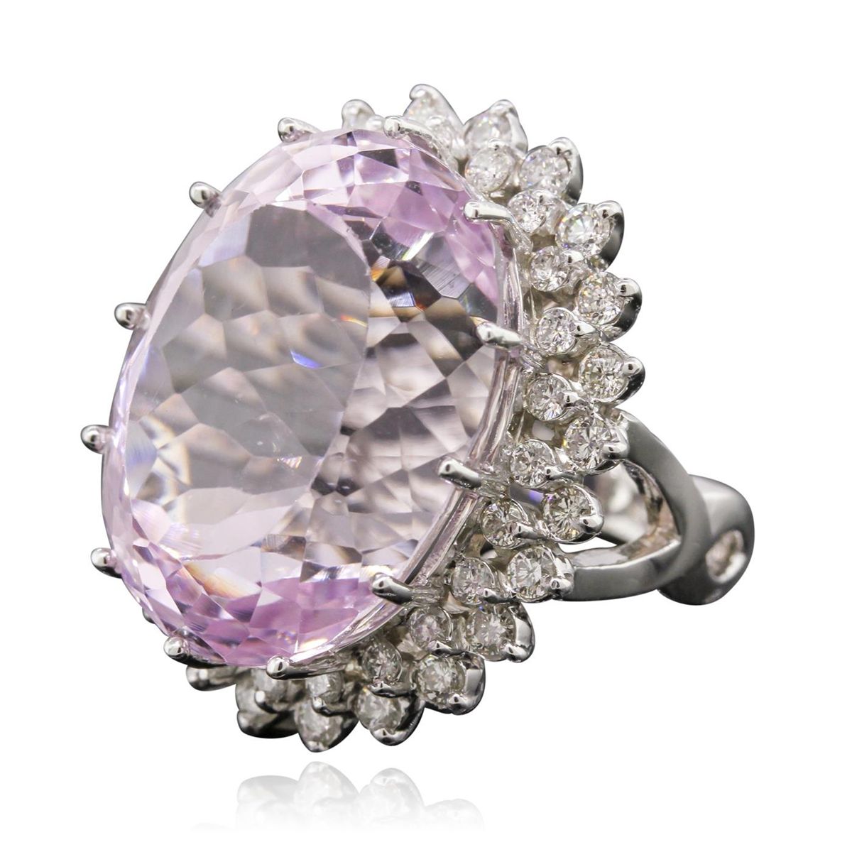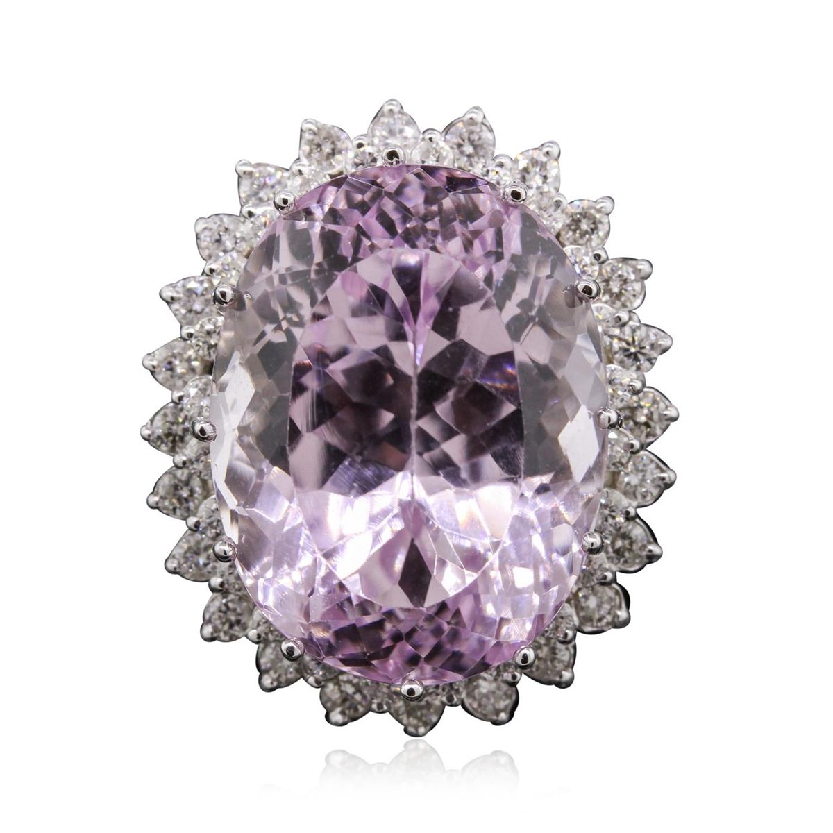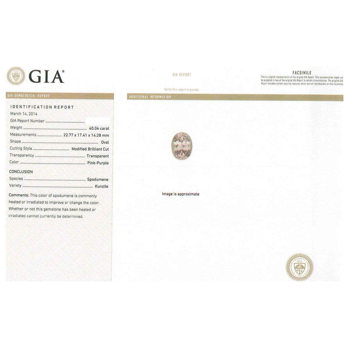 One electronically tested 14KT white gold ladies cast kunzite and diamond ring with a bright polish finish. Condition is new, good workmanship. The featured kunzite is set within a two tiered diamond bezel supported by intertwining shoulders, completed by a two and one-half millimeter wide band. Identified with markings of "K14". Containing: One prong set oval modified brilliant cut natural kunzite, measuring 22.77 x 17.41 x 14.28mm, exact weight 40.04ct, type I clarity is eye clean, medium, very slightly grayish, pink-purple, (GIA PiP 5/3), cut is good. Transmitting light with no distortion, transparent. GIA Gemological Report attached. Graded loose prior to setting in the GIA Laboratory, Report # 1156952117. Twenty-four prong set round brilliant cut diamonds, measuring 2.40 - 2.30 x 1.41mm (depth est.) approximate total weight of 24 Stones = 1.24ct. Graded in the setting. Clarity SI-1 to I-1 Color G-I. Twenty-four prong set round brilliant cut diamonds, measuring 1.90 - 1.80 x 1.11mm (depth est.) approximate total weight of 24 Stones = 0.65ct. Graded in the setting. Clarity SI-1 to I-1 Color G-I. Total Weight of Colored Stones 40.04ct. Total Weight of Diamonds 1.89ct. Total Weight of Ring 18.22 grams. AIG Appraised at $19,250.00.