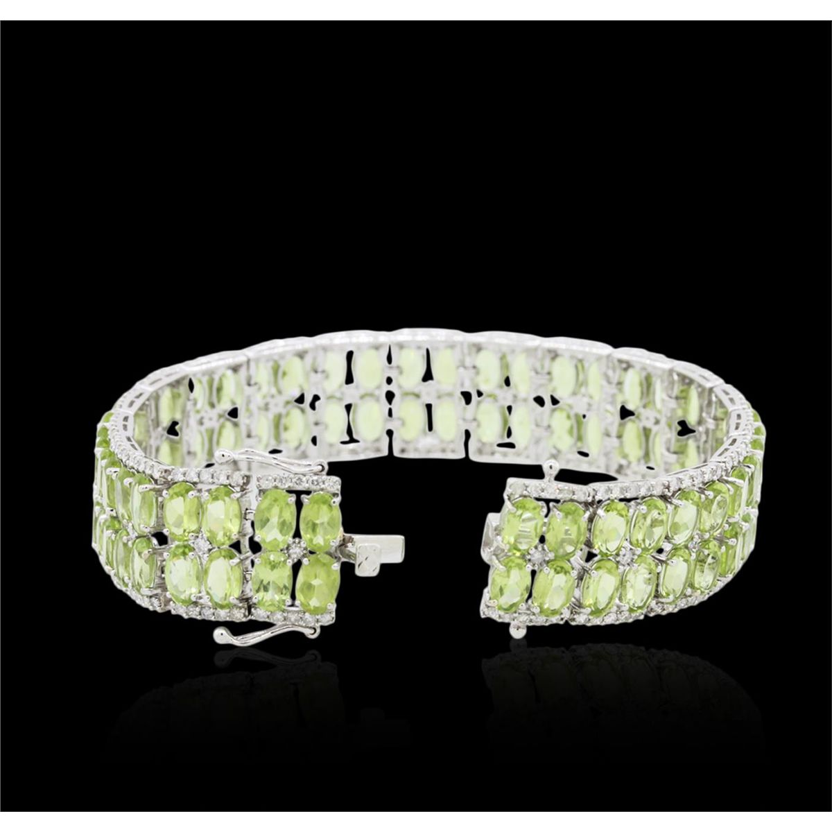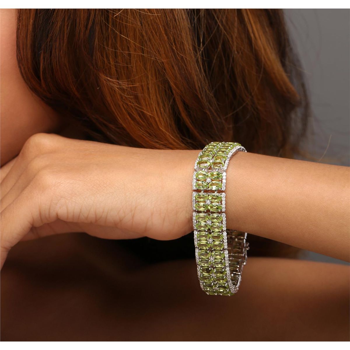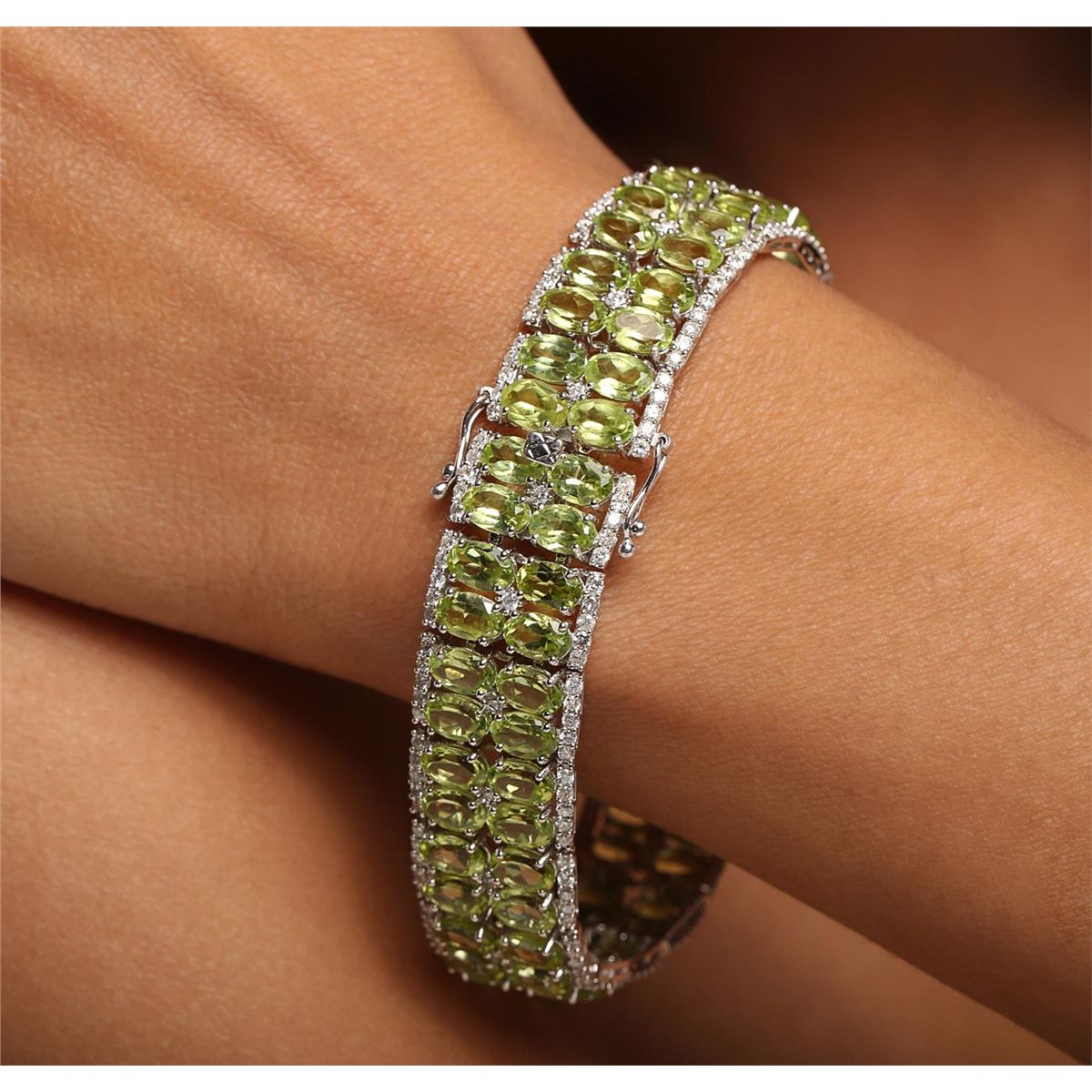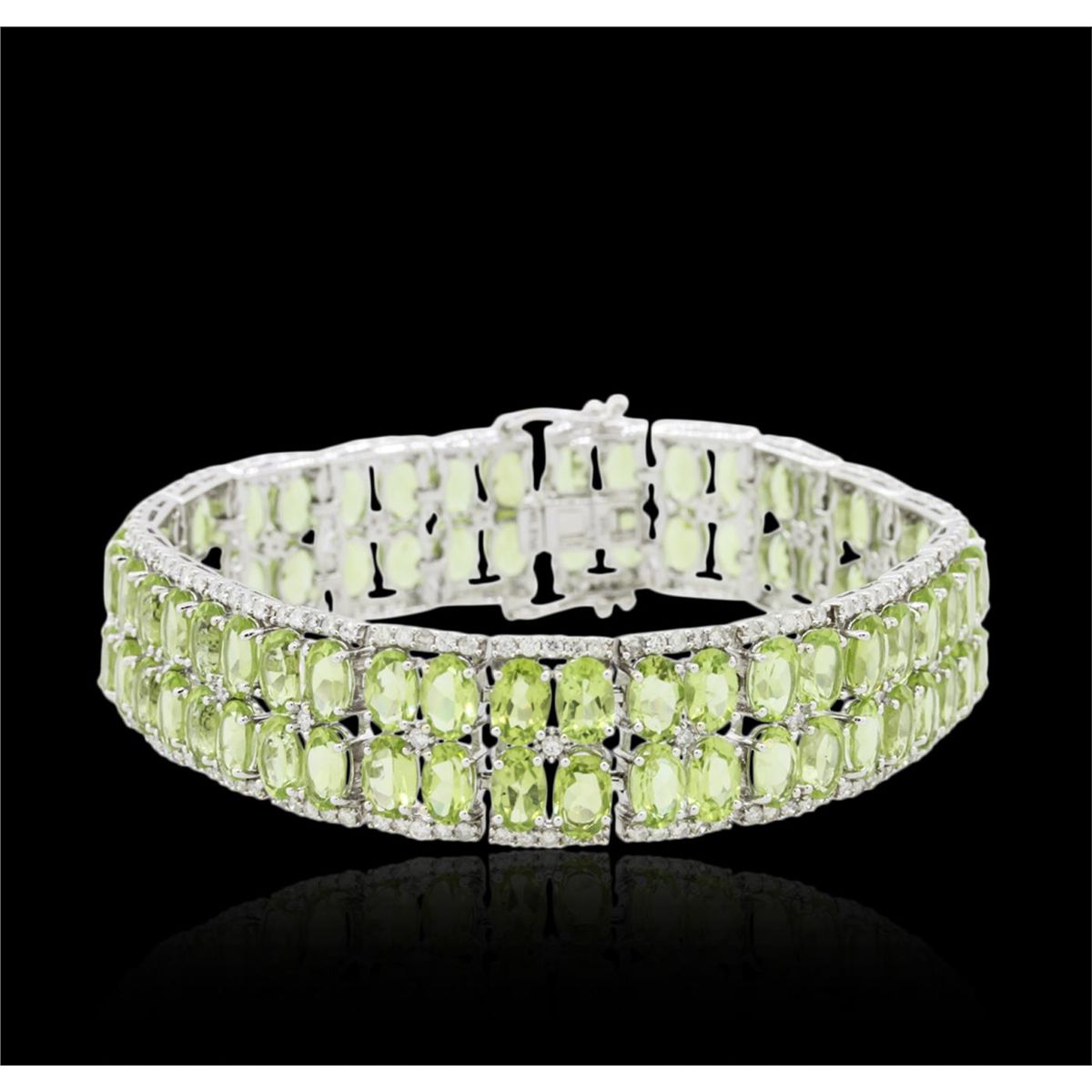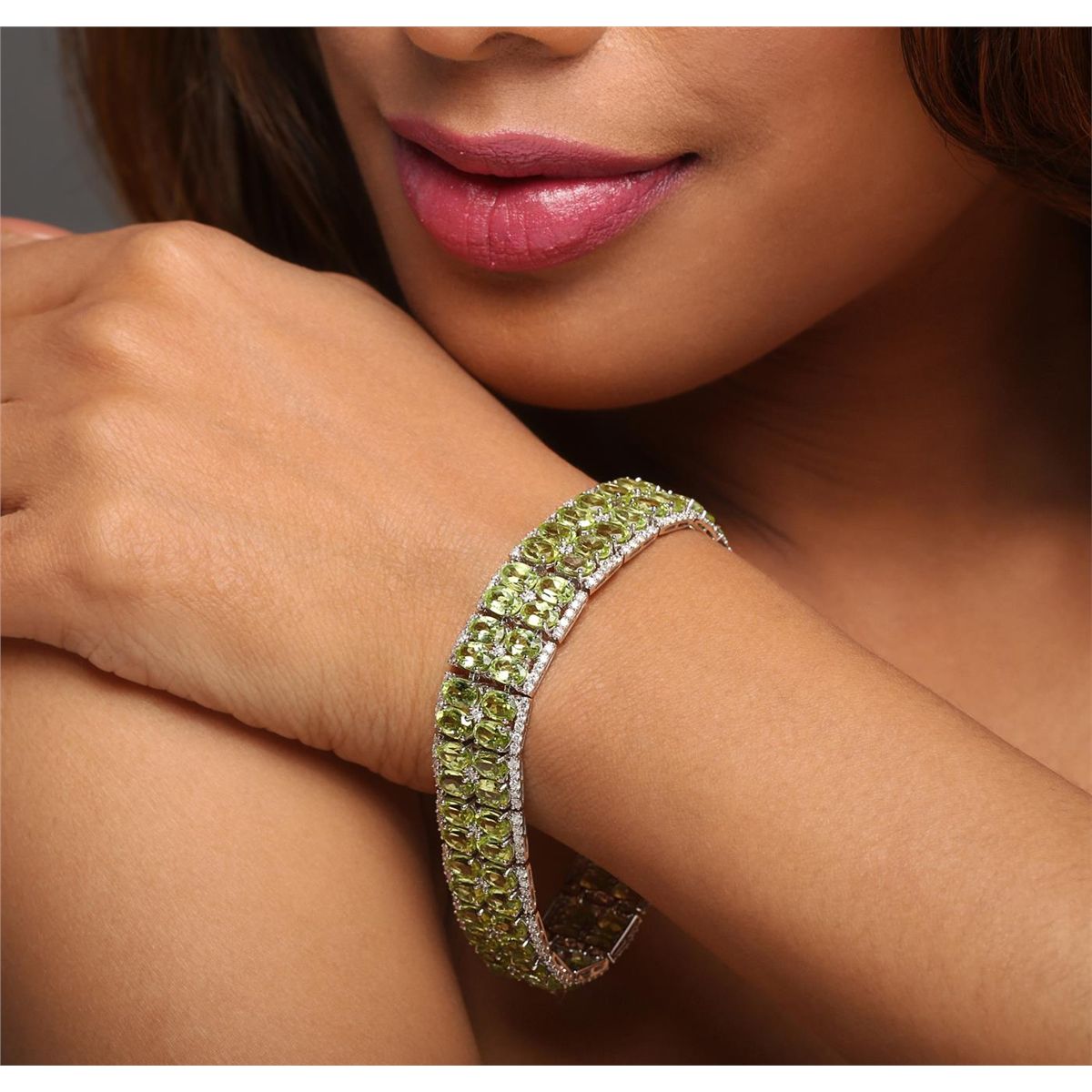 One polished, stamped, and tested 14KT white gold Michael Christoff designer bracelet mounted with: 84 genuine peridots weighing 40.51cts, and 231 genuine round diamonds weighing 2.93cts. The bracelet measures 7 inches in length and is finished with a tension lock clasp and double safety clasps. This item weighs 31.50 grams, condition is new, excellent workmanship. AIGL Appraised at $26,400.00.