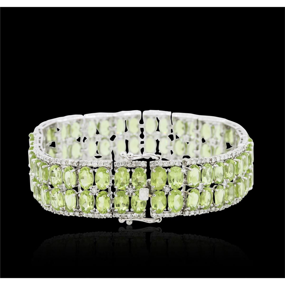 One polished, stamped, and tested 14KT white gold Michael Christoff designer bracelet mounted with: 84 genuine peridots weighing 40.51cts, and 231 genuine round diamonds weighing 2.93cts. The bracelet measures 7 inches in length and is finished with a tension lock clasp and double safety clasps. This item weighs 31.50 grams, condition is new, excellent workmanship. AIGL Appraised at $26,400.00.