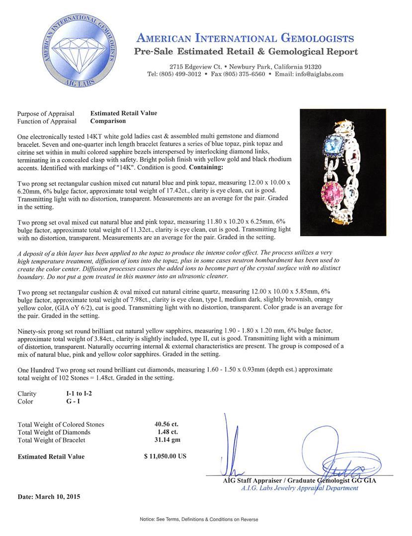 One electronically tested 14KT white gold ladies cast & assembled multi gemstone and diamond bracelet. Seven and one-quarter inch length bracelet features a series of blue topaz, pink topaz and citrine set within in multi colored sapphire bezels interspersed by interlocking diamond links, terminating in a concealed clasp with safety. Bright polish finish with yellow gold and black rhodium accents. Identified with markings of "14K". Condition is good. Containing: Two prong set rectangular cushion mixed cut natural blue and pink topazs, measuring 12.00 x 10.00 x 6.20mm, 6% bulge factor, approximate total weight of 17.42ct., clarity is eye clean, cut is good. Transmitting light with no distortion, transparent. Measurements are an average for the pair. Graded in the setting. Two prong set oval mixed cut natural blue and pink topazs, measuring 11.80 x 10.20 x 6.25mm, 6% bulge factor, approximate total weight of 11.32ct., clarity is eye clean, cut is good. Transmitting light with no distortion, transparent. Measurements are an average for the pair. Graded in the setting. A deposit of a thin layer has been applied to the topaz to produce the intense color effect. The process utilizes a very high temperature treatment, diffusion of ions into the topaz, plus in some cases neutron bombardment has been used to create the color center. Diffusion processes causes the added ions to become part of the crystal surface with no distinct boundary. Do not put a gem treated in this manner into an ultrasonic cleaner. Two prong set rectangular cushion & oval mixed cut natural citrine quartzs, measuring 12.00 x 10.00 x 5.85mm, 6% bulge factor, approximate total weight of 7.98ct., clarity is eye clean, type I, medium dark, slightly brownish, orangy yellow color, (GIA oY 6/2), cut is good. Transmitting light with no distortion, transparent. Color grade is an average for the pair. Graded in the setting. Ninety-six prong set round brilliant cut natural yellow sapphires, measuring 1.90 - 1.80 x 1.20 mm, 6% bulge factor, approximate total weight of 3.84ct., clarity is slightly included, type II, cut is good. Transmitting light with a minimum of distortion, transparent. Naturally occurring internal & external characteristics are present. The group is composed of a mix of natural blue, pink and yellow color sapphires. Graded in the setting. One Hundred Two prong set round brilliant cut diamonds, measuring 1.60 - 1.50 x 0.93mm (depth est.) approximate total weight of 102 Stones = 1.48ct. Graded in the setting. Clarity: I-1 to I-2. Color: G - I. Total Weight of Colored Stones 40.56ct. Total Weight of Diamonds 1.48ct. Total Weight of Bracelet 31.14 grams. AIG Appraised at $11,050.00.