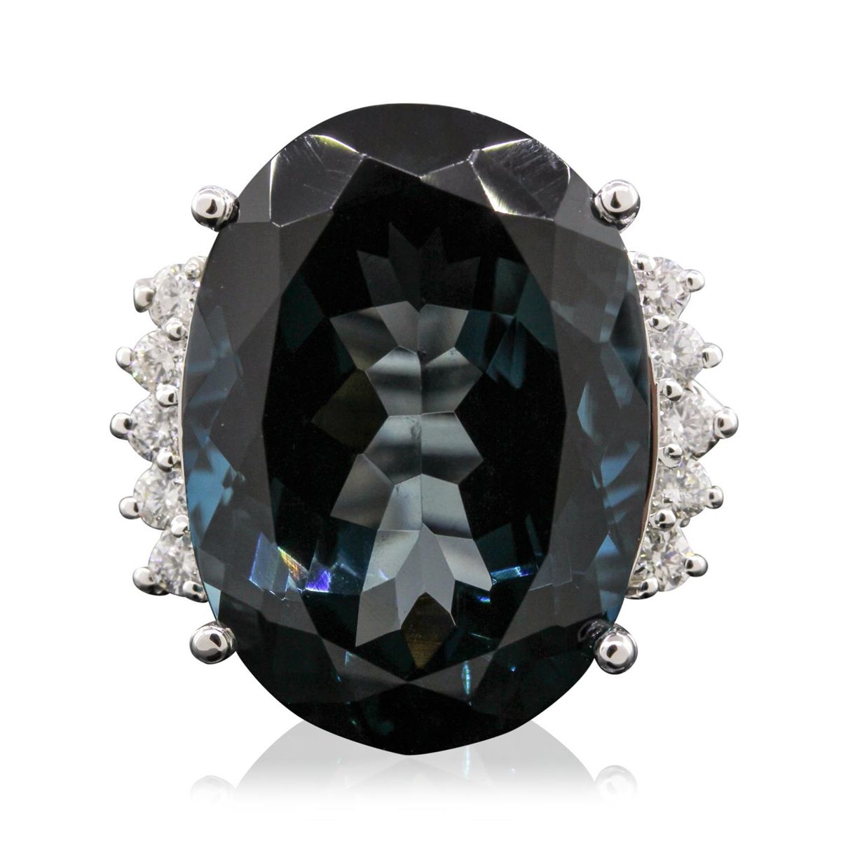 One electronically tested 14KT white gold Ladies cast ring with a bright polish finish. Condition is new. Identified with markings of "K14". Containing: One prong set oval modified brilliant cut natural blue topaz, measuring 25.22 x 18.03 x 12.30mm, approximate weight of 40.61ct., clarity is eye clean, type I, medium light, very slightly grayish, greenish blue color, (GIA gB 4/3), cut is very good. Colored gemstones are presumed to have been subjected to commonly used color/clarity enhancement processes. Ten prong set round brilliant cut diamonds, measuring 3.00 - 3.00 x 1.80mm (depth est.) approximate. Total Weight of 10 Stones = 0.99ct. Clarity: I-1 to I-2. Color: I - J, Cut is Good. Total Weight of Colored Stones 40.61ct. Total Weight of Diamonds 0.99ct. Total Weight of Ring 19.80 Grams. GGL Appraised at $9,435.00.