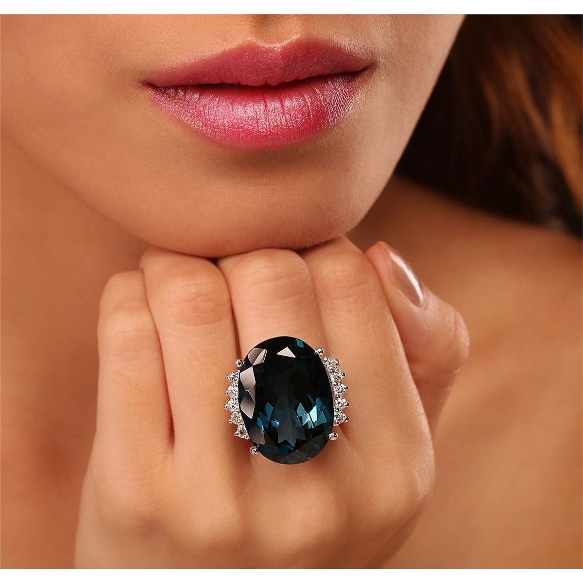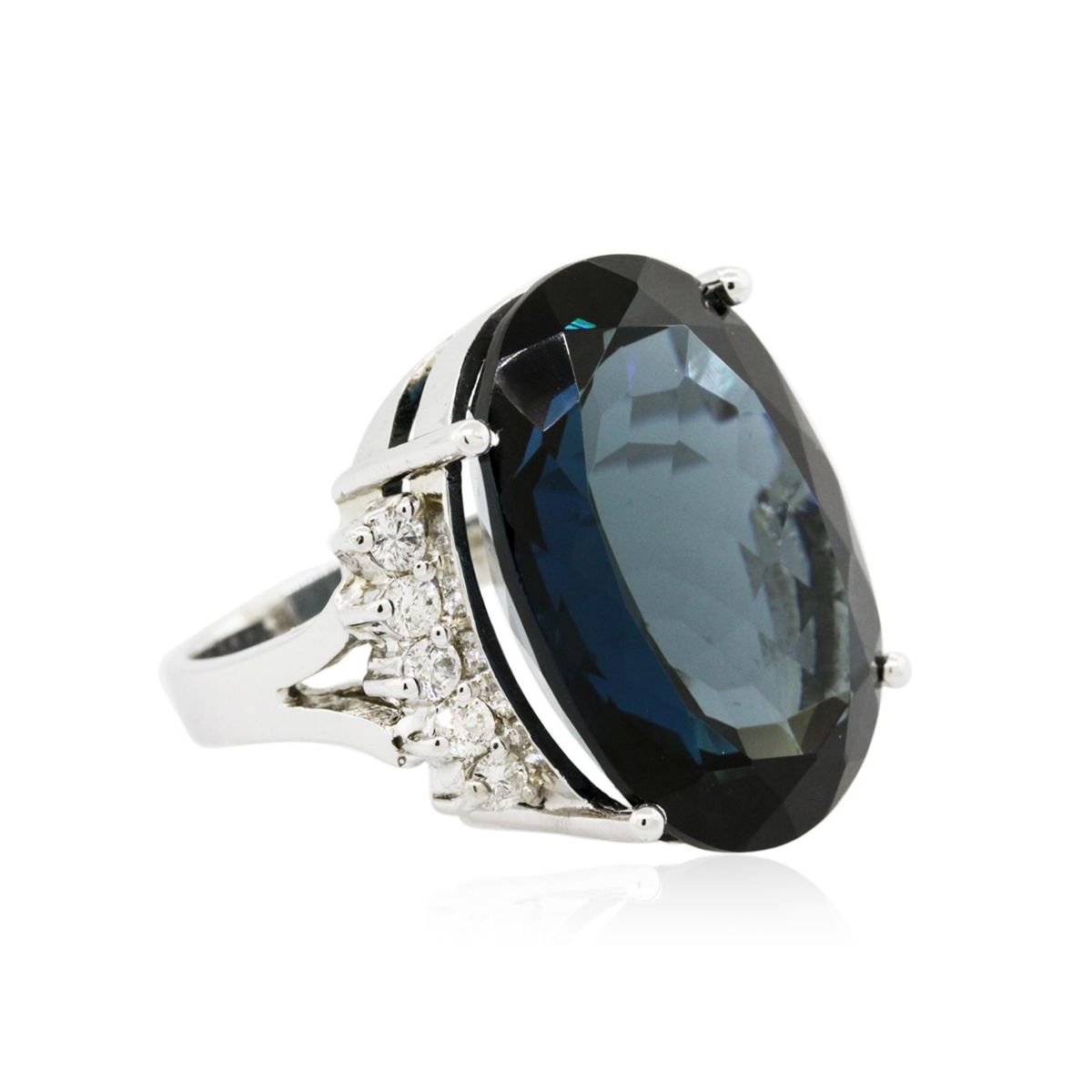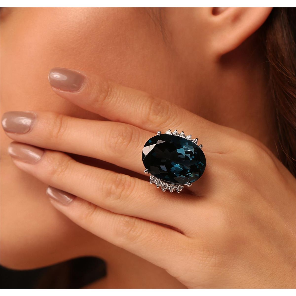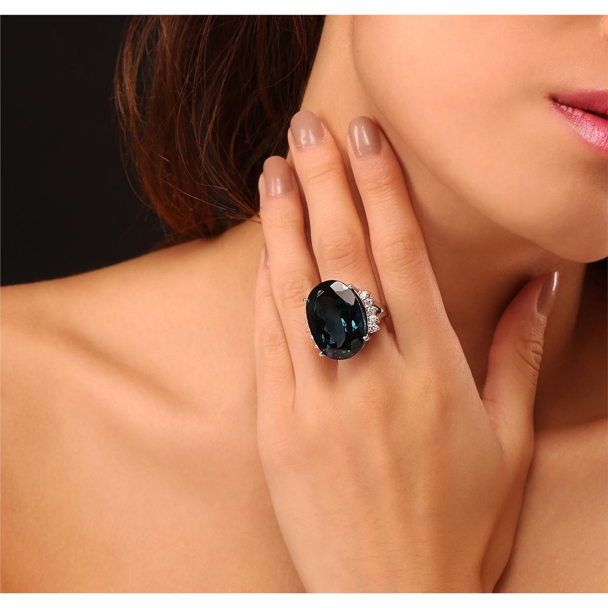 One electronically tested 14KT white gold Ladies cast ring with a bright polish finish. Condition is new. Identified with markings of "K14". Containing: One prong set oval modified brilliant cut natural blue topaz, measuring 25.22 x 18.03 x 12.30mm, approximate weight of 40.61ct., clarity is eye clean, type I, medium light, very slightly grayish, greenish blue color, (GIA gB 4/3), cut is very good. Colored gemstones are presumed to have been subjected to commonly used color/clarity enhancement processes. Ten prong set round brilliant cut diamonds, measuring 3.00 - 3.00 x 1.80mm (depth est.) approximate. Total Weight of 10 Stones = 0.99ct. Clarity: I-1 to I-2. Color: I - J, Cut is Good. Total Weight of Colored Stones 40.61ct. Total Weight of Diamonds 0.99ct. Total Weight of Ring 19.80 Grams. GGL Appraised at $9,435.00.